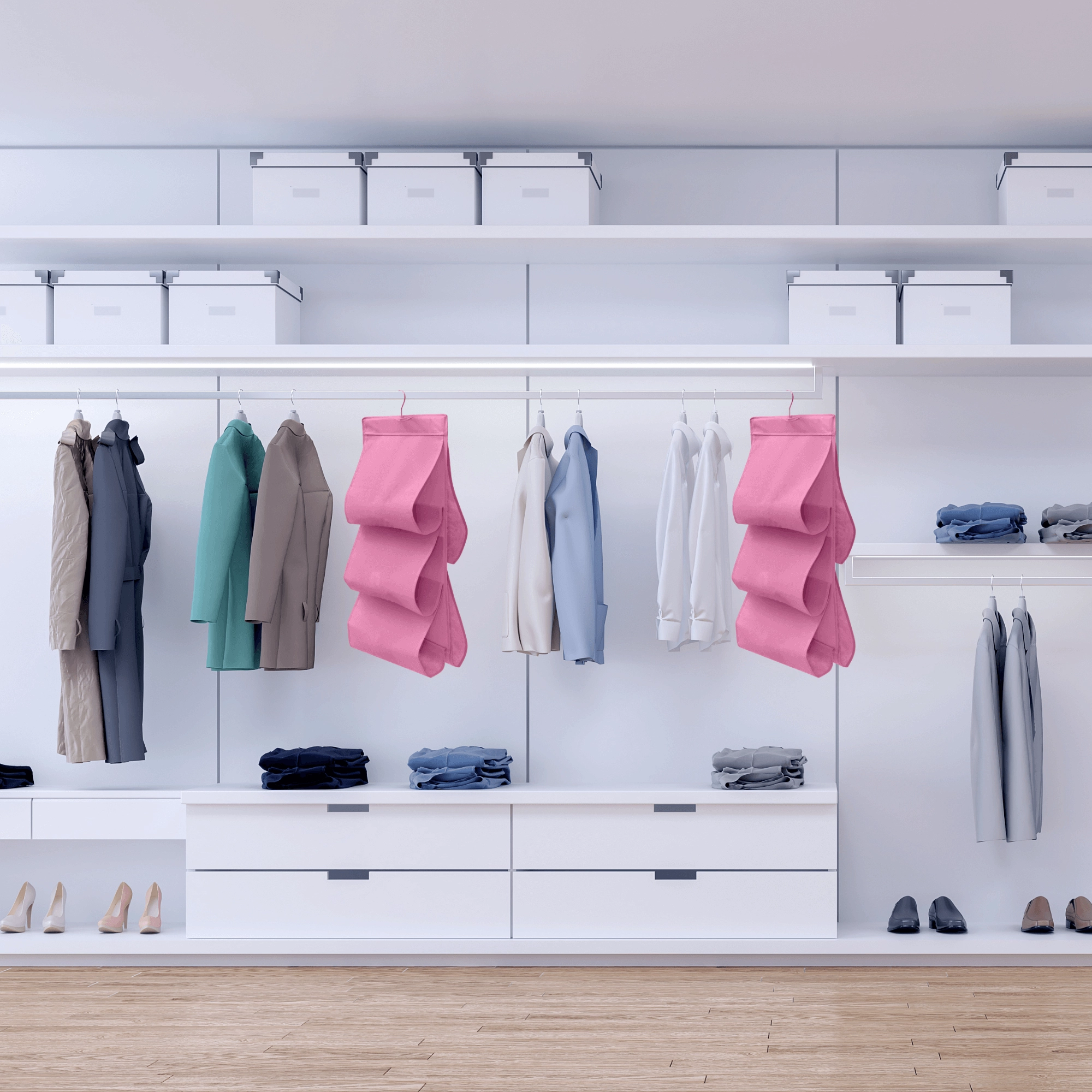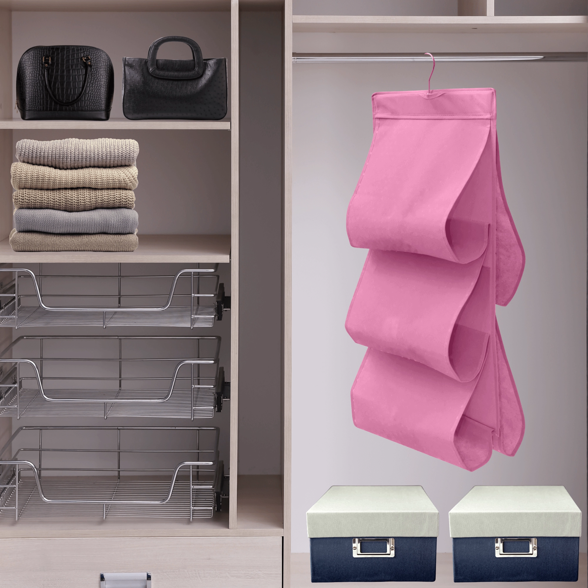 Wygodnie przechowasz torebki, szale, paski oraz drobną odzież. Każda przegroda trzyma kształt i zapewnia dobrą dostępność.