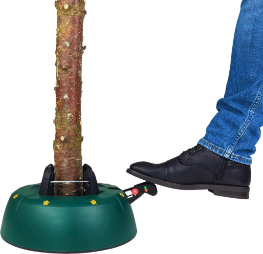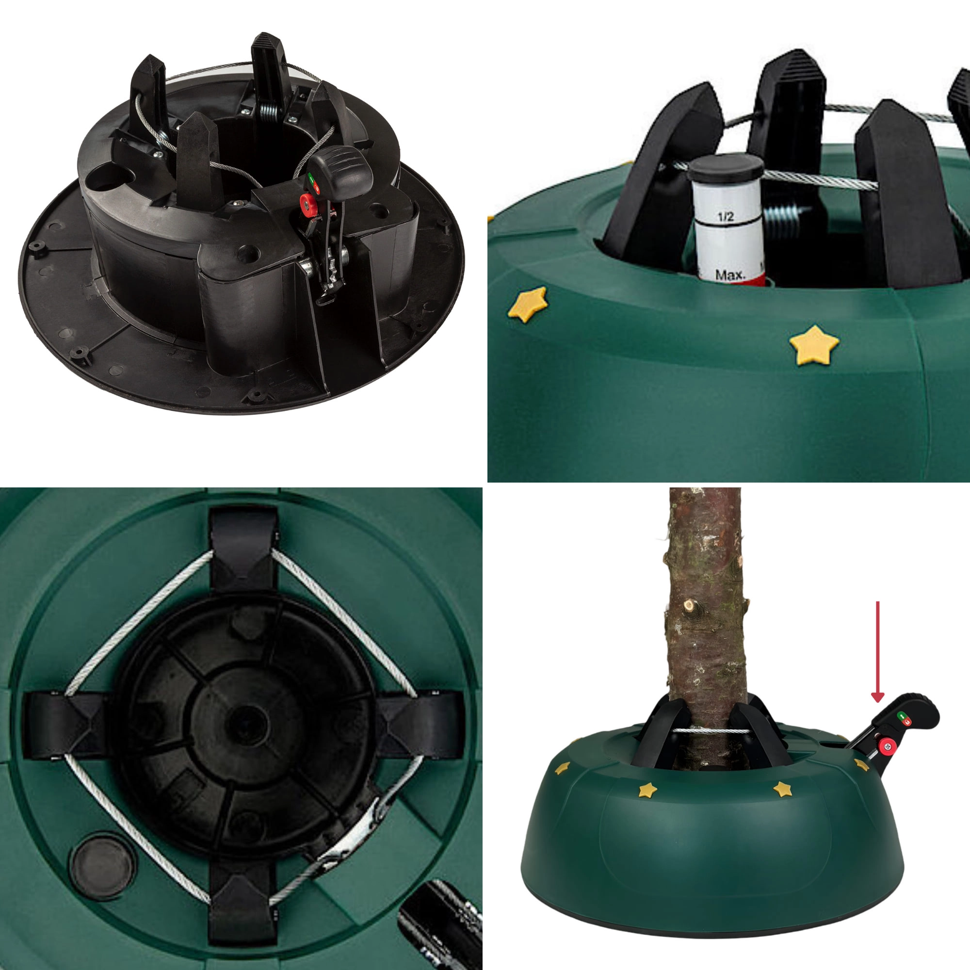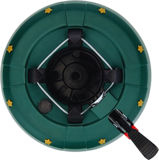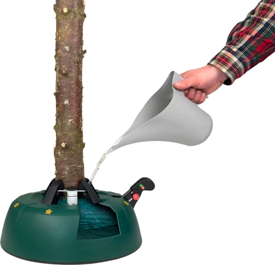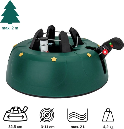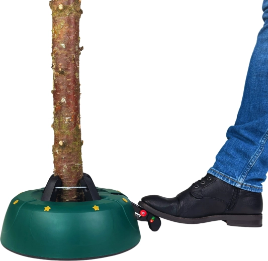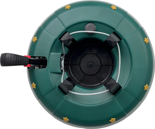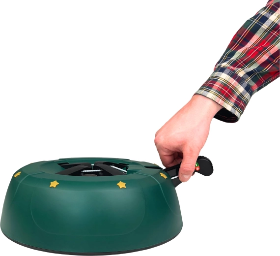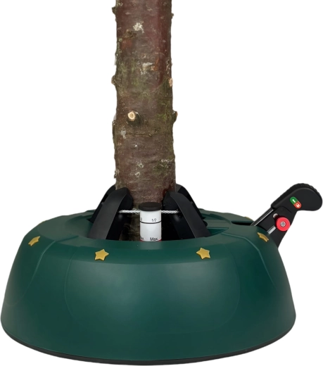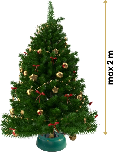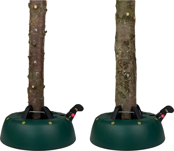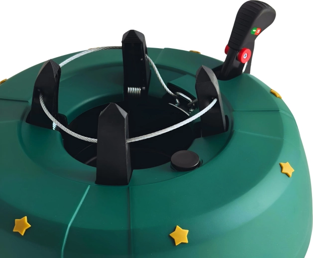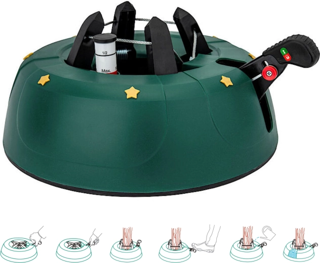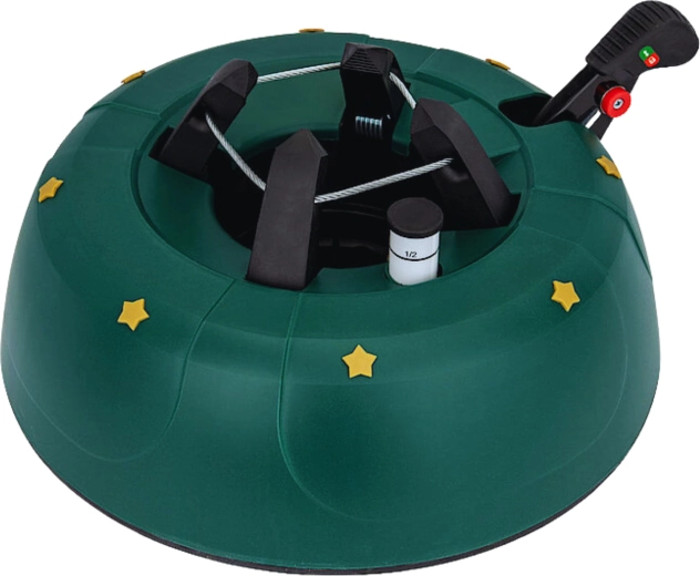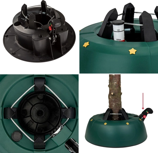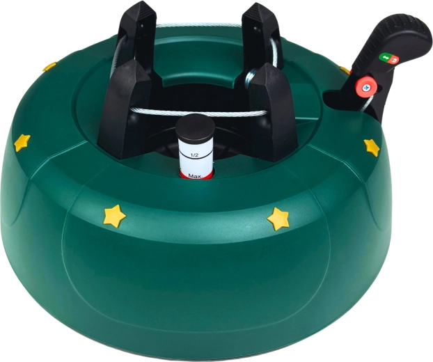 Innowacyjny system z jedną linką i czterema automatycznie zaciskającymi się hakami obejmuje pień (3–11 cm) bez konieczności śrubowania. Dźwignia sterująca z blokadą bezpieczeństwa zapobiega przypadkowemu poluzowaniu, a czytelny wskaznik poziomu wody ułatwia dolewanie. Eleganckie zielone wykończenie ze złotymi gwiazdami doskonale wpisze się w świąteczny wystrój.