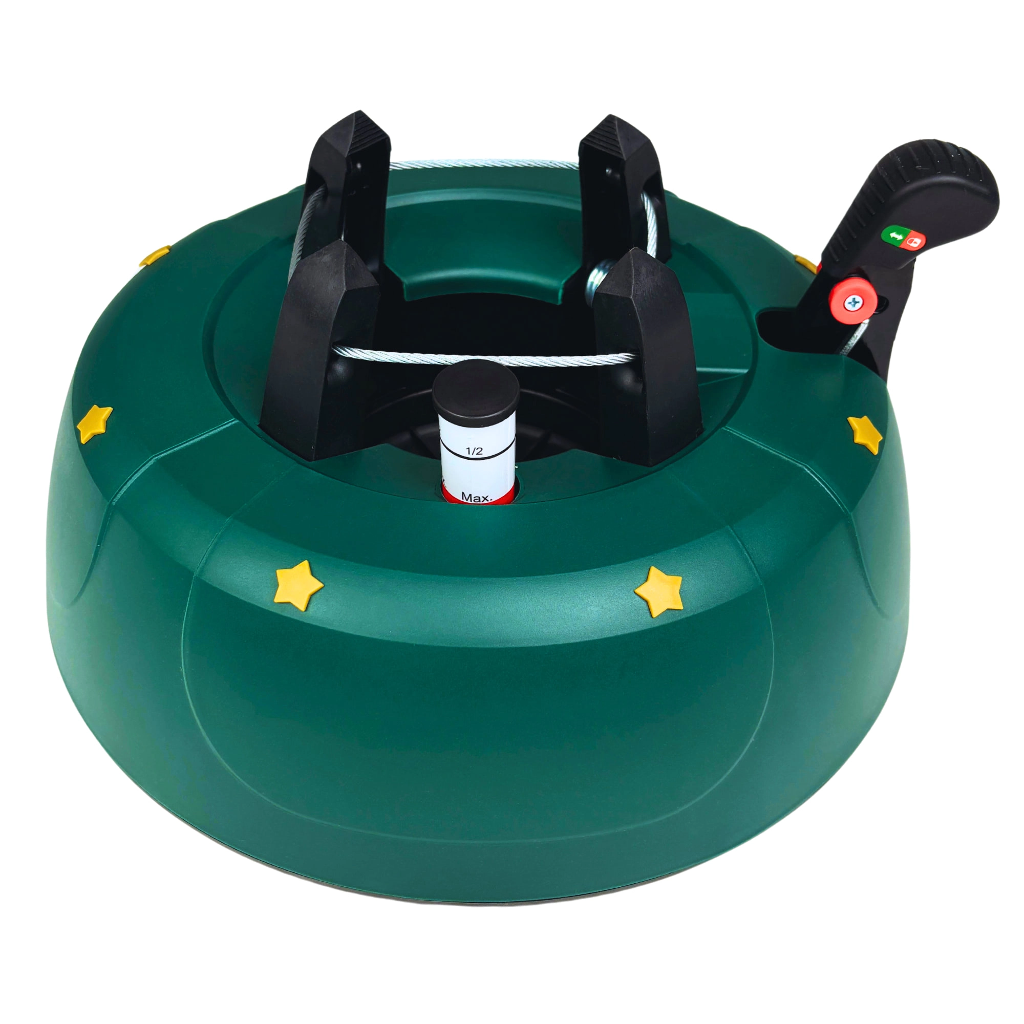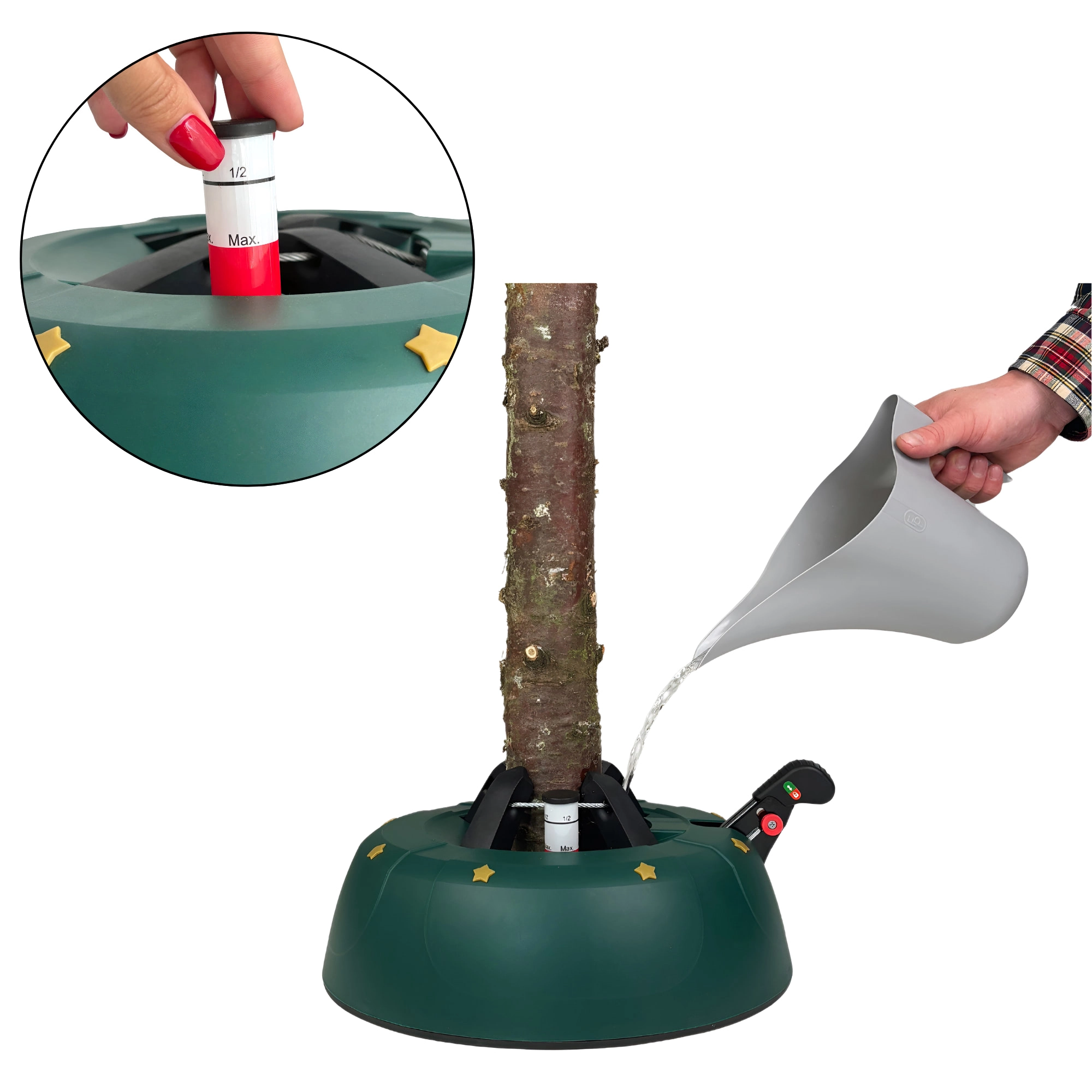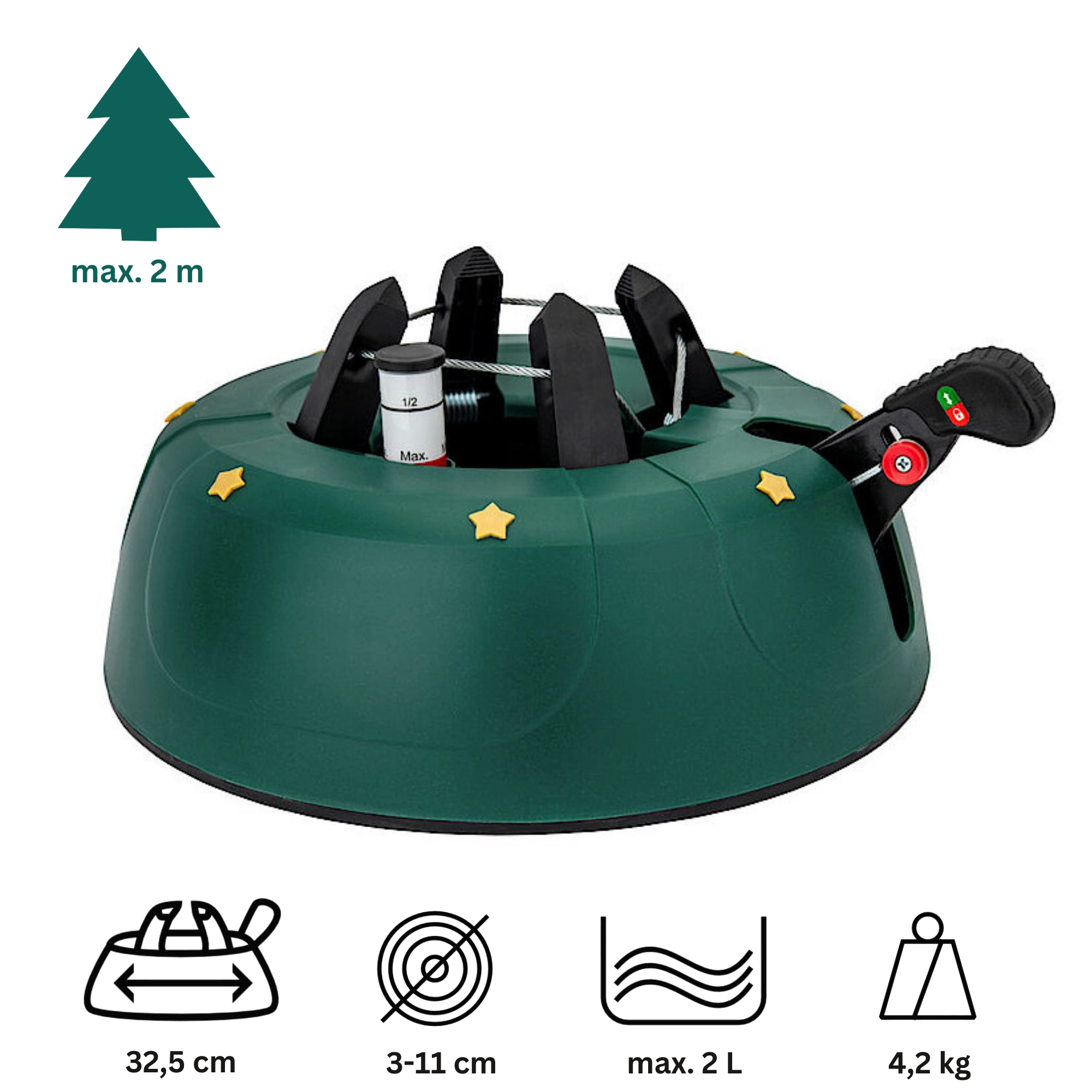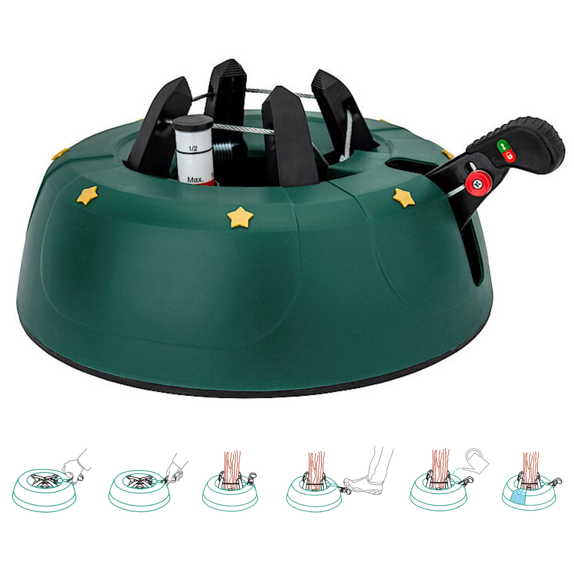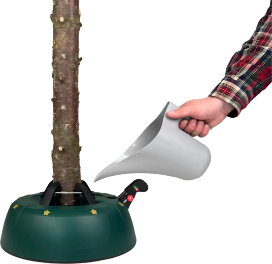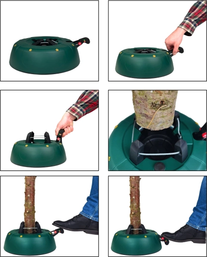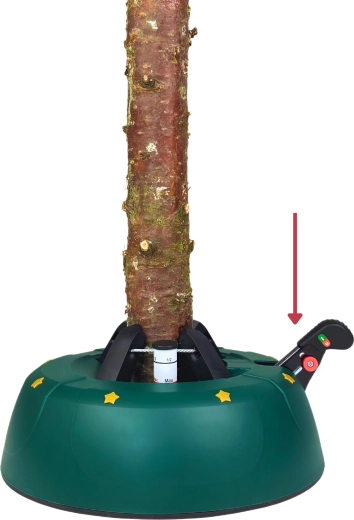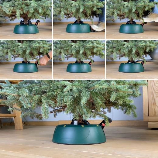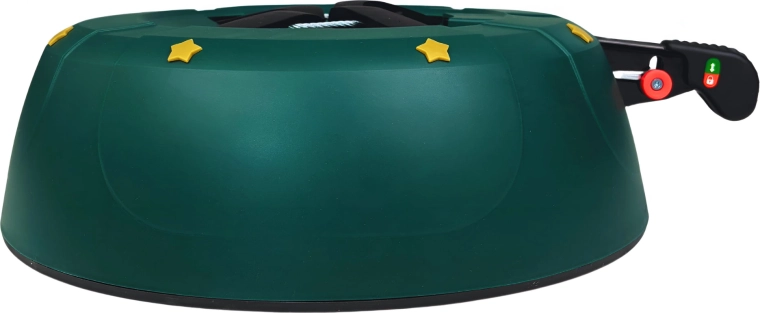 Innowacyjny system z jedną linką i czterema automatycznie zaciskającymi się hakami obejmuje pień (3–11 cm) bez konieczności śrubowania. Dźwignia sterująca z blokadą bezpieczeństwa zapobiega przypadkowemu poluzowaniu, a czytelny wskaznik poziomu wody ułatwia dolewanie. Eleganckie zielone wykończenie ze złotymi gwiazdami doskonale wpisze się w świąteczny wystrój.
