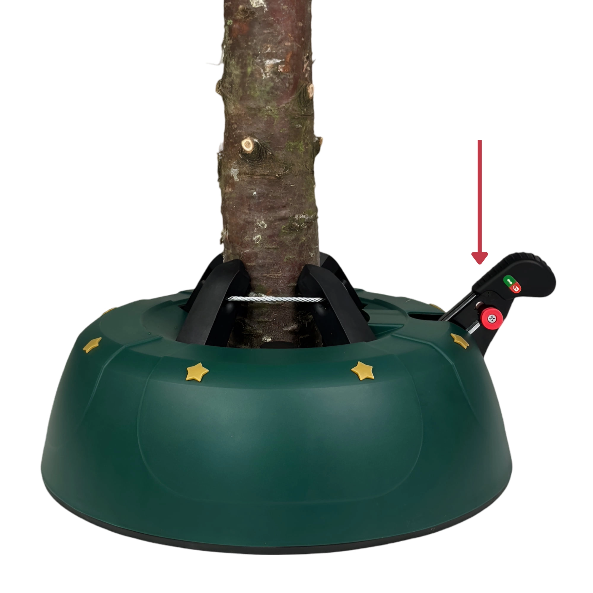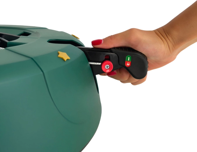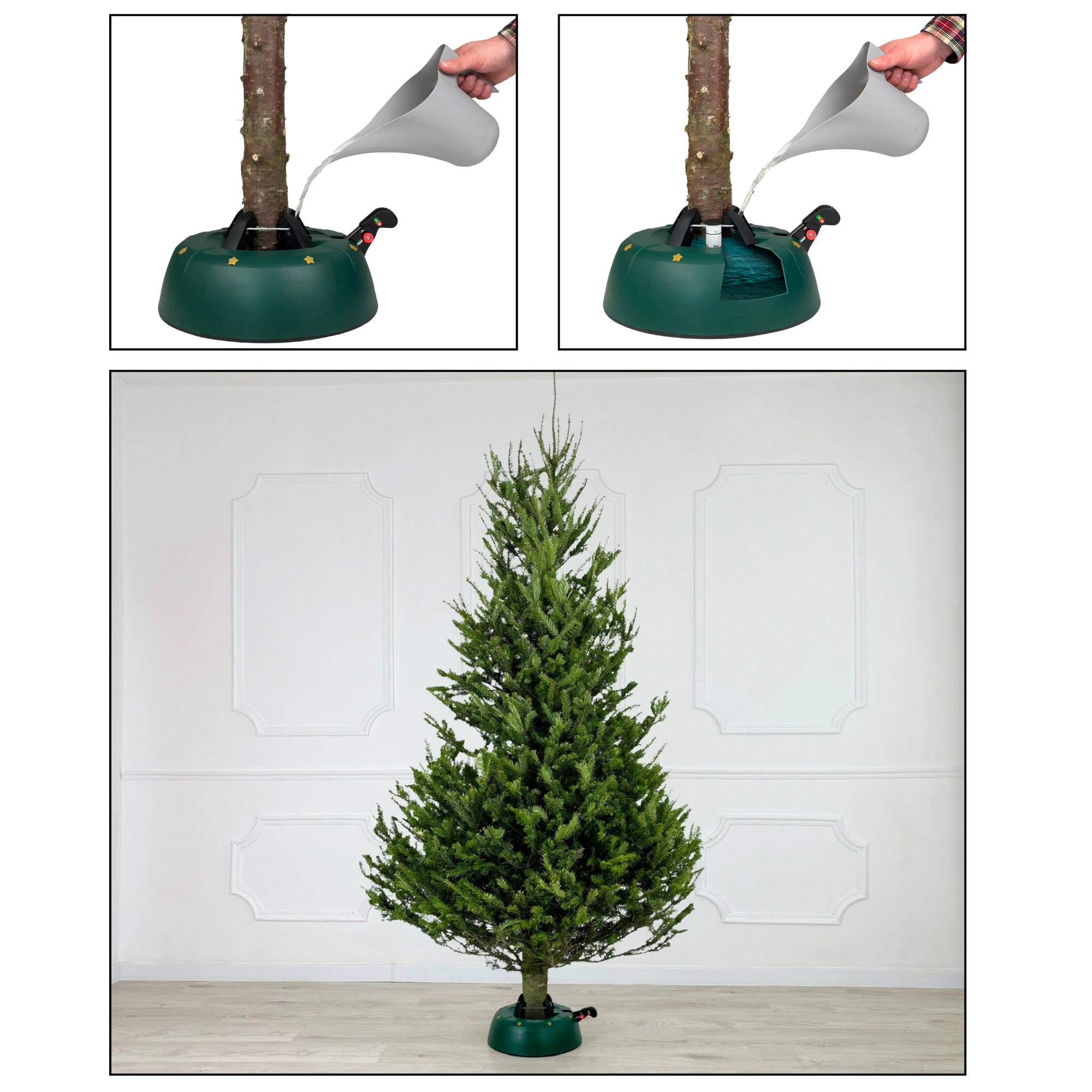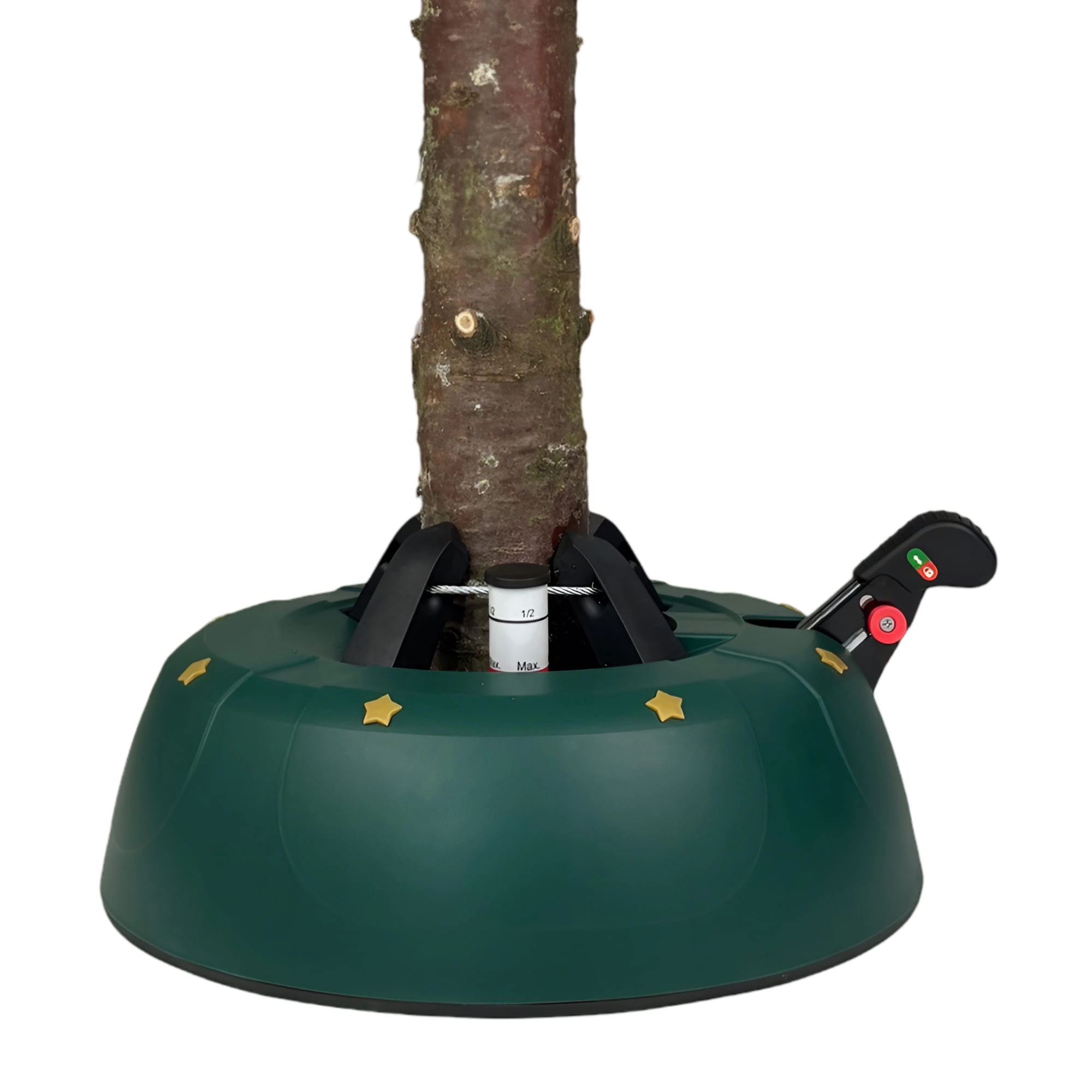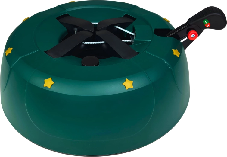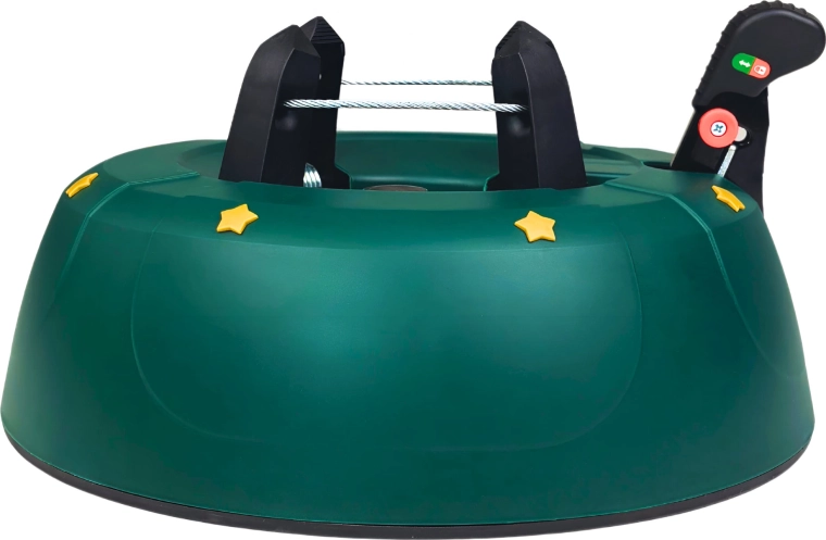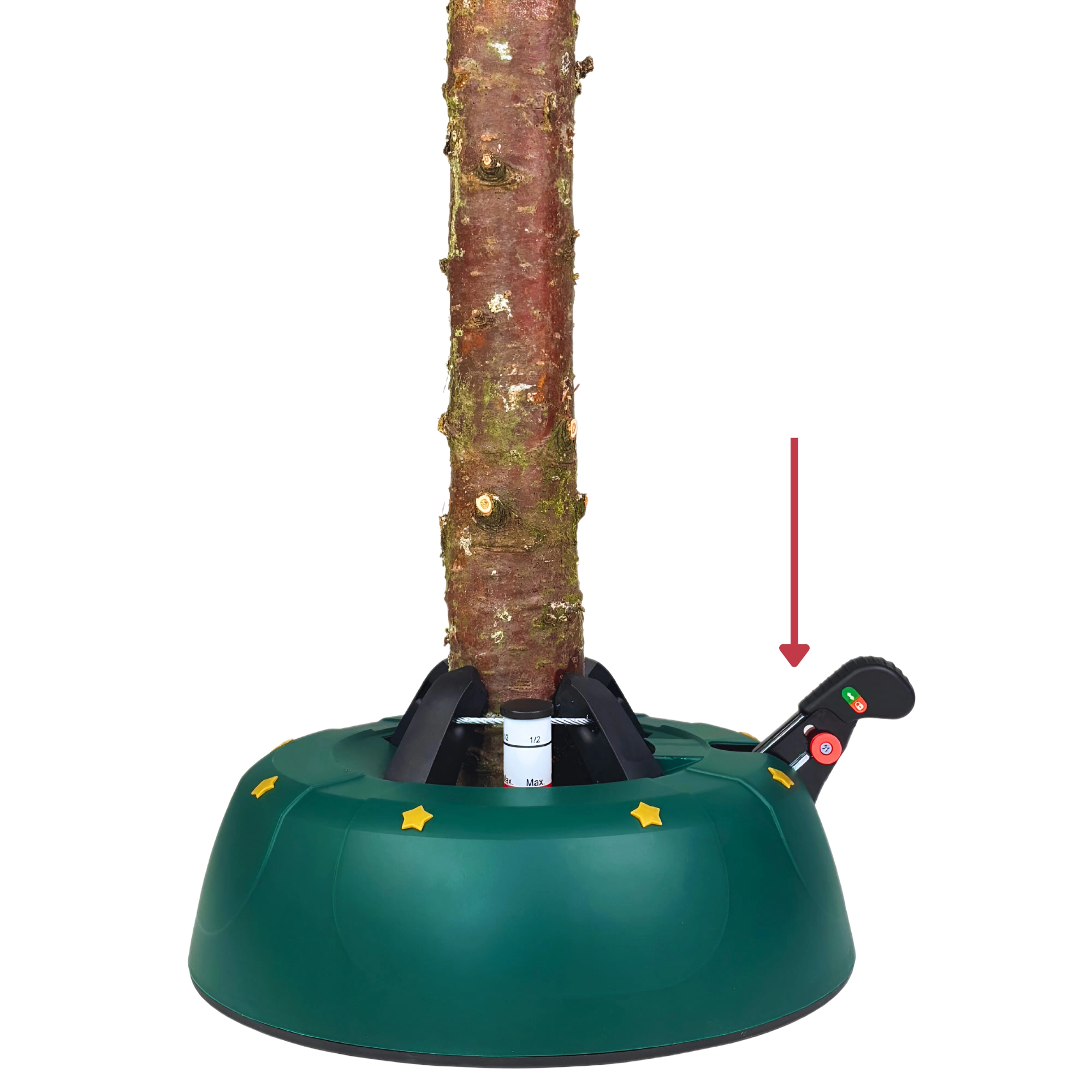 Innowacyjny system z jedną linką i czterema automatycznie zaciskającymi się hakami obejmuje pień (3–11 cm) bez konieczności śrubowania. Dźwignia sterująca z blokadą bezpieczeństwa zapobiega przypadkowemu poluzowaniu, a czytelny wskaznik poziomu wody ułatwia dolewanie. Eleganckie zielone wykończenie ze złotymi gwiazdami doskonale wpisze się w świąteczny wystrój.