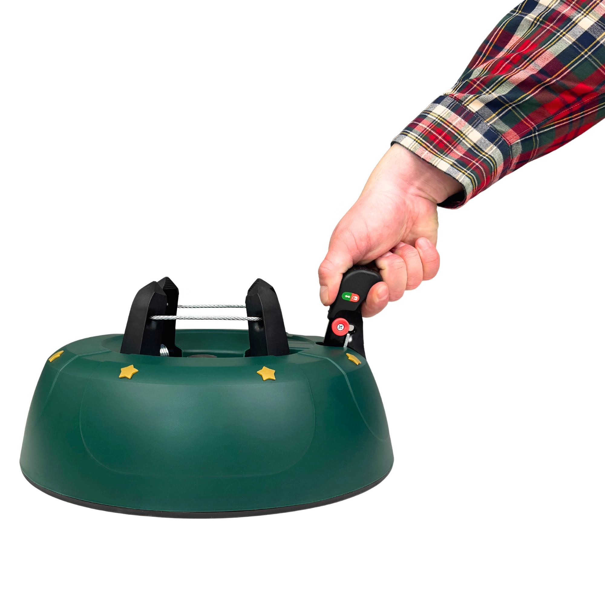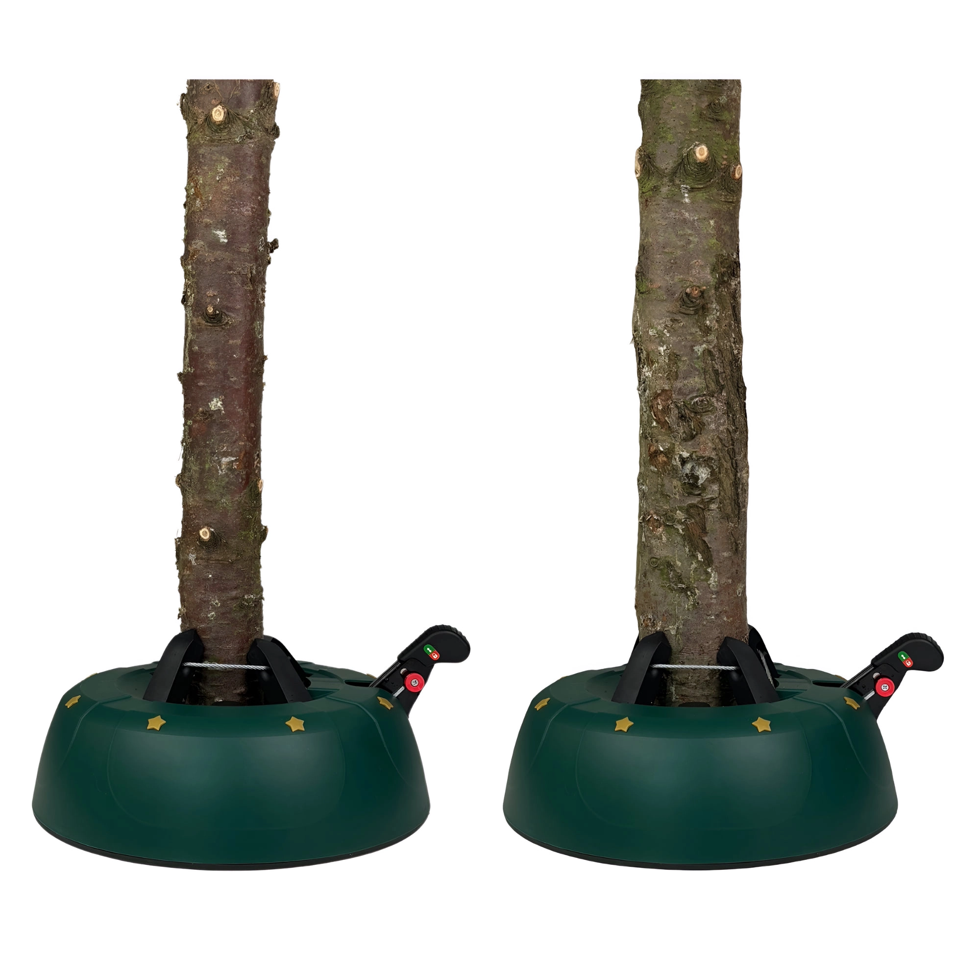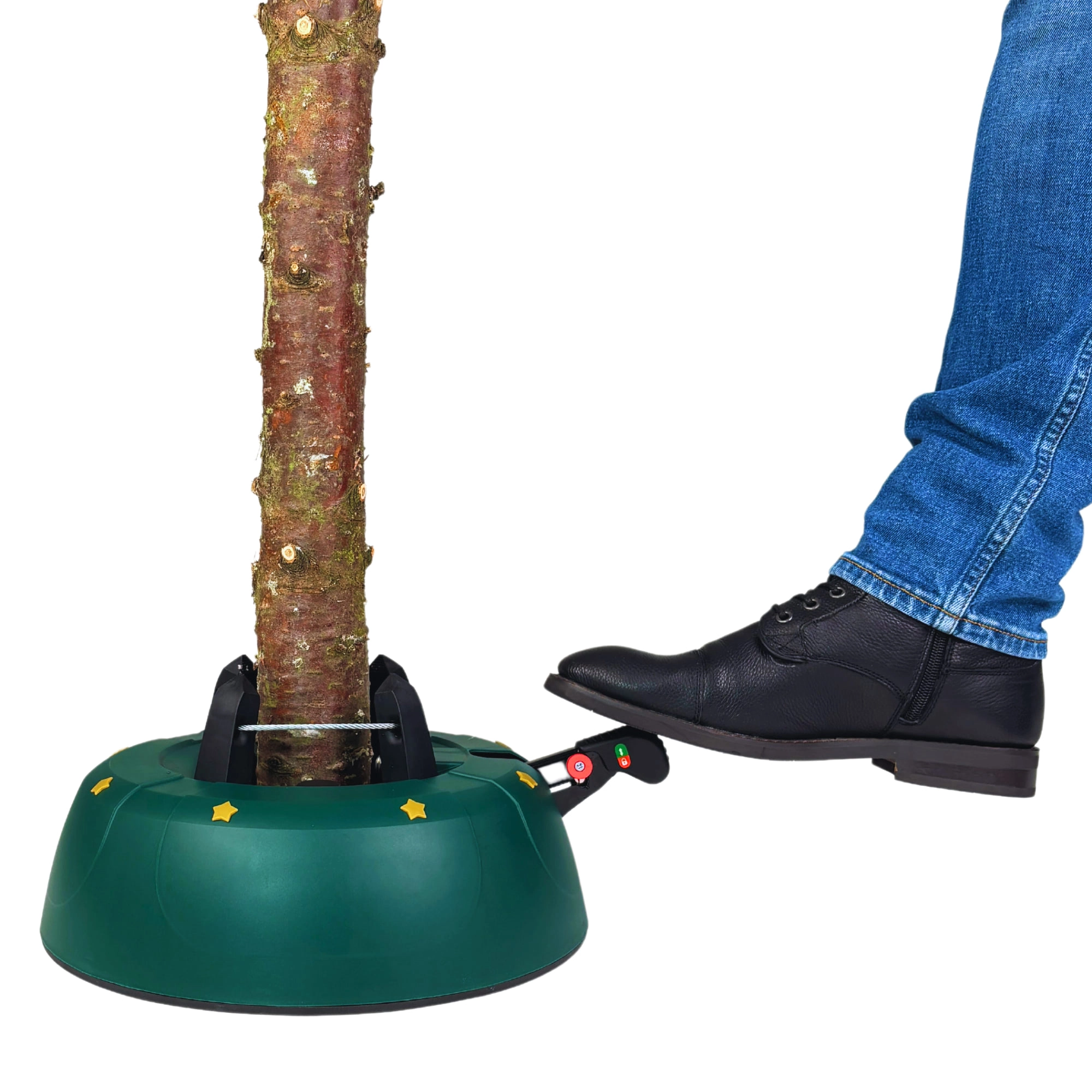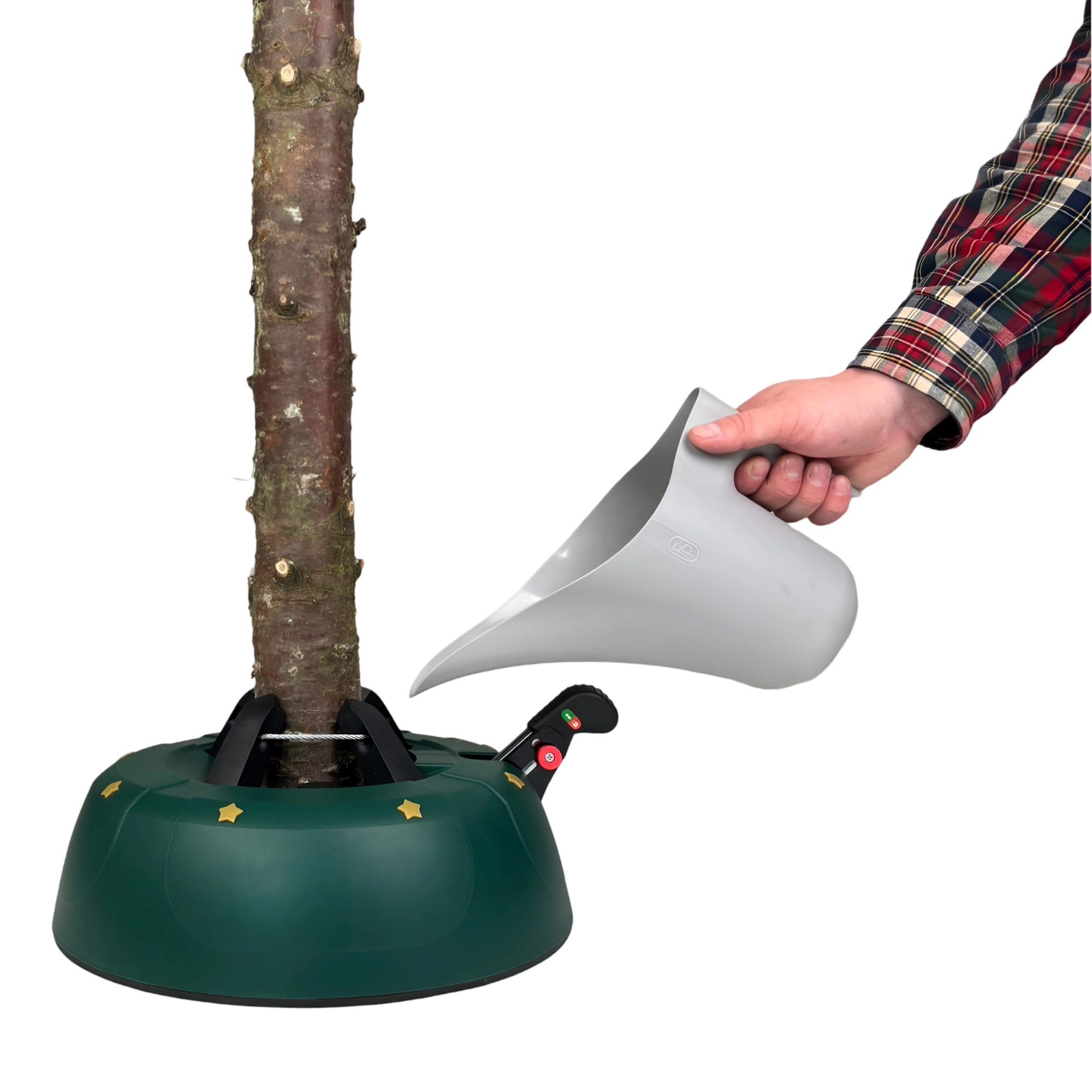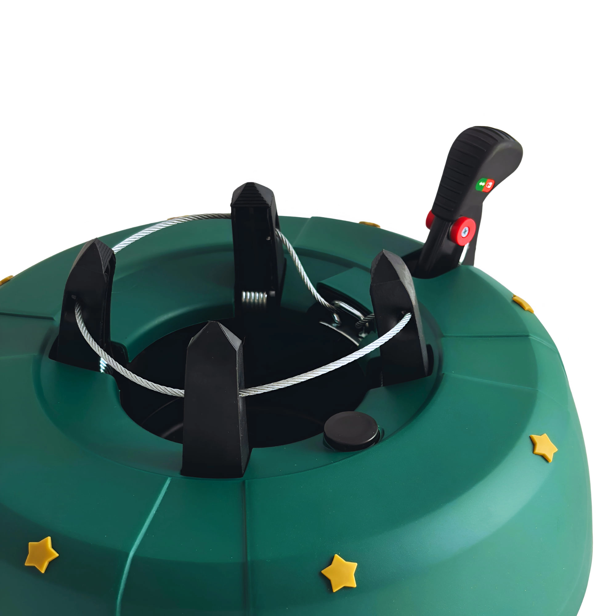 Innowacyjny system z jedną linką i czterema automatycznie zaciskającymi się hakami obejmuje pień (3–11 cm) bez konieczności śrubowania. Dźwignia sterująca z blokadą bezpieczeństwa zapobiega przypadkowemu poluzowaniu, a czytelny wskaznik poziomu wody ułatwia dolewanie. Eleganckie zielone wykończenie ze złotymi gwiazdami doskonale wpisze się w świąteczny wystrój.