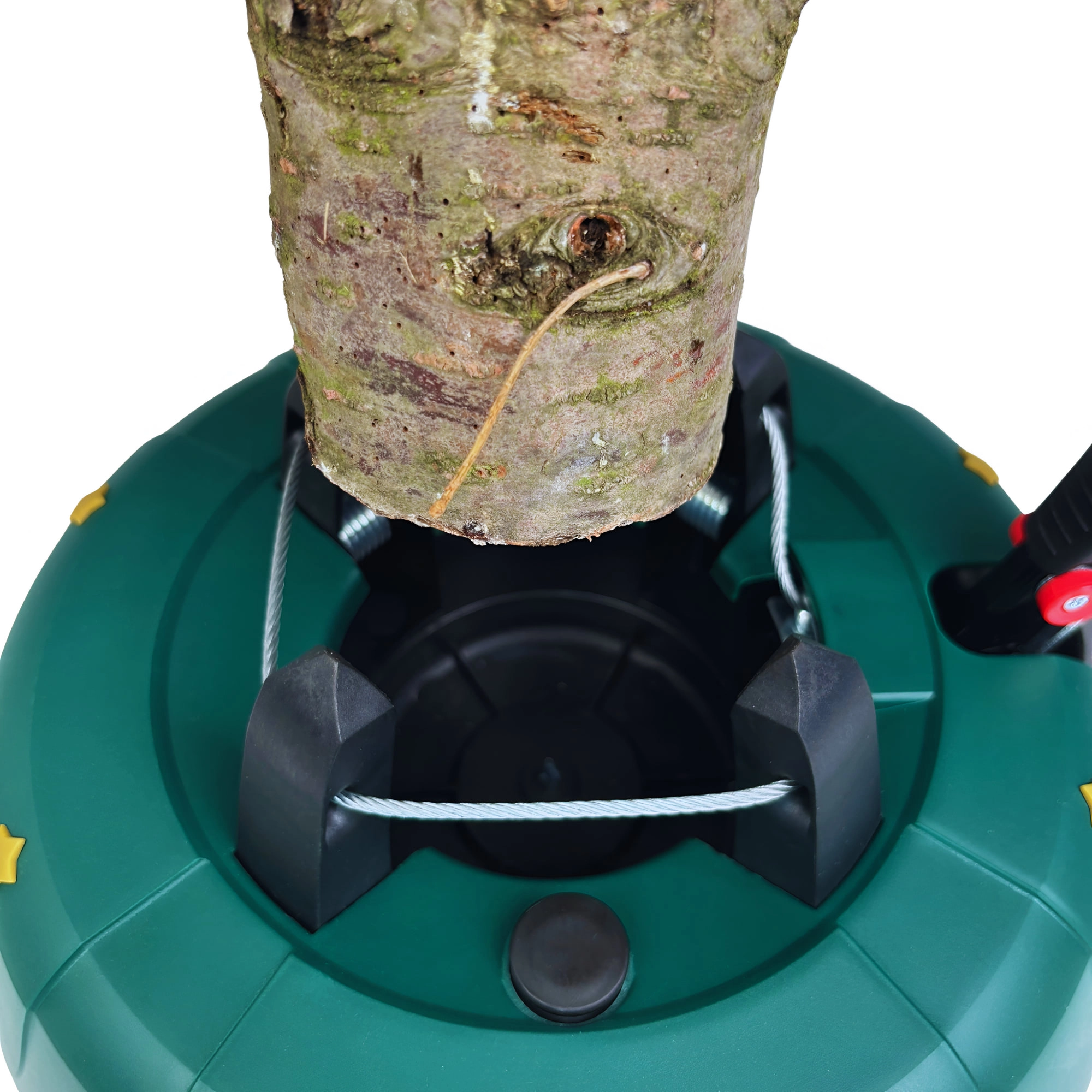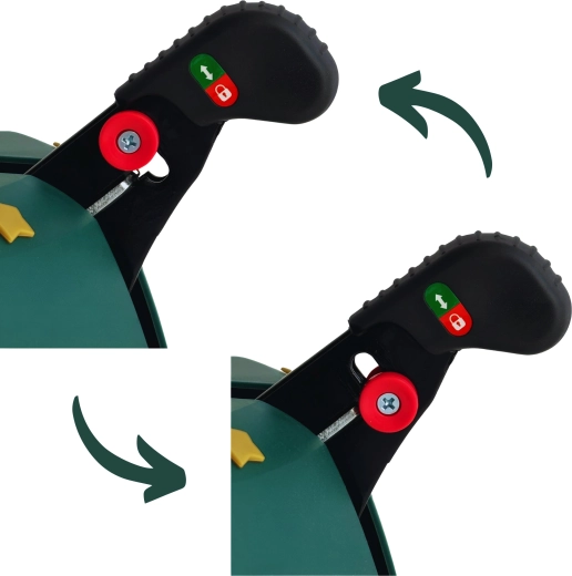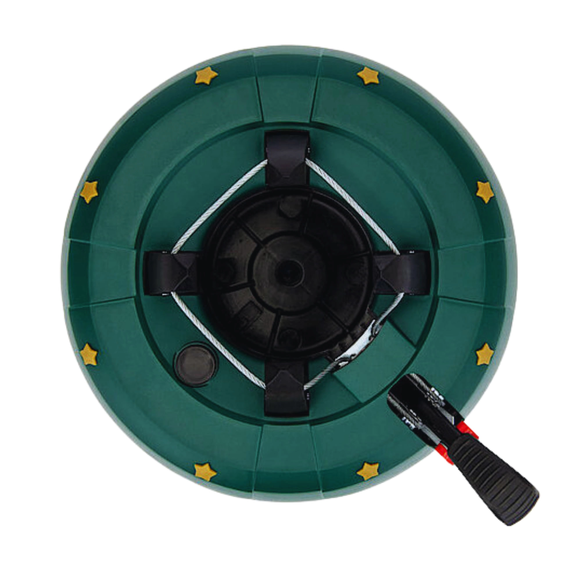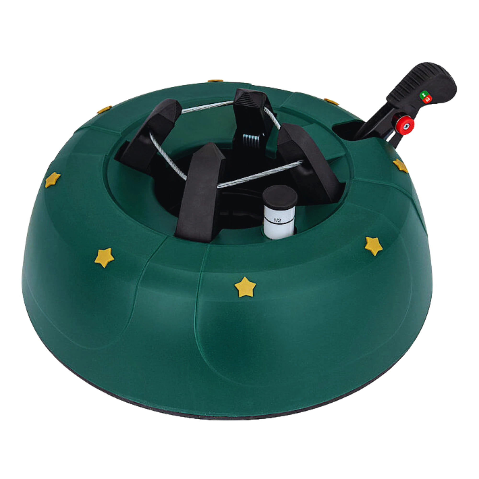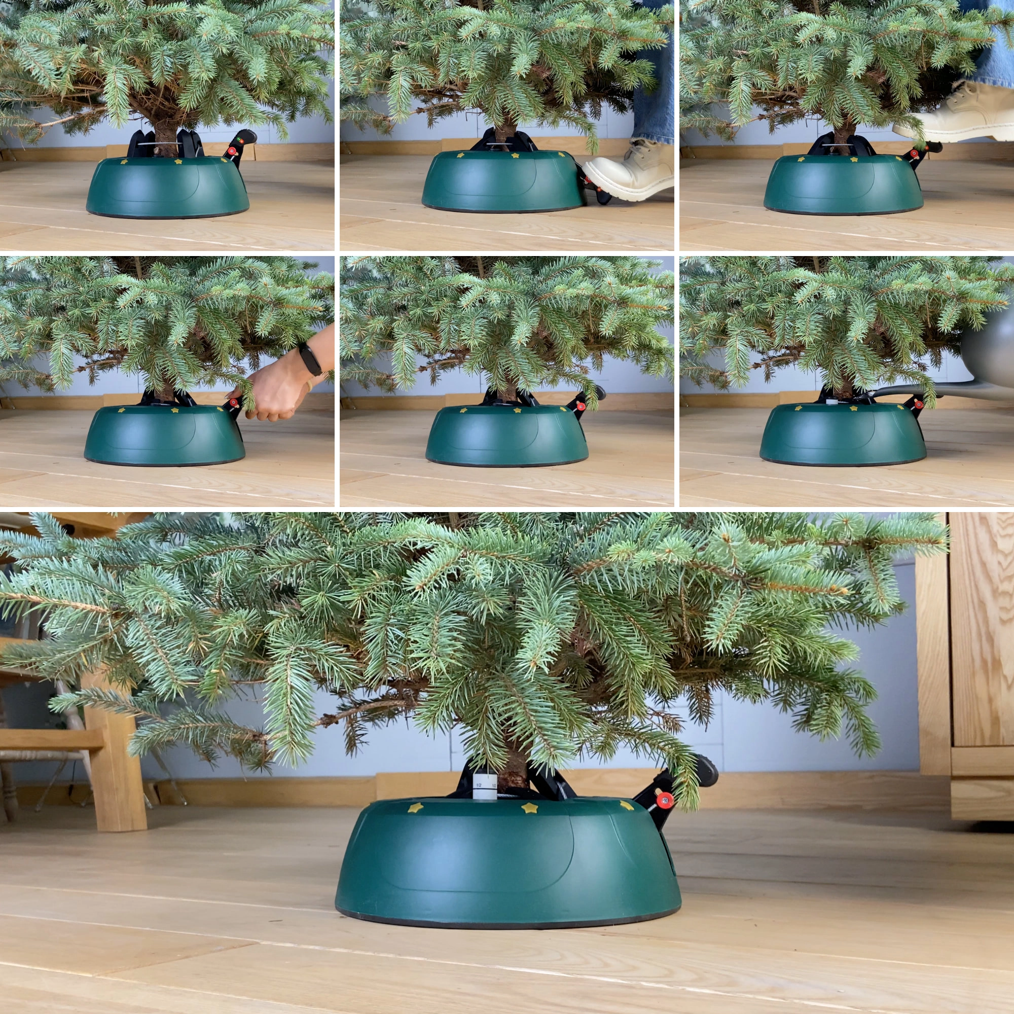 Innowacyjny system z jedną linką i czterema automatycznie zaciskającymi się hakami obejmuje pień (3–11 cm) bez konieczności śrubowania. Dźwignia sterująca z blokadą bezpieczeństwa zapobiega przypadkowemu poluzowaniu, a czytelny wskaznik poziomu wody ułatwia dolewanie. Eleganckie zielone wykończenie ze złotymi gwiazdami doskonale wpisze się w świąteczny wystrój.