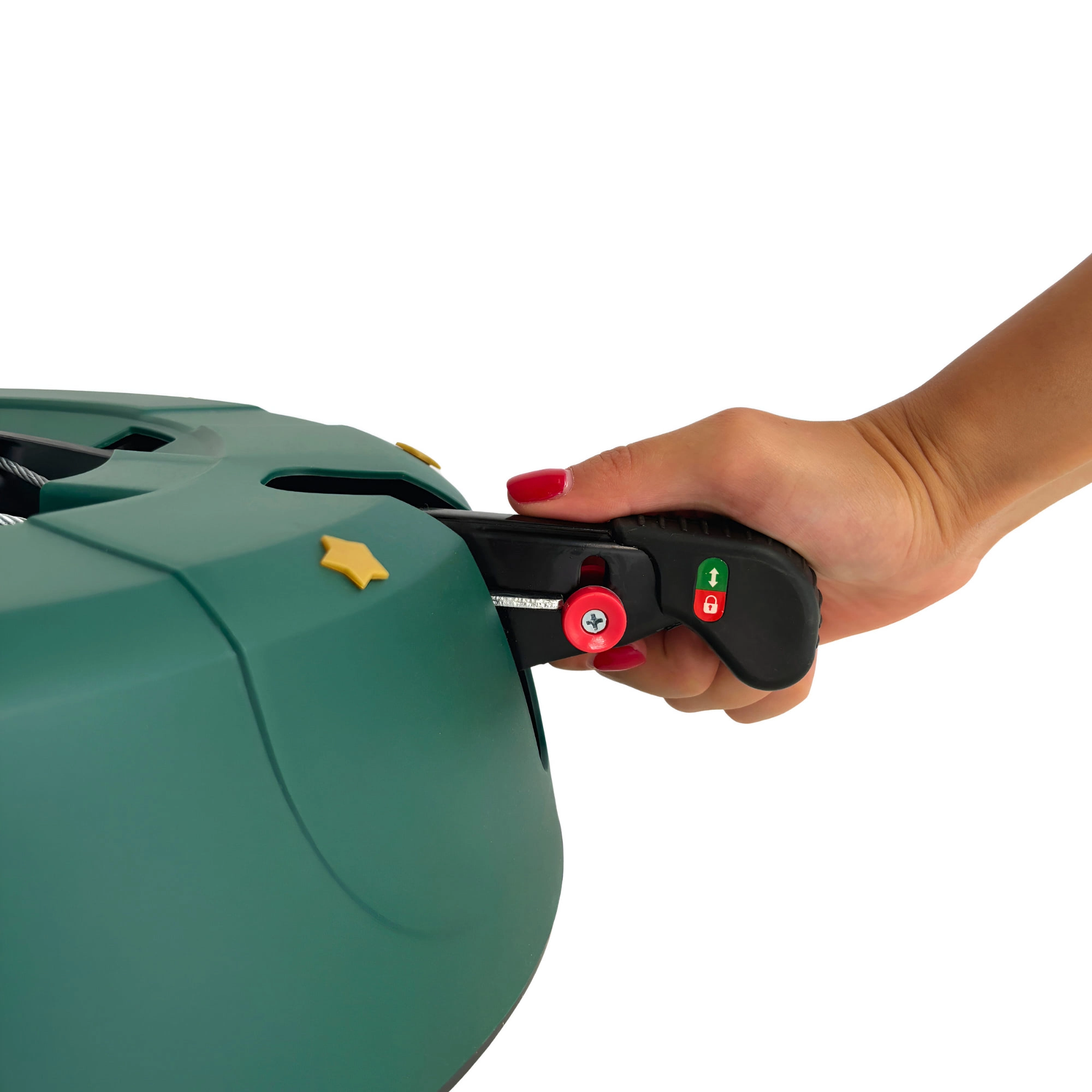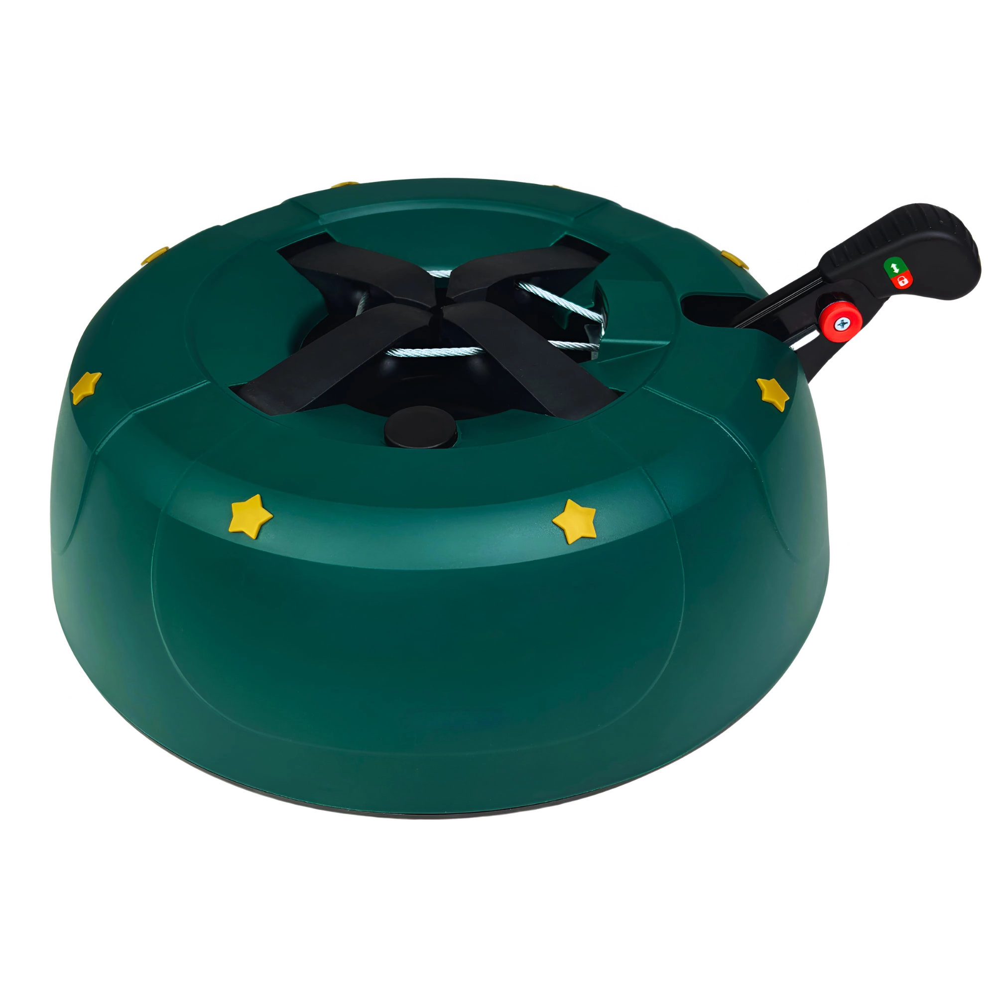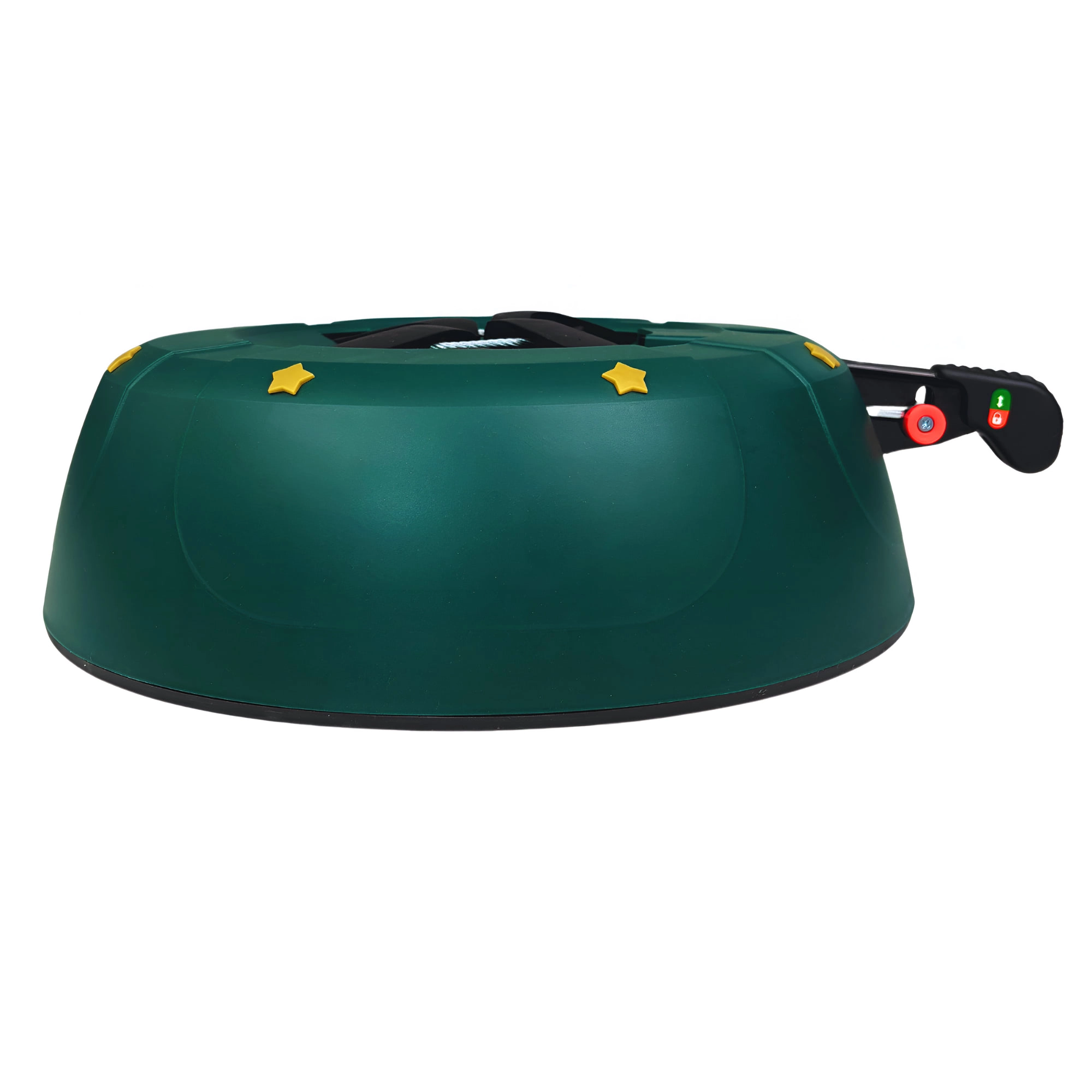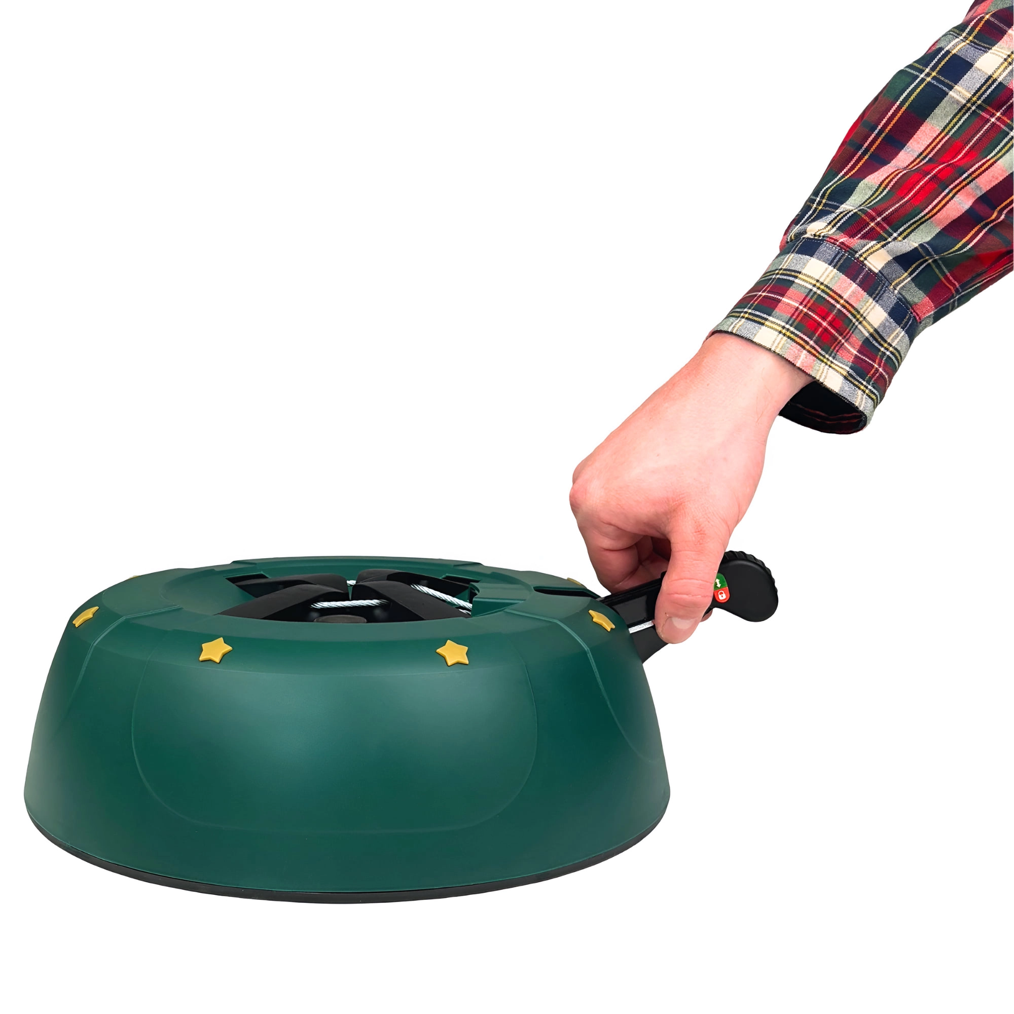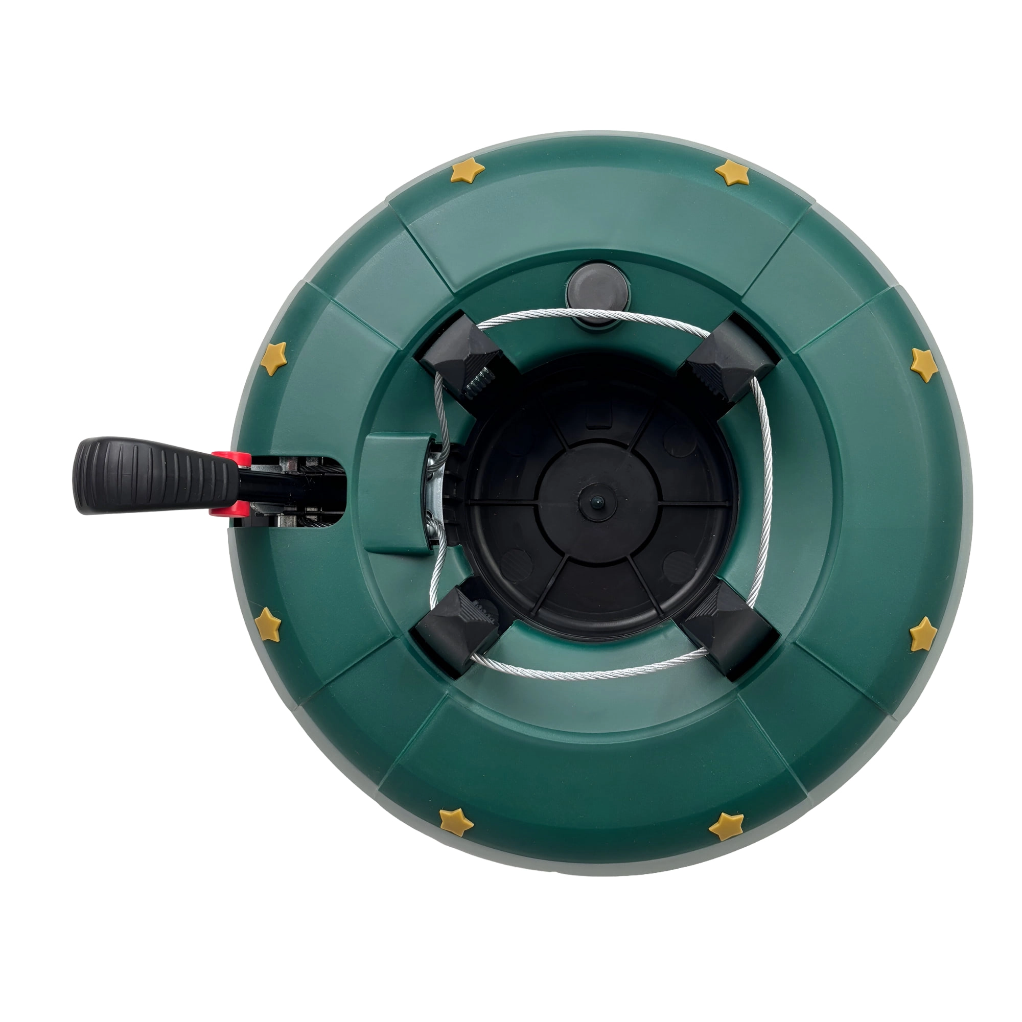 Innowacyjny system z jedną linką i czterema automatycznie zaciskającymi się hakami obejmuje pień (3–11 cm) bez konieczności śrubowania. Dźwignia sterująca z blokadą bezpieczeństwa zapobiega przypadkowemu poluzowaniu, a czytelny wskaznik poziomu wody ułatwia dolewanie. Eleganckie zielone wykończenie ze złotymi gwiazdami doskonale wpisze się w świąteczny wystrój.