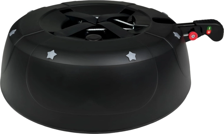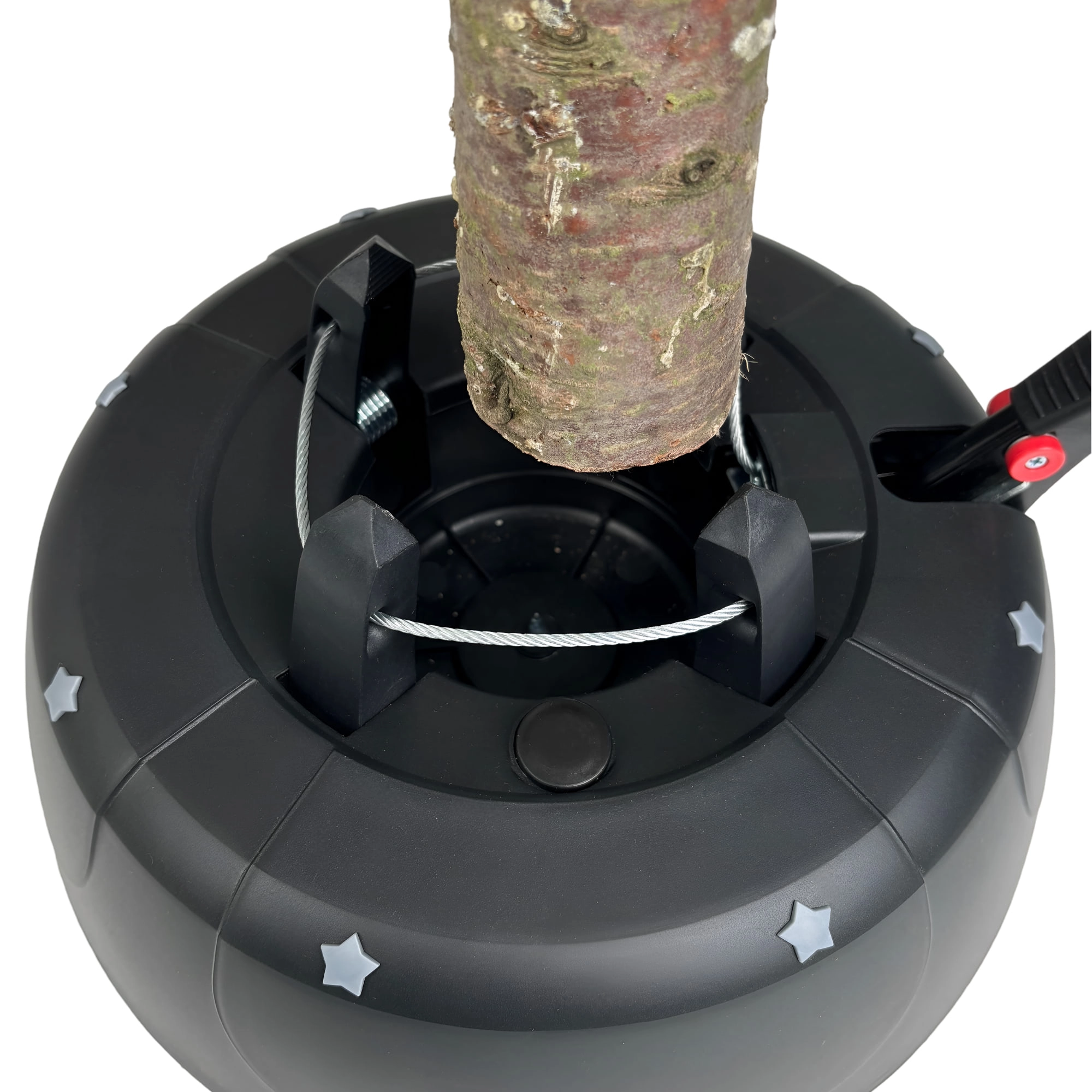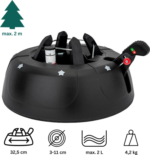 Wytrzymały stojak na choinkę z automatycznym stalowym zaciskiem, zintegrowanym zbiornikiem na wodę 2 l i wskaznikiem poziomu. Stabilna podstawa (4,2 kg, średnica 34 cm) bezpiecznie utrzyma żywe drzewko do wysokości 2 m i z pniem 3–11 cm. Elegancki antracyt z gwiazdkami doskonale wpisze się w świąteczny wystrój.