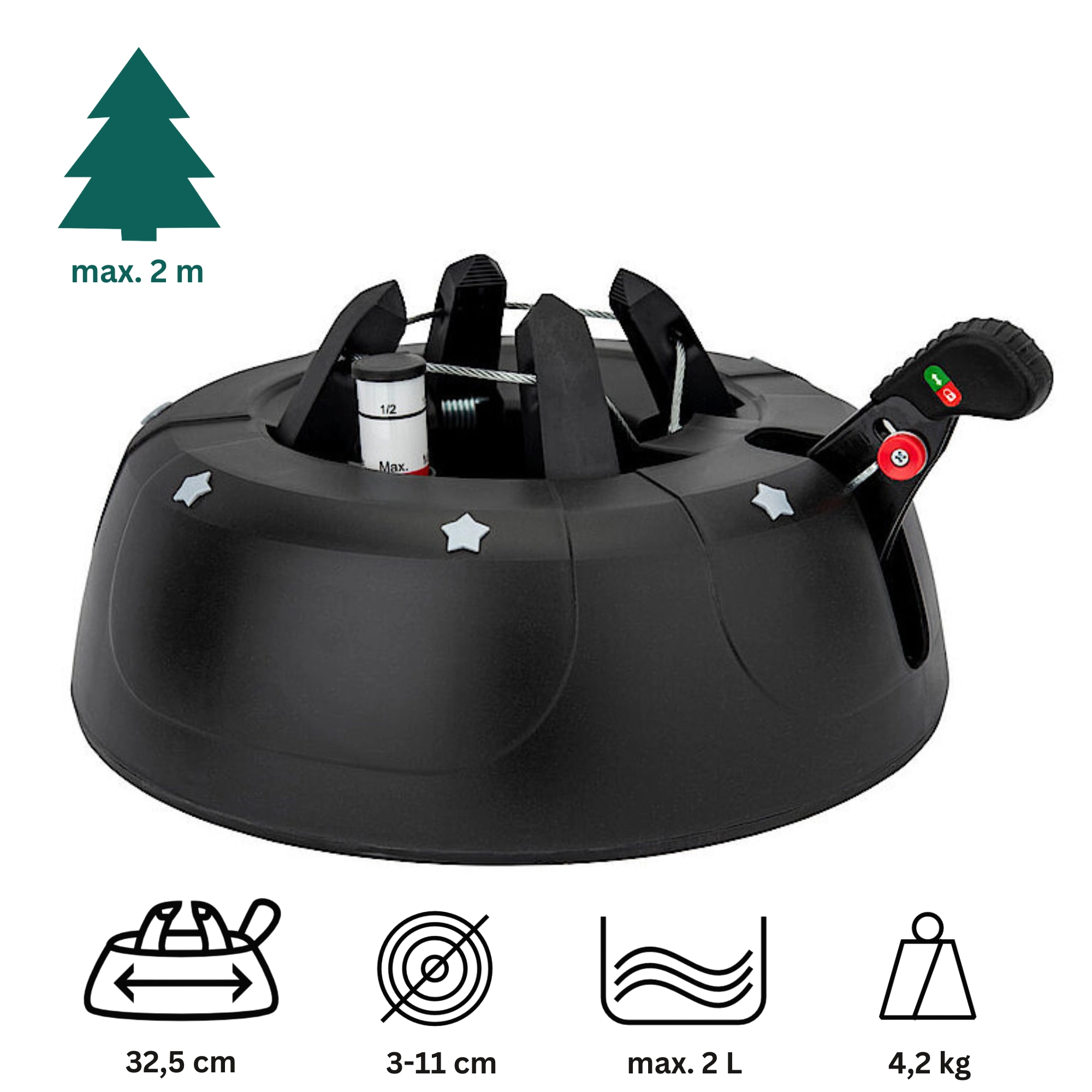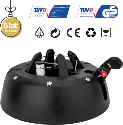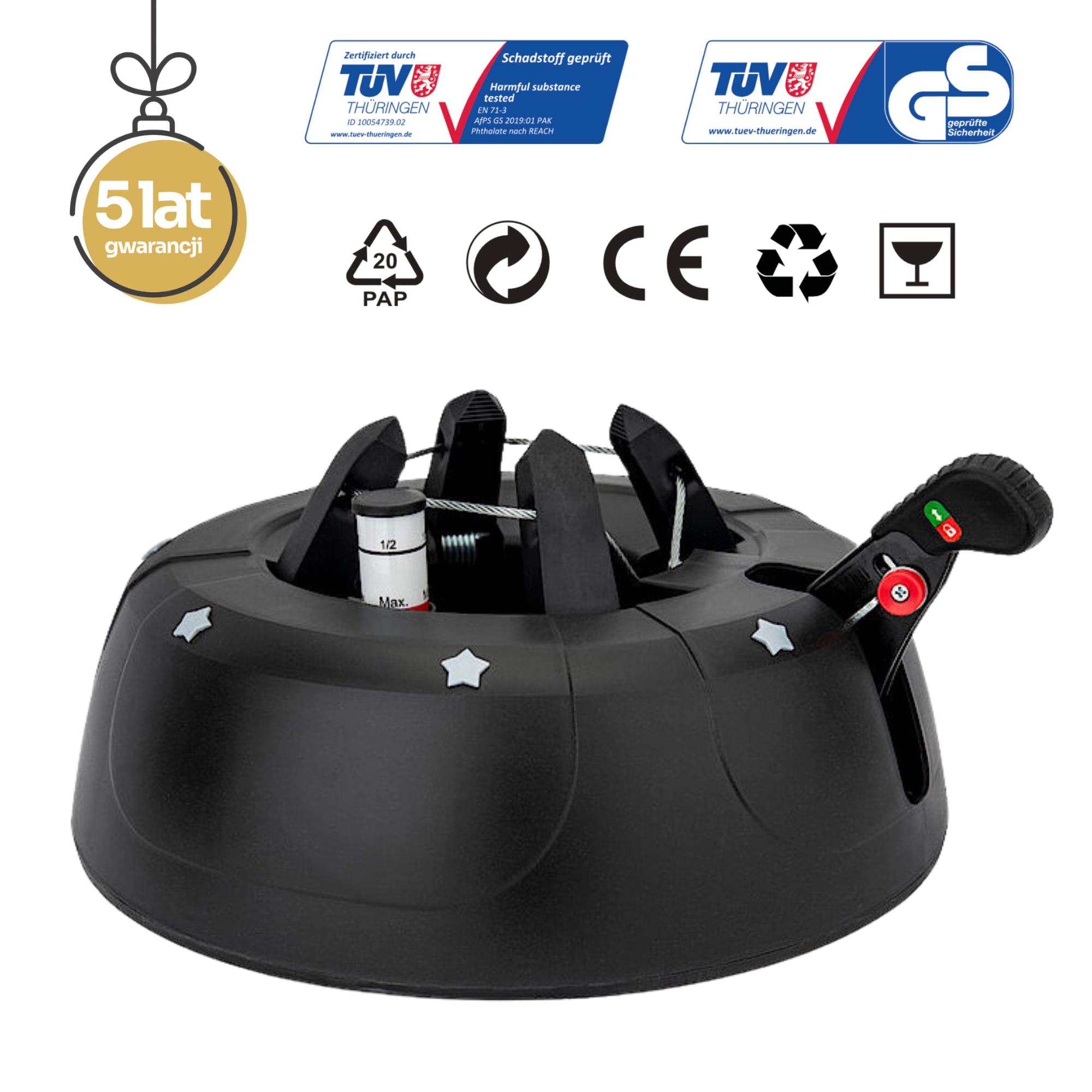 Szeroka i ciężka podstawa (4,2 kg, średnica 34 cm) zapewnia pewne mocowanie drzewka do wysokości 2 m oraz wygodne użytkowanie w święta.