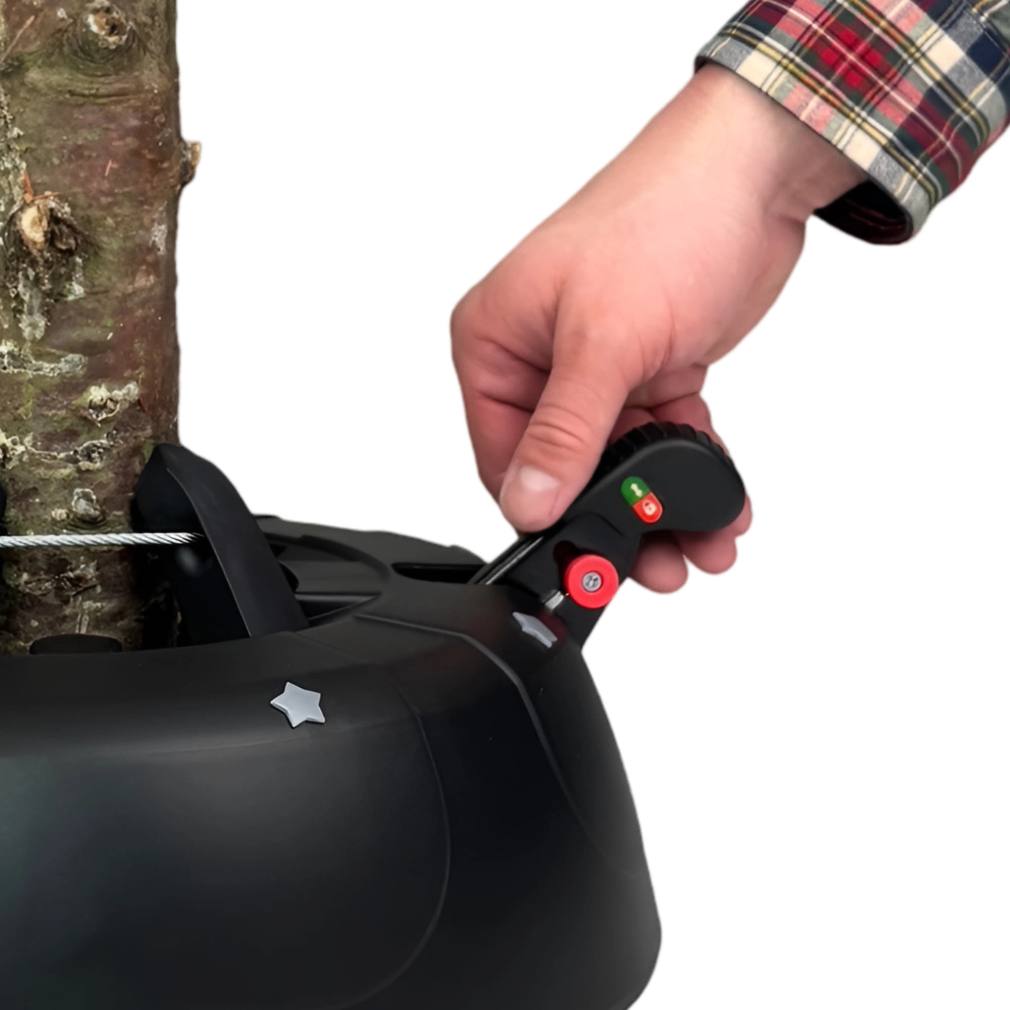 Opatentowany system czterech haczyków z wytrzymałej stali szybko i pewnie obejmuje pień o średnicy 3–11 cm – bez skomplikowanego dokręcania.