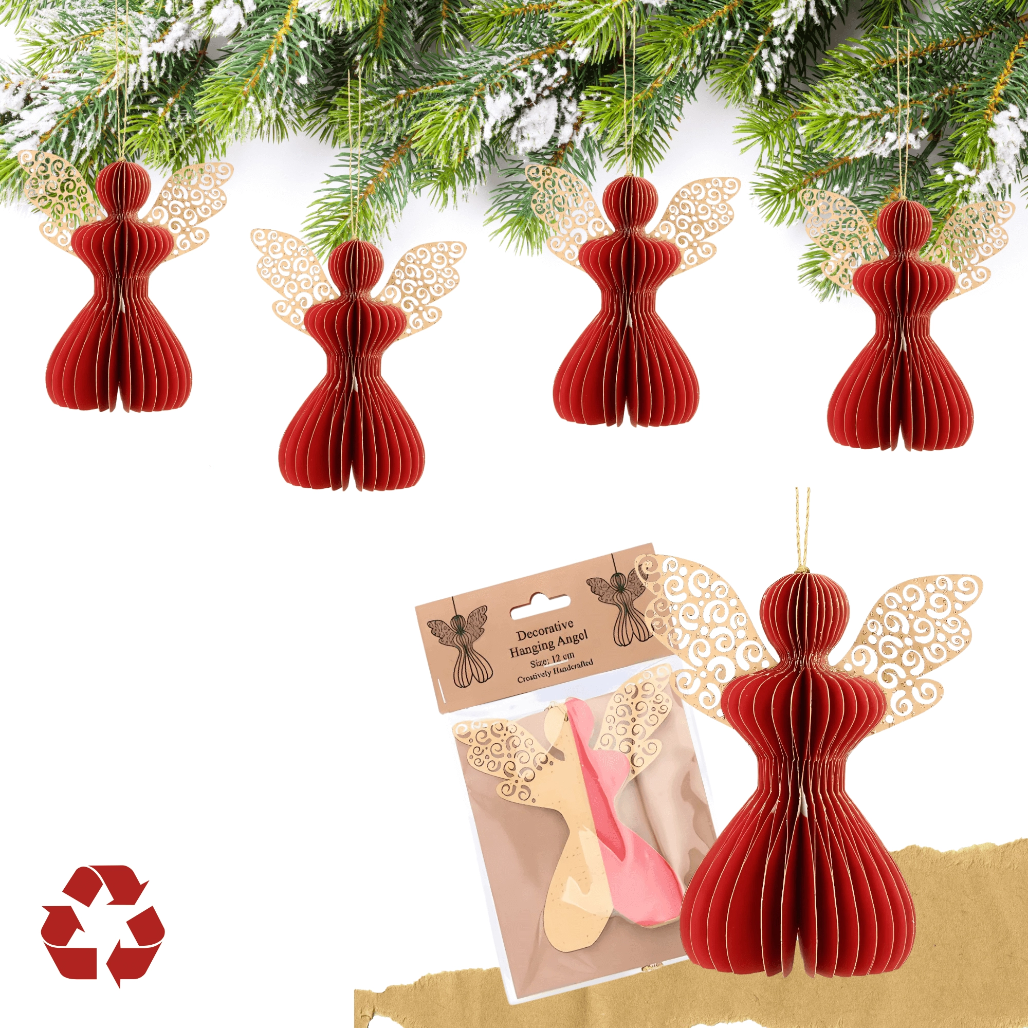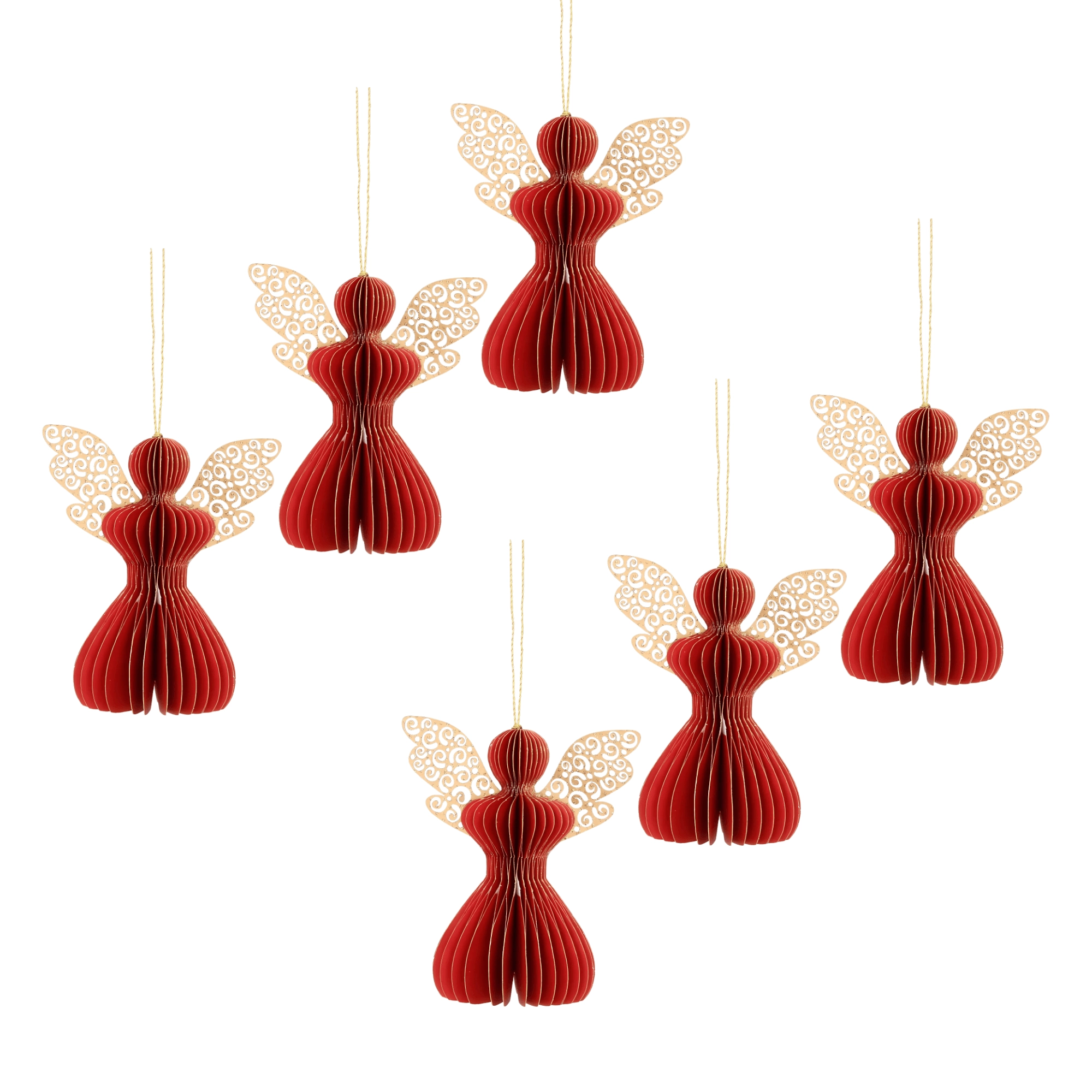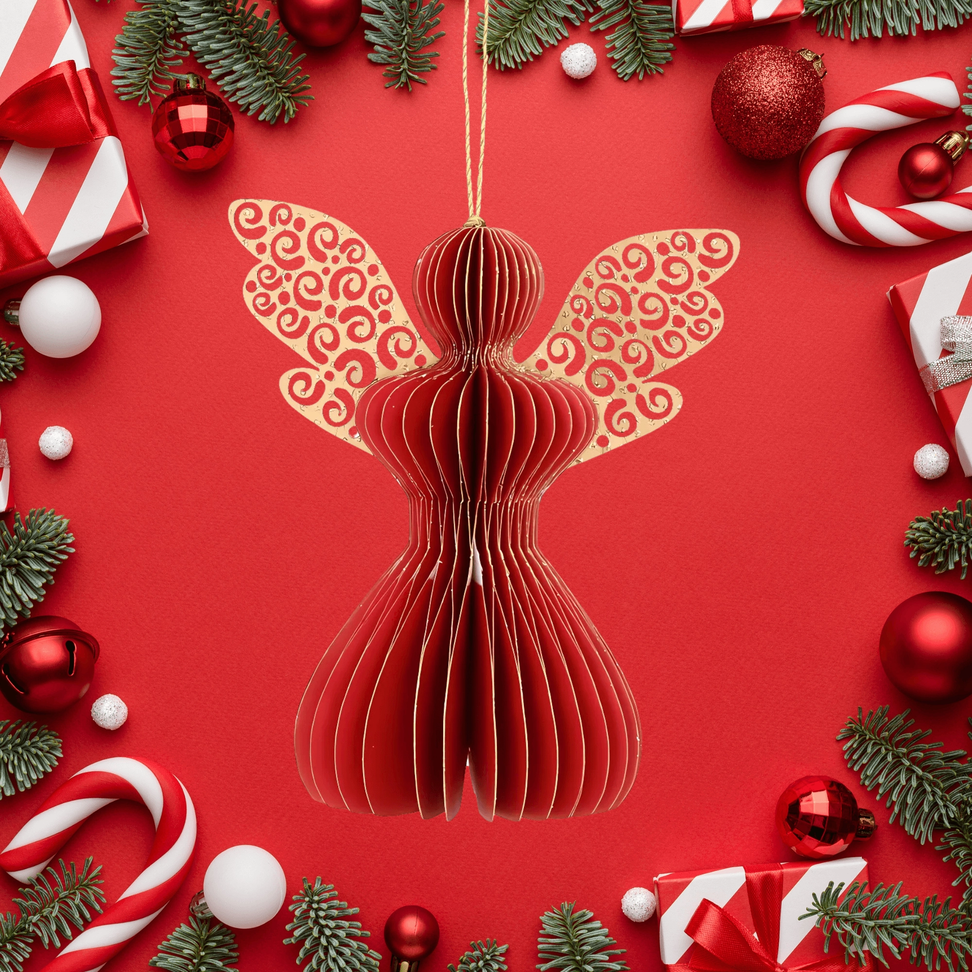 Czerwony papierowy aniołek to uniwersalna świąteczna dekoracja, która pasuje do klasycznych i nowoczesnych wnętrz. Dzięki lekkiemu designowi honeycomb (składanemu) łatwo się zawiesza i tworzy efektowny 3D efekt. Wykorzystasz go na choince, wieńcu, w oknach oraz jako subtelny akcent świątecznego stołu.