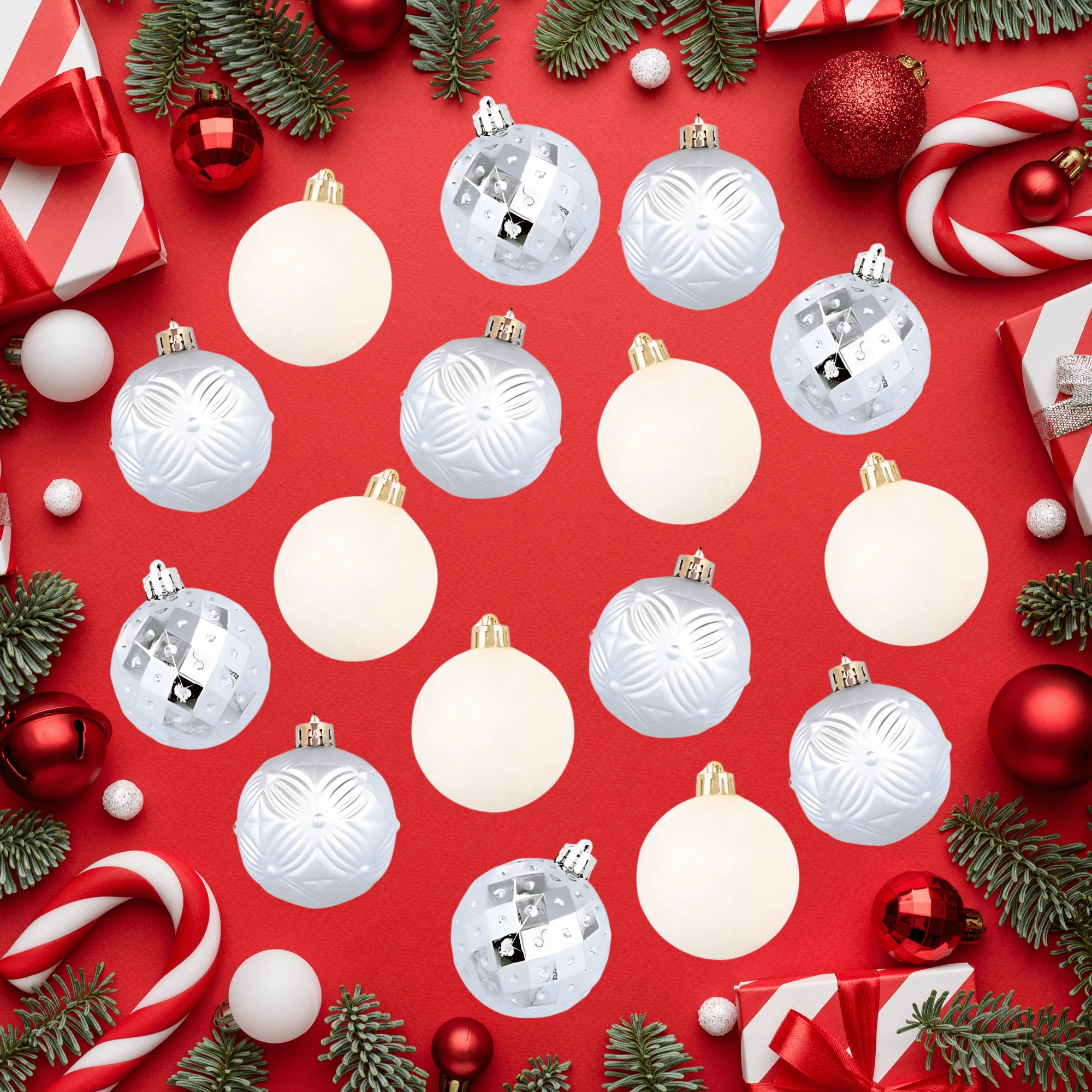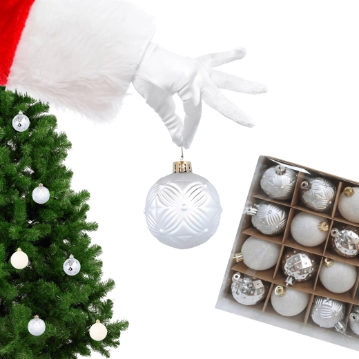 Ten elegancki zestaw bombek w ponadczasowym srebrnym kolorze rozświetli każde wnętrze i podkreśli świąteczną atmosferę. Połączenie różnych wykończeń powierzchni – od połysku po mat – tworzy harmonijny i efektowny zestaw na choince, wieńcu oraz w innych dekoracjach.