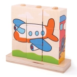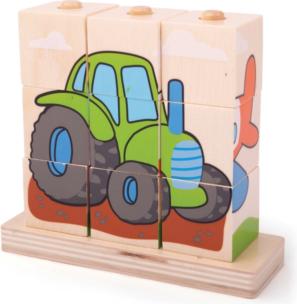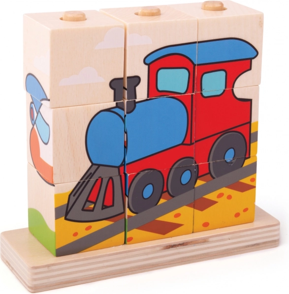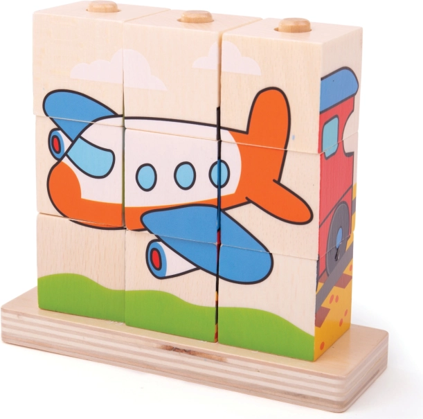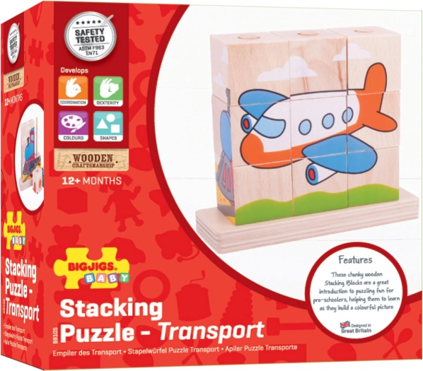 Drewniana układanka Bigjigs Baby Środki transportu to idealna zabawka do rozwoju umiejętności motorycznych i koordynacji ręka-oko u dzieci. Zawiera 10 sztuk drewnianych klocków z czterema scenami transportowymi: pociąg, samochód, traktor i samolot.