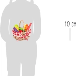 Zestaw do zabawy z wiklinowym koszykiem i drewnianą żywnością zapewnia dzieciom realistyczną zabawę w kuchni i sklepiku. Elementy są połączone rzepem i można je „kroić” dołączonym nożem. Wspiera rozwój motoryki małej, zabawę w odgrywanie ról oraz naukę o owocach i warzywach.