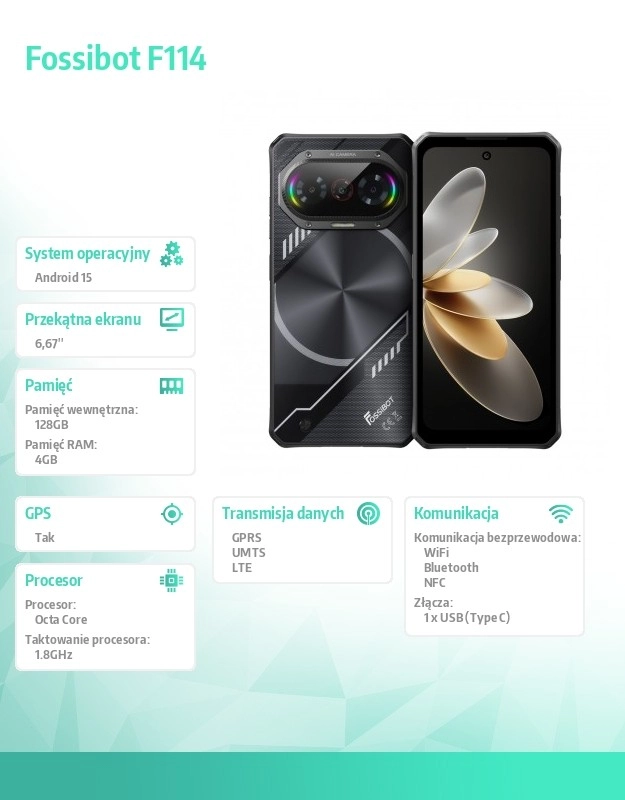 FOSSiBOT F114 został zaprojektowany do pracy i rozrywki w terenie. Solidna obudowa ze wzmocnionymi narożnikami i przykręcanymi elementami oferuje wysoki poziom odporności, a duży wyświetlacz z otworem na kamerę selfie gwarantuje komfortową obsługę i doskonały przegląd treści. Dzięki wieloobiektywowemu aparatowi AI uchwycisz ostre ujęcia nawet w gorszych warunkach oświetleniowych.