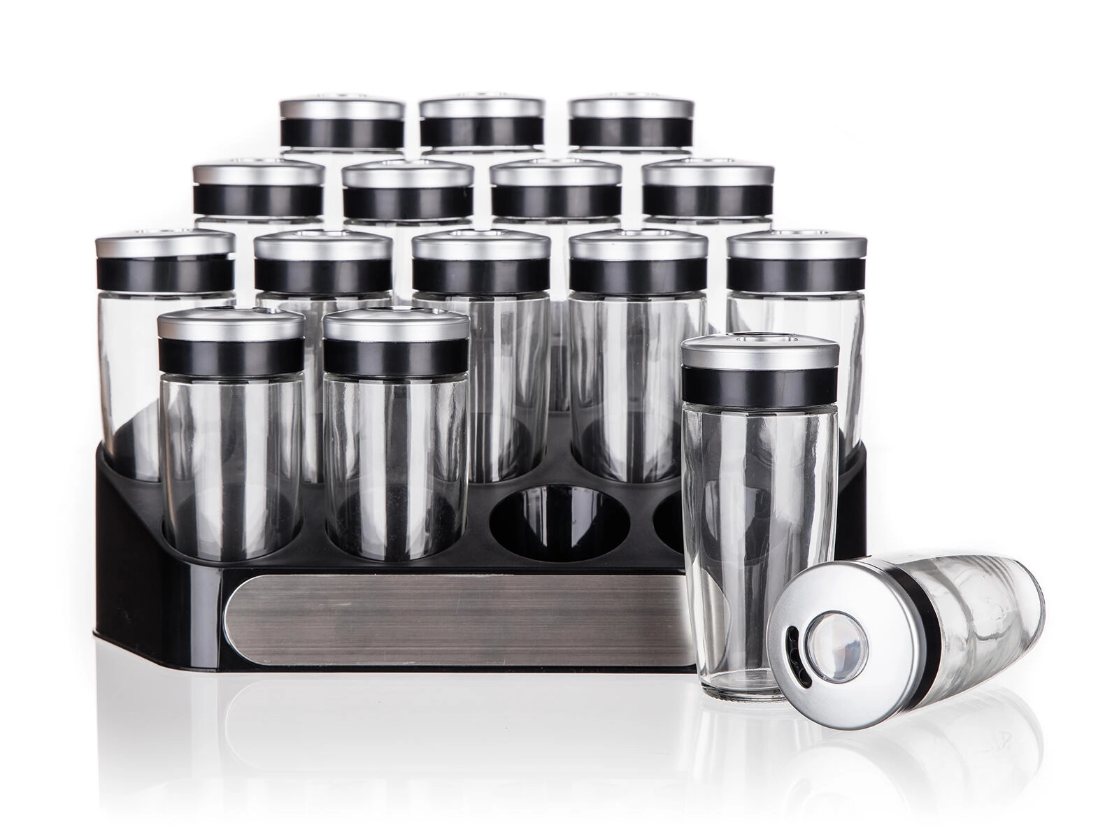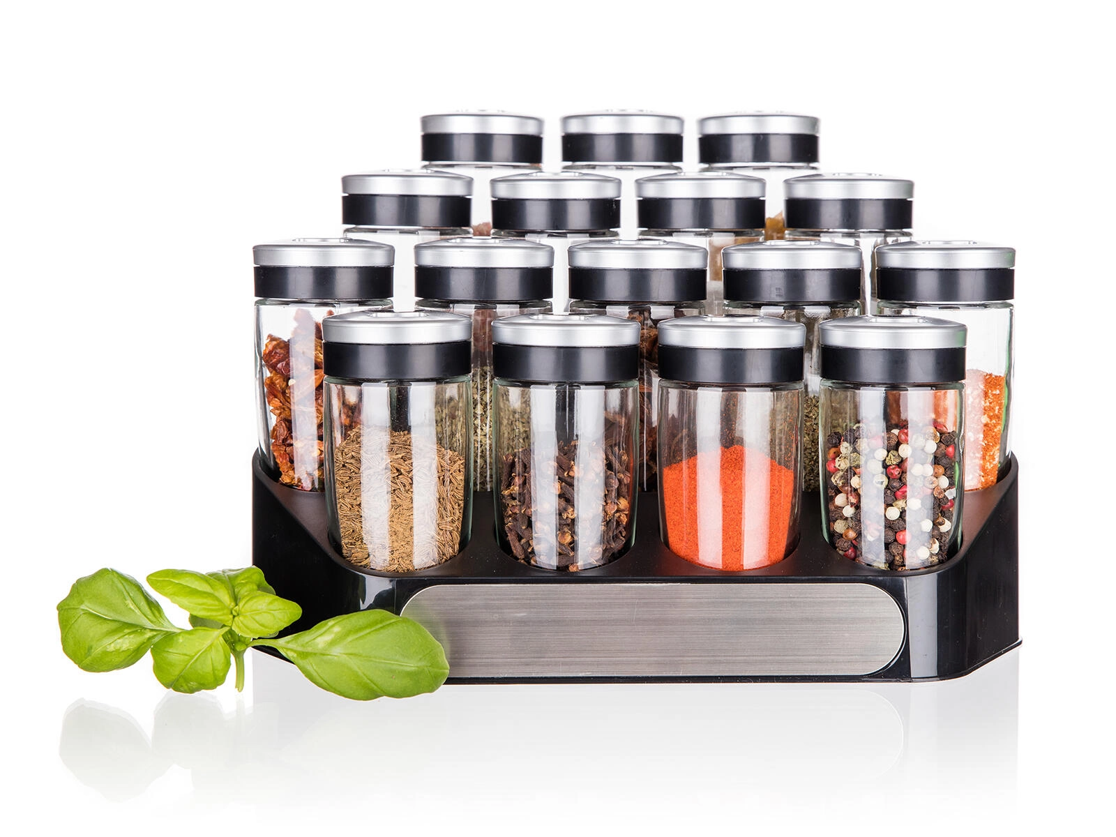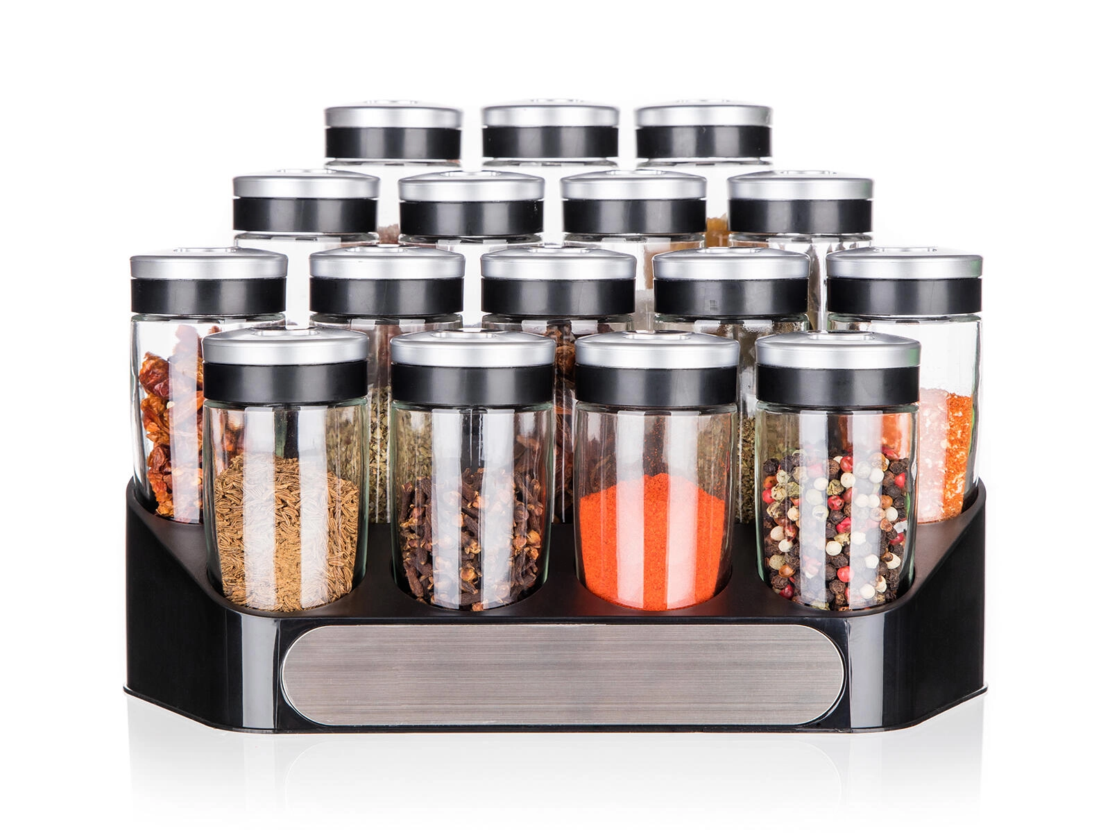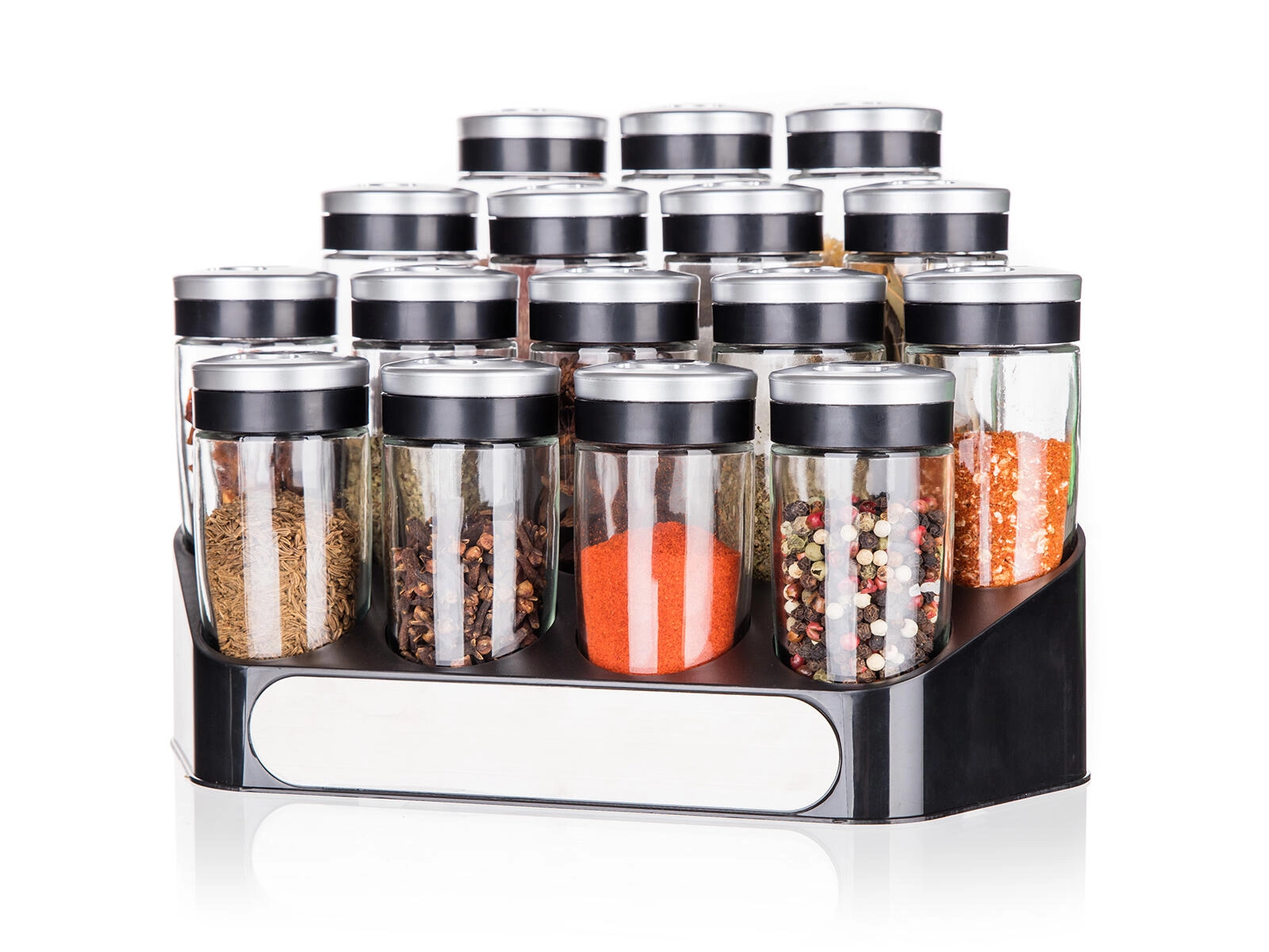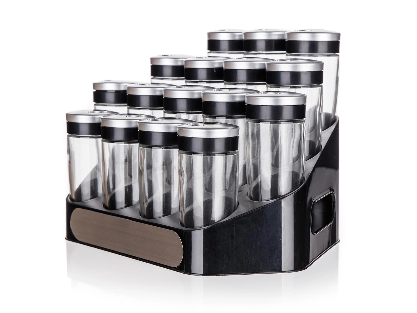 Stabilny stojak z ABS utrzymuje wszystkie 16 słoiczków w porządku i w zasięgu ręki – idealny na blat kuchenny lub do spiżarni.