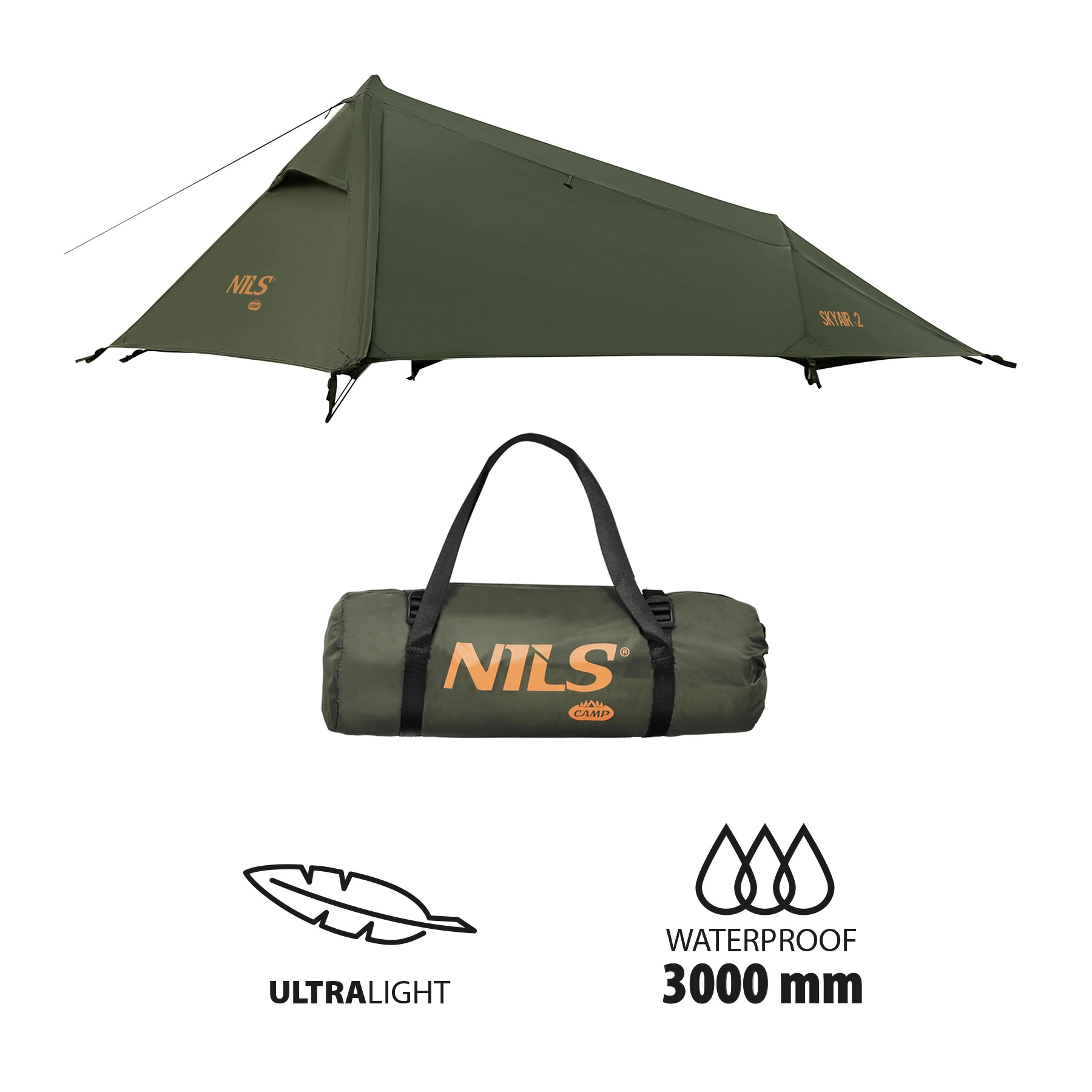 Ultralekki dwuosobowy namiot NILS Camp Skyair 2 jest idealny na wyprawy rowerowe, spływy kajakowe i górskie wędrówki. Oferuje minimalną masę 2,4 kg, kompaktowe wymiary po spakowaniu oraz niezawodną ochronę przed deszczem i wiatrem. Dzięki tropikowi o wodoodporności 3000 mm, podłodze 5000 mm oraz moskitierze no-see-um gwarantuje komfortowy i spokojny sen na łonie natury.