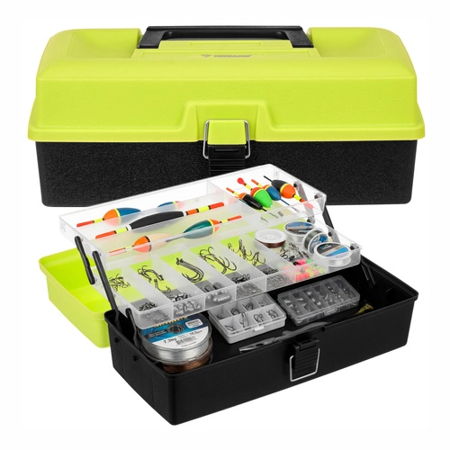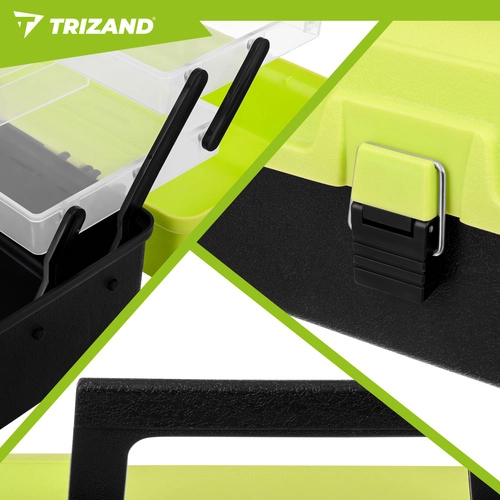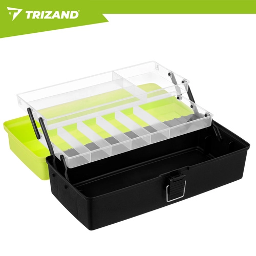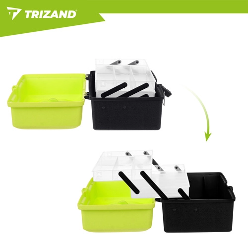 Wędkarski box TRIZAND to idealny wybór dla każdego wędkarza, który chce trzymać przynęty, haczyki, krętliki i inne niezbędniki perfekcyjnie posegregowane. Górną część tworzą 2 odchylane półki z 11 przegródkami na drobiazgi, natomiast pojemna dolna komora mieści większy sprzęt. Solidne zamki zatrzaskowe utrzymują wszystko bezpiecznie zamknięte podczas przenoszenia.