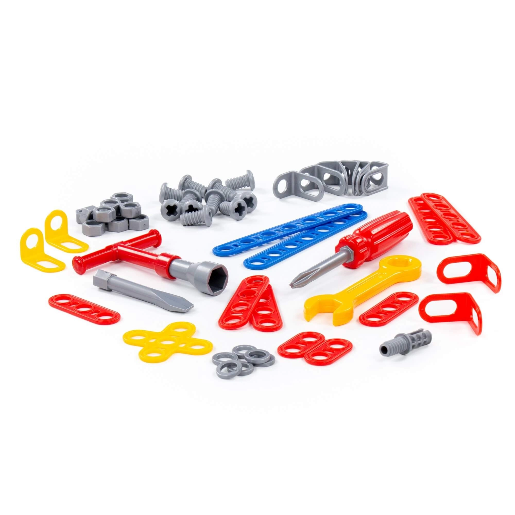 Elementy konstrukcyjne, śrubki i nakrętki, dziecięcy śrubokręt, klucz oraz inne akcesoria