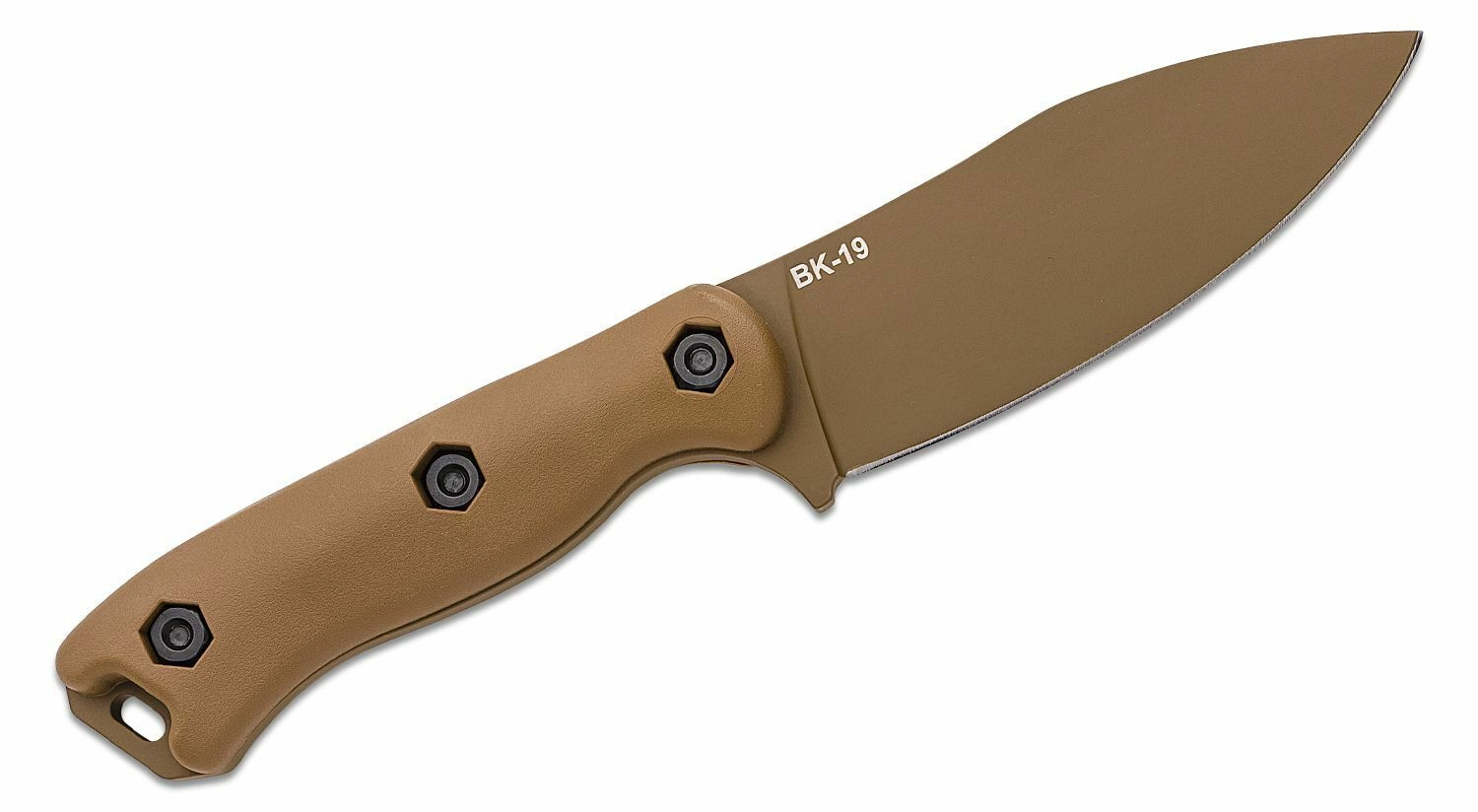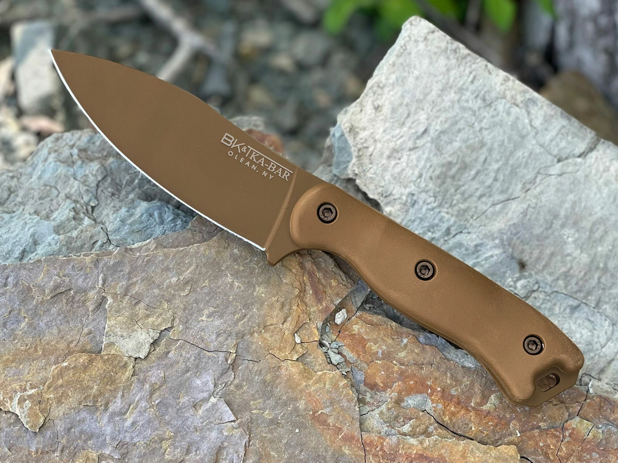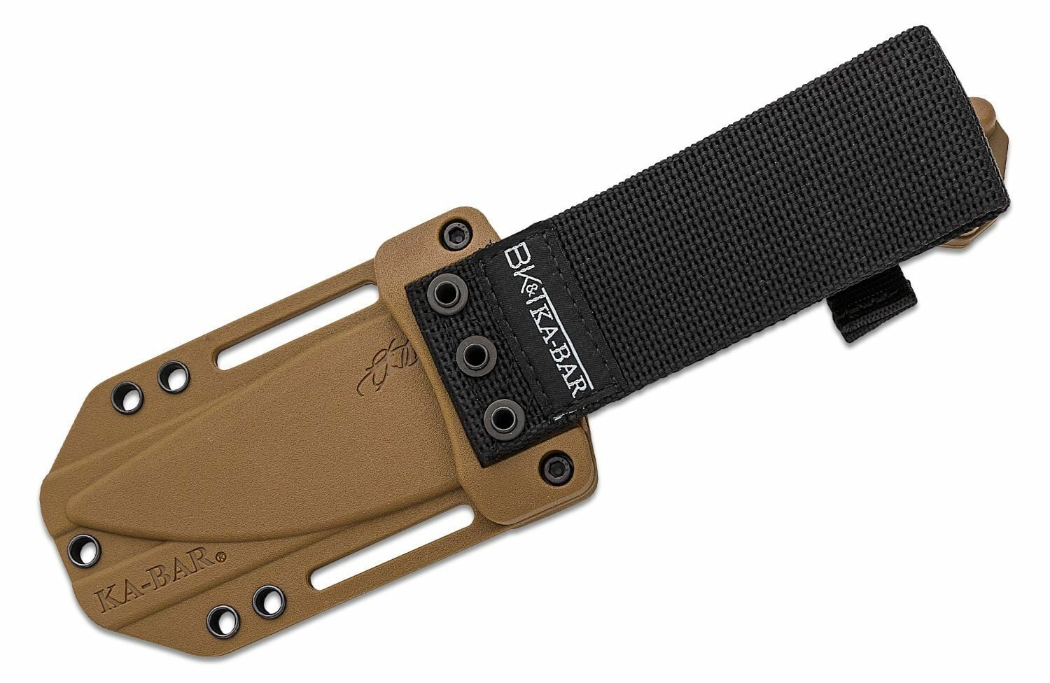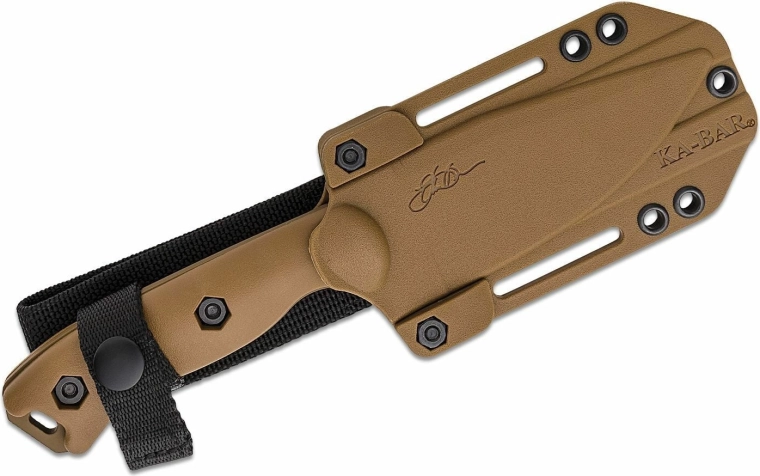 Pełnowymiarowa konstrukcja full-tang zwiększa wytrzymałość i żywotność noża. Teksturowane okładziny z Zytelu w piaskowym brązowym odcieniu zapewniają komfortowy i pewny chwyt także w rękawicach. W zestawie znajduje się wytrzymała polimerowa pochwa z wieloma opcjami mocowania, umożliwiająca bezpieczne i elastyczne noszenie na pasku lub w oporządzeniu.