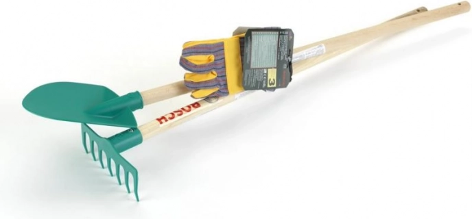 Dziecięcy zestaw narzędzi ogrodowych BOSCH: łopata 89 cm, grabie 75 cm i rękawice. Drewniane trzonki, realistyczny design, odpowiedni od 3 lat.