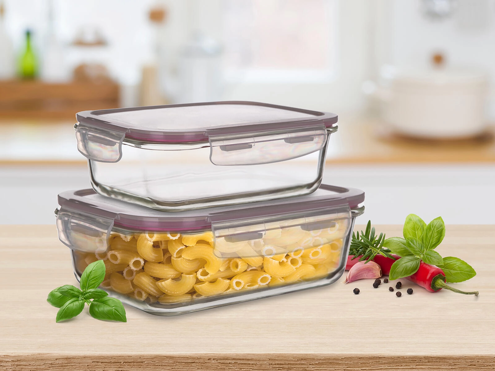Praktyczny zestaw dwóch prostokątnych szklanych pojemników Lora o pojemności 0,55 l i 0,95 l z polipropylenowymi pokrywkami oferuje hermetyczne zamknięcie, bezpieczne zachowanie świeżości oraz wszechstronne zastosowanie w kuchni. Odpowiednie do pieczenia w piekarniku (bez pokrywki), podgrzewania w kuchence mikrofalowej, mrożenia oraz transportu potraw. Pokrywka jest transparentna z bordową uszczelką dla niezawodnego uszczelnienia.