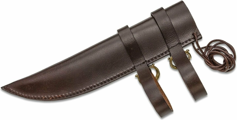 Rękojeść z twardego drewna jest prosto wyprofilowana i na końcu lekko wygięta dla pewniejszego i wygodniejszego chwytu. Skórzane etui z paskami umożliwia bezpieczne i dyskretne poziome noszenie na pasie, dzięki czemu nóż masz zawsze pod ręką.