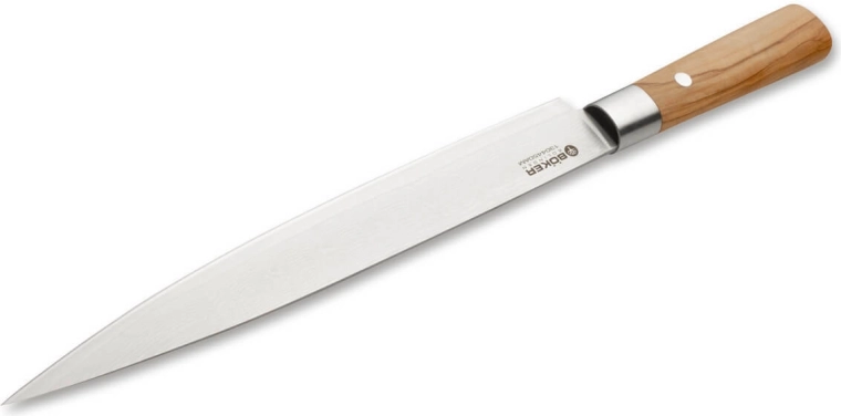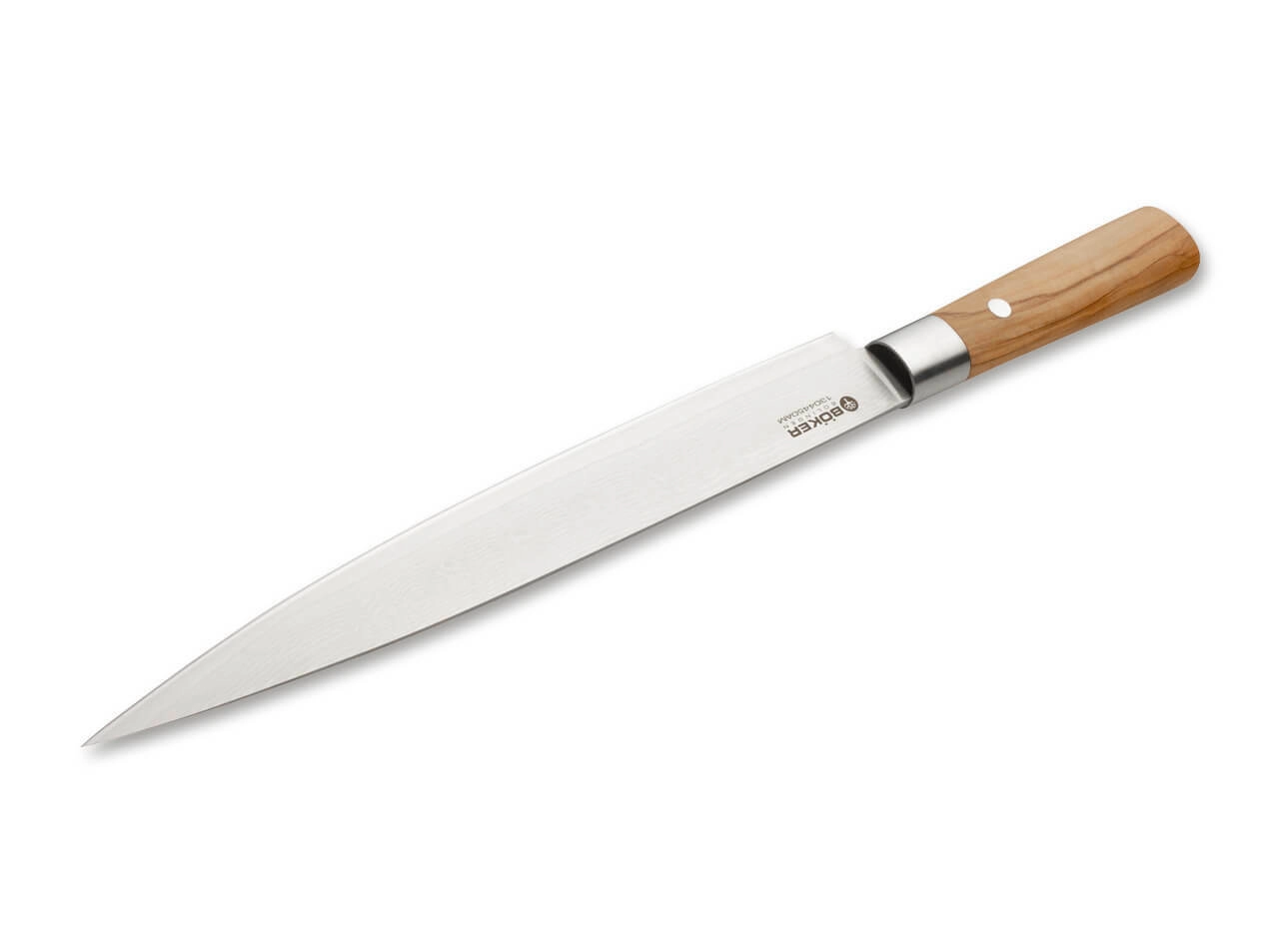 Nóż do porcjowania Böker Manufaktur Solingen Damascus Olive został zaprojektowany do precyzyjnego i gładkiego krojenia cienkich plastrów oraz kostki. Długie, smukłe ostrze z wielowarstwowej stali damasceńskiej zapewnia znakomitą kontrolę cięcia i minimalizuje strzępienie włókien mięsa i ryb.