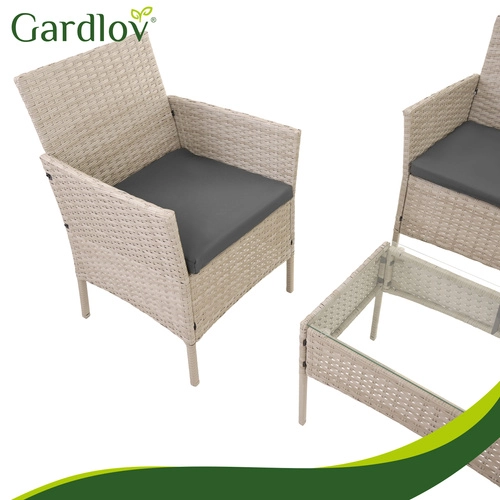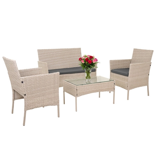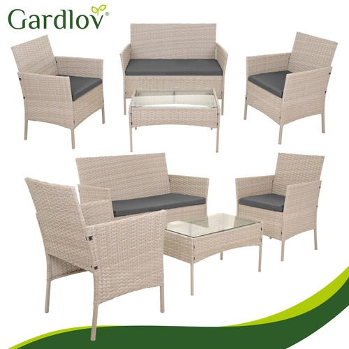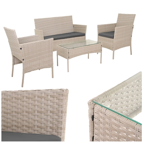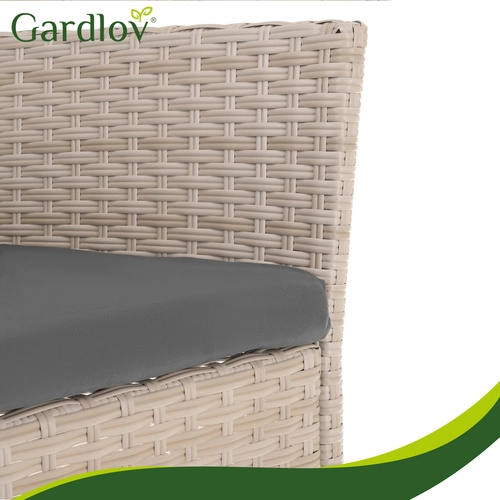 Elegancki ogrodowy zestaw GARDLOV w kolorze beżowym zapewnia komfort i styl na tarasie, balkonie i w ogrodzie. Zawiera 2 fotele, dwuosobową sofę oraz stolik kawowy z hartowanym szkłem. Trwała ocynkowana stal z technorattanem, poduszki z odpinanymi pokrowcami oraz łatwa pielęgnacja gwarantują długą żywotność i bezproblemowe użytkowanie.