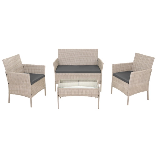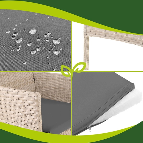 Stwórz własną strefę relaksu z ponadczasowym zestawem z technorattanu w kolorze beżowym. Dzięki solidnej konstrukcji z ocynkowanej stali oplecionej technorattanem oraz odporności na warunki atmosferyczne będziesz cieszyć się wygodą przez cały sezon. Miękkie poduszki o grubości 5 cm w stylowej szarej barwie uzupełnia stolik kawowy z 5‑mm szklanym blatem do serwowania napojów i przekąsek.