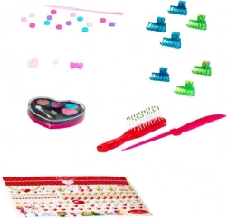 W opakowaniu znajdziesz grzebień, szczotkę, małe klipsy, koraliki, wstążki, naklejki oraz paletkę – wszystko do stylizacji i zdobienia.