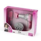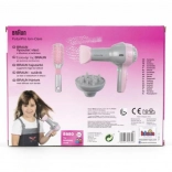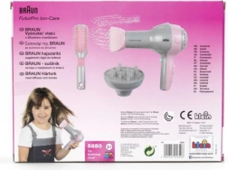 Przedstawiamy dziecięcą suszarkę Braun z dyfuzorem i szczotką, idealną dla małych fryzjerek. Produkt został wyprodukowany na licencji firmy Braun, co nadaje mu realistyczny wygląd, podobny do prawdziwego urządzenia. Produkt jest całkowicie bezpieczny, suszarka tylko wydmuchuje powietrze, nie nagrzewając się, co zapewnia bezpieczeństwo dla dziecięcych rąk.
