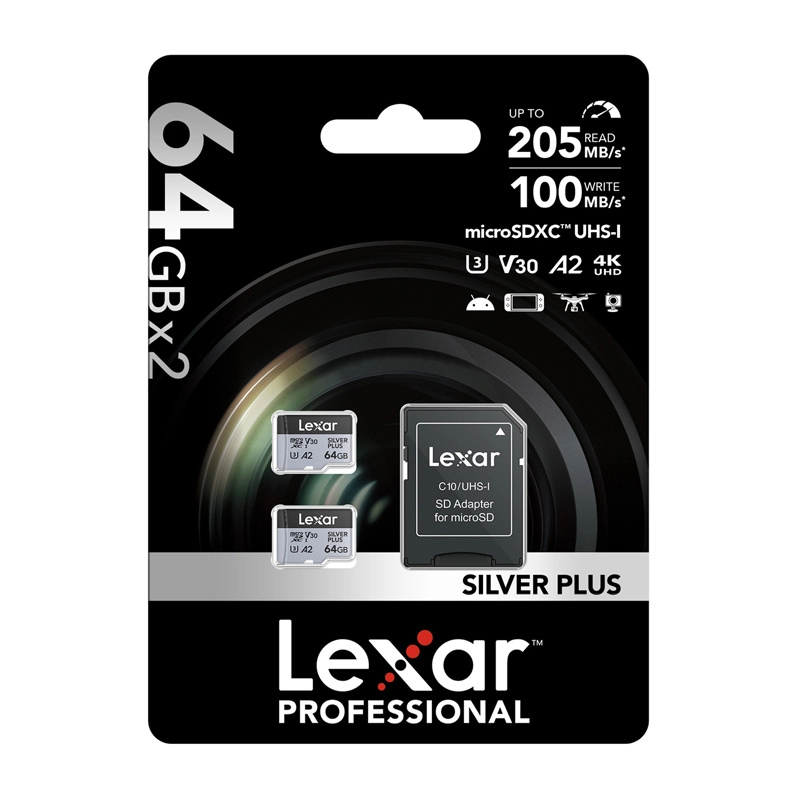 Rozszerz pamięć swoich urządzeń zestawem dwóch kart LEXAR Silver Plus microSDXC 64 GB. Dzięki klasom UHS-I, Class 10, U3 i A2 karty obsługują wideo 4K przy 60 FPS, szybkie zdjęcia sekwencyjne oraz wymagające aplikacje mobilne. W zestawie znajduje się adapter SD do użycia w aparatach, kamerach i laptopach.