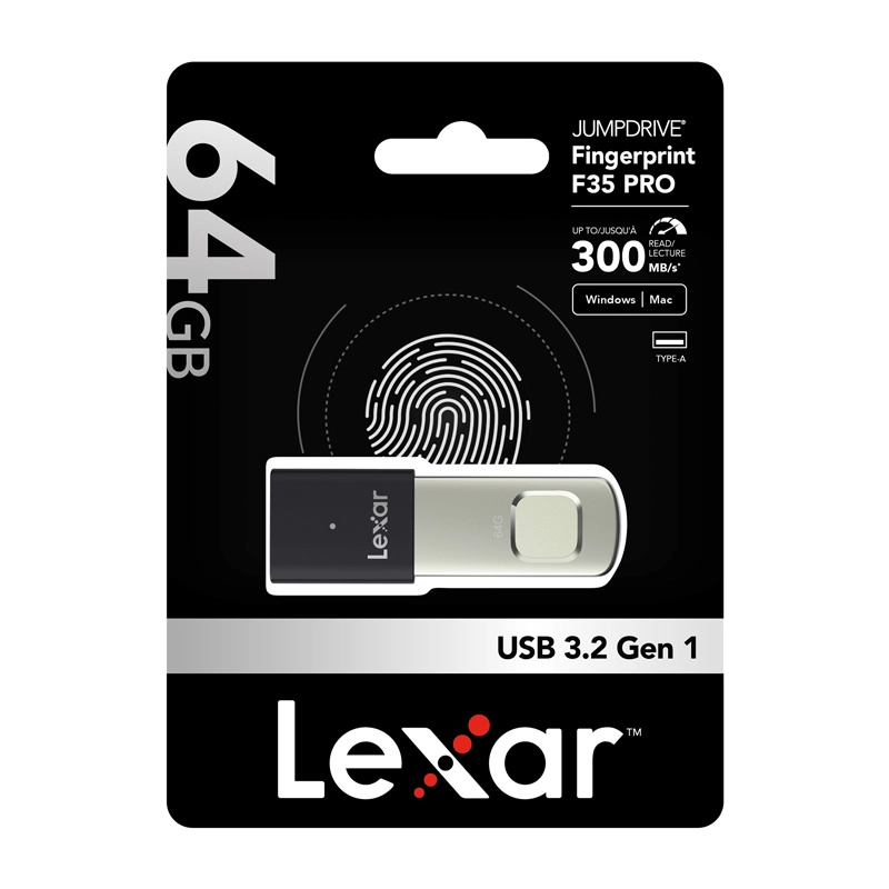 Bezpiecznie przechowuj i przenoś swoje dane z pendrivem Lexar Fingerprint F35 Pro 64 GB. Dzięki czytnikowi linii papilarnych odblokujesz dostęp w mniej niż sekundę, bez haseł. Oferuje prędkość odczytu do 300 MB/s i zapisu do 150 MB/s, wytrzymałe metalowe obudowa oraz praktyczny mechanizm wysuwany chroniący złącze.