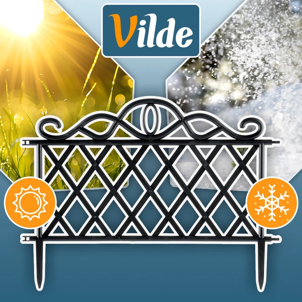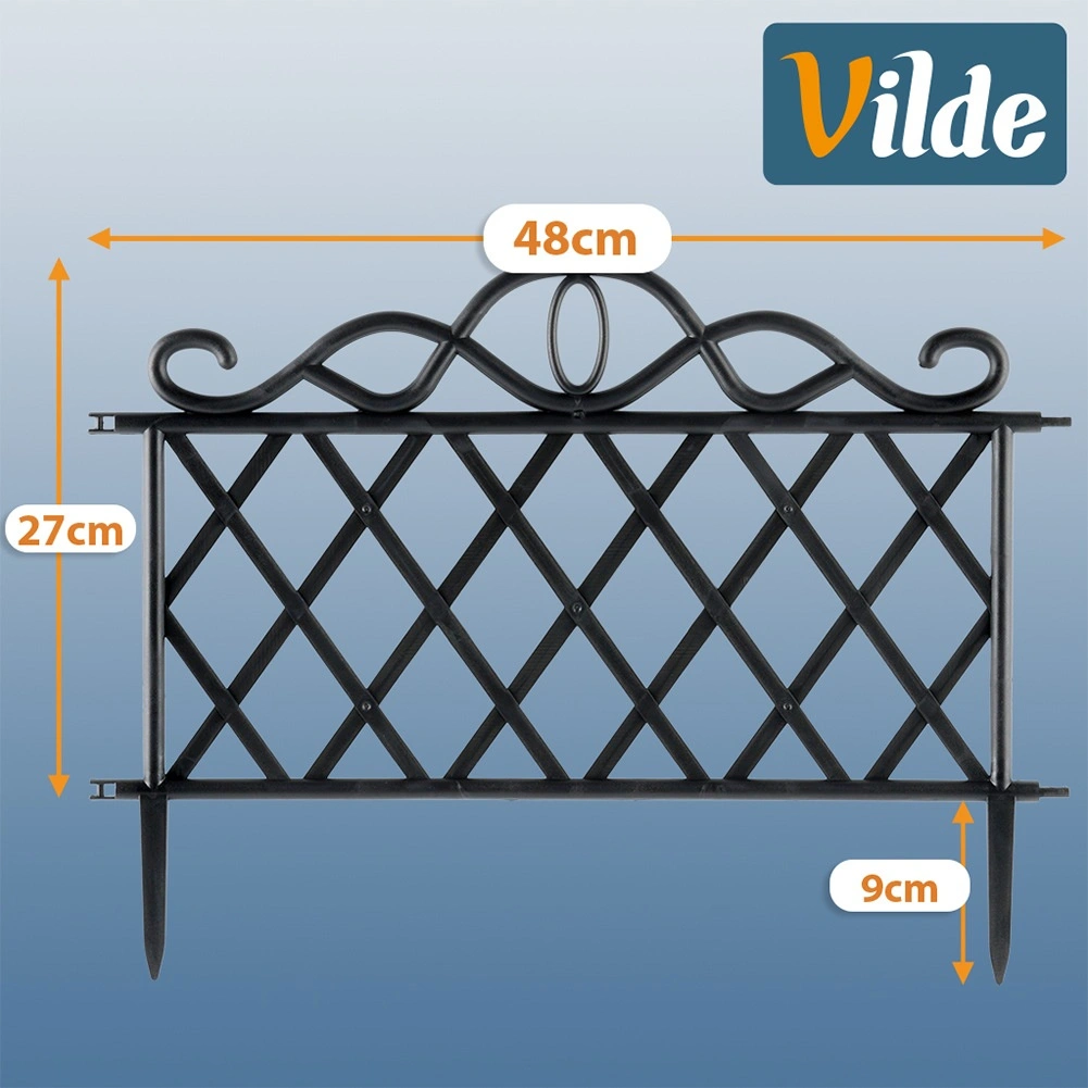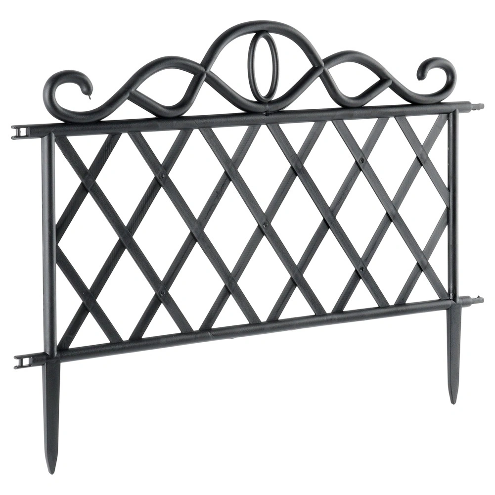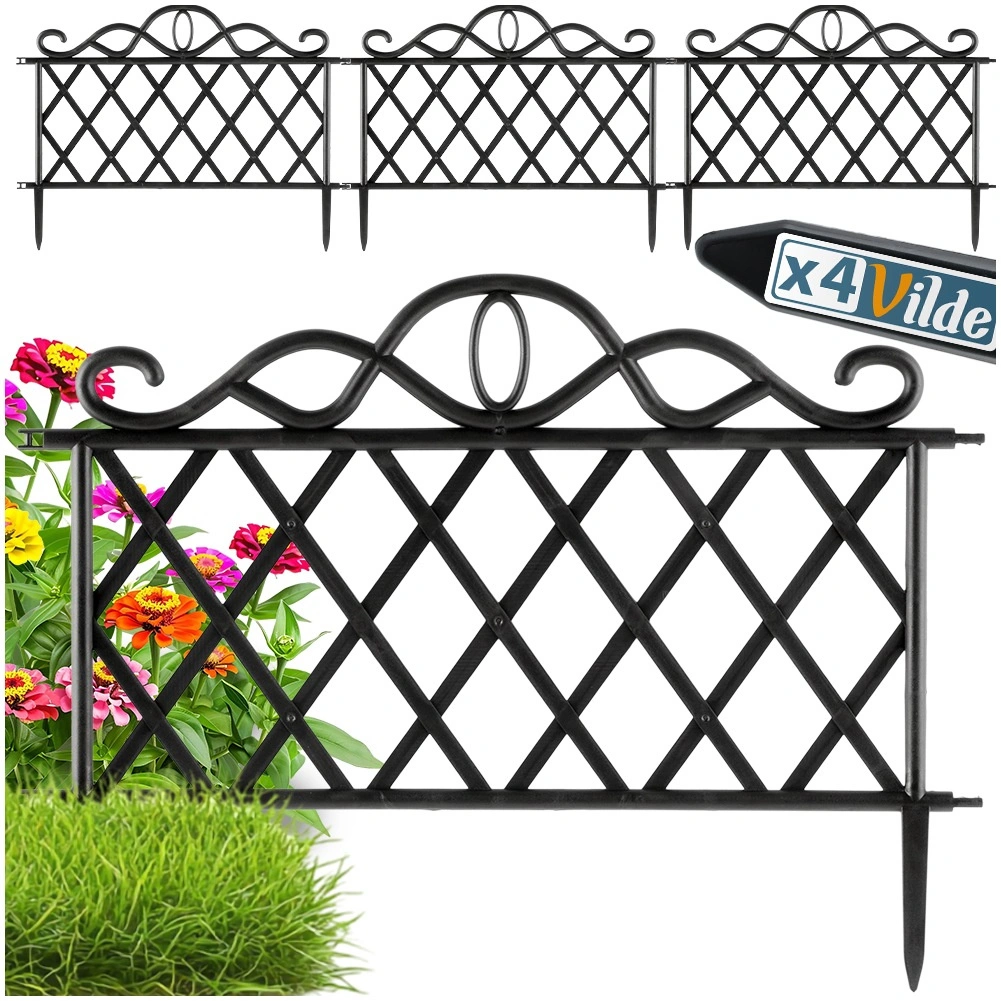 Elegancki zestaw czterech ogrodowych płotków do łatwego oddzielania rabat, trawników i ścieżek. Każdy element ma 48 cm długości i 27 cm wysokości (36 cm łącznie z kotwami). Dzięki możliwości łączenia elementów stworzysz ciągłą krawędź o długości aż 192 cm. Płotki wykonane są z wytrzymałego plastiku w czarnym kolorze, odpornego na mróz, promieniowanie UV i deszcz, a stabilne zakotwienie zapewniają zintegrowane kolce.
