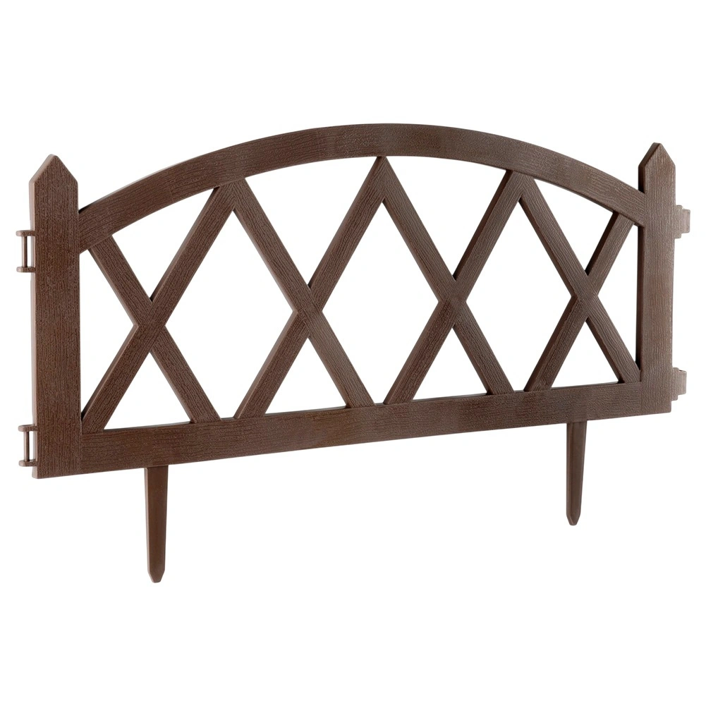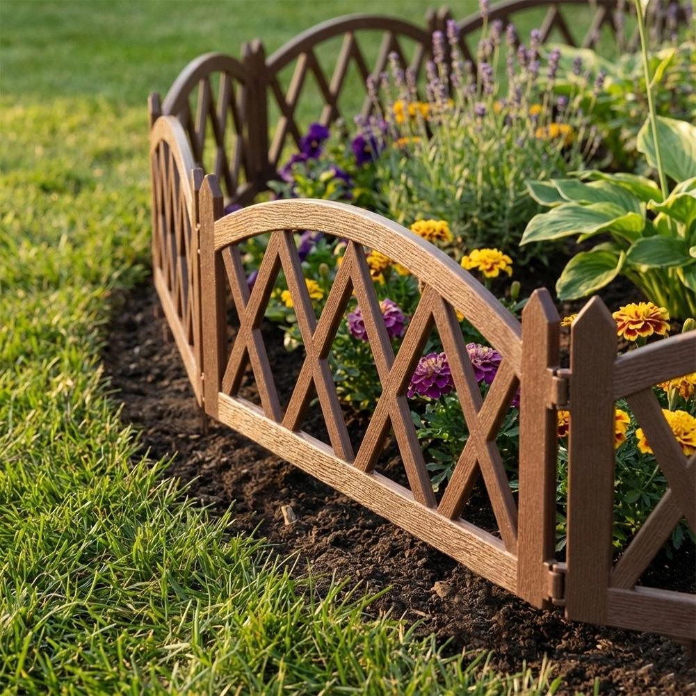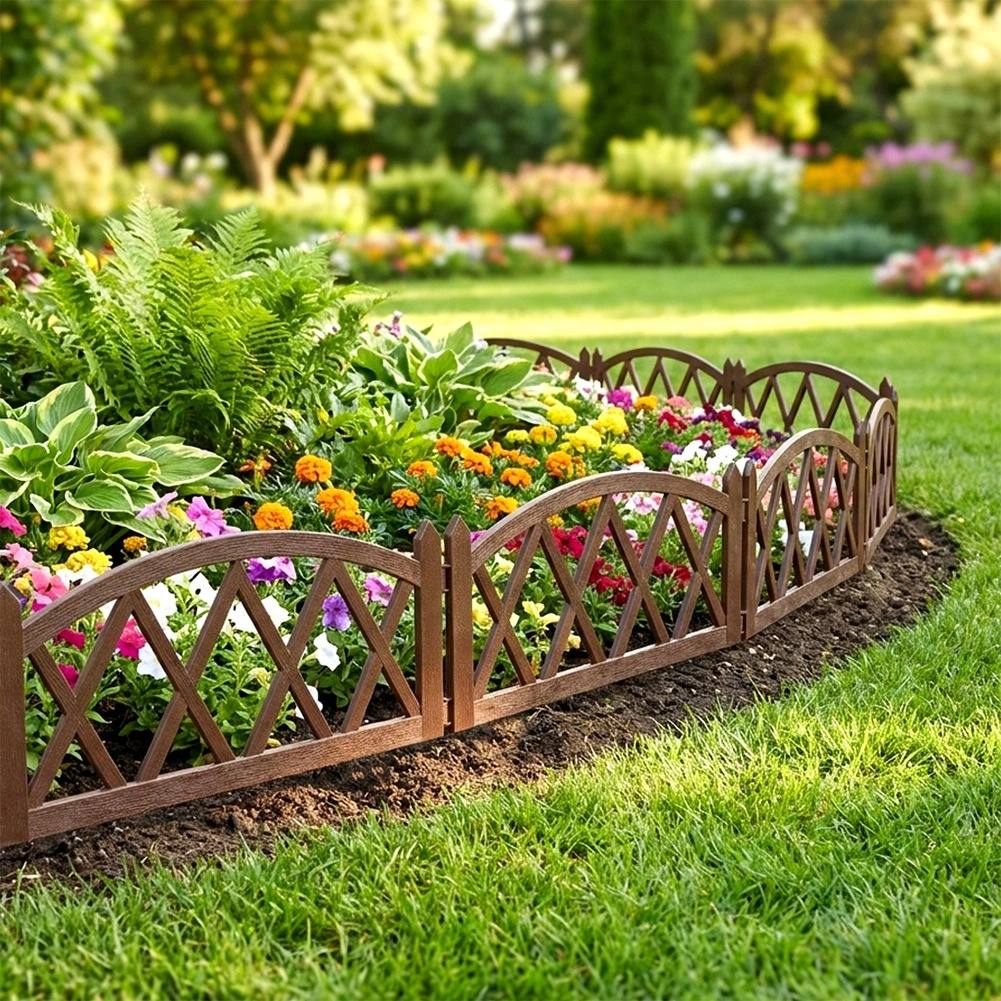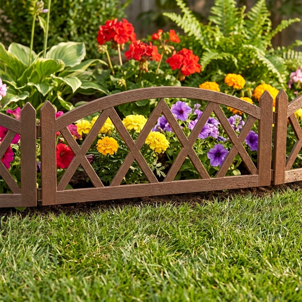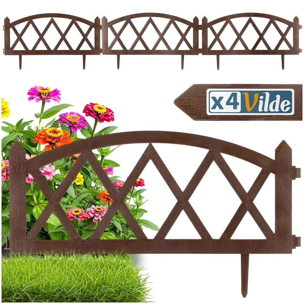 Praktyczny ogrodowy płotek w brązowym kolorze do eleganckiego oddzielania rabat, trawników i ścieżek. Zestaw 4 paneli 57 × 25 cm z mocnymi kołkami gruntowymi umożliwia łatwy montaż, modułowe łączenie do dowolnej długości (do 228 cm w linii prostej) oraz odporność na mróz, UV i deszcz.