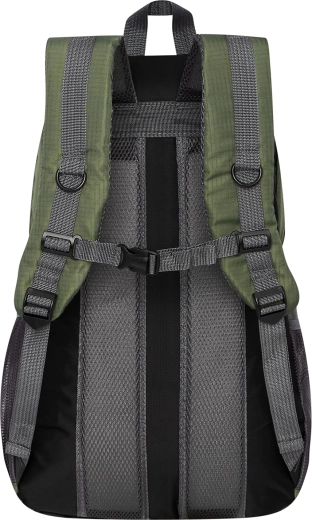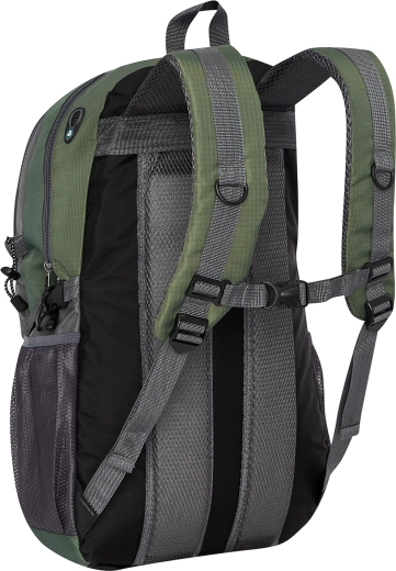 Główna komora z przegrodą, trzy kieszenie na zamek, przednia kieszeń z klamrą oraz dwie boczne siateczki na butelkę lub ekwipunek.
