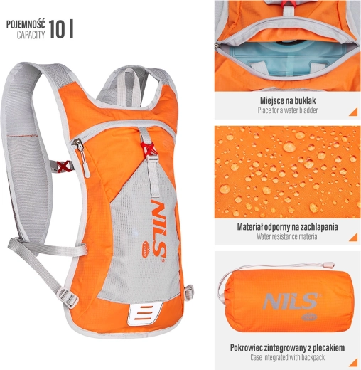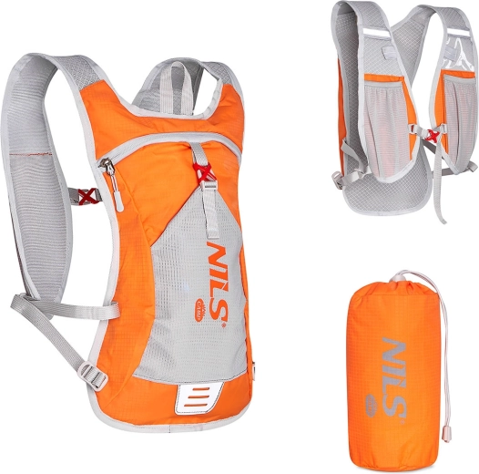 Praktyczny układ obejmuje komorę główną z przegrodą, przednią siateczkową kieszeń z klamrą, elastyczne kieszenie na szelkach oraz karabińczyk z wyjmowanym workiem do spakowania plecaka. Nie zabrakło przygotowania pod bukłak z dwoma przelotami na rurkę (po prawej i lewej) oraz elementów odblaskowych dla lepszej widoczności.