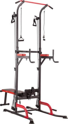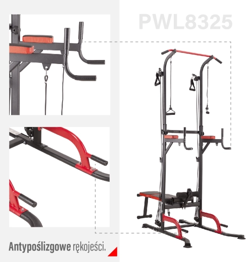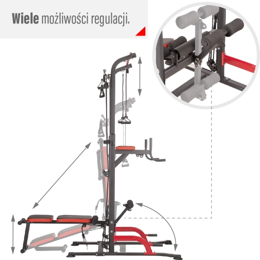 Górny i dolny wyciąg zrealizowano w postaci dwóch par gumowych linek z karabińczykami, których opór można łączyć i napinać przez oczka w ramie. Wszystkie uchwyty mają antypoślizgową powierzchnię dla pewnego chwytu i stabilności podczas wymagających serii. Drążek można ustawić na wysokość do 232 cm, a ławkę łatwo złożyć, aby zaoszczędzić miejsce.