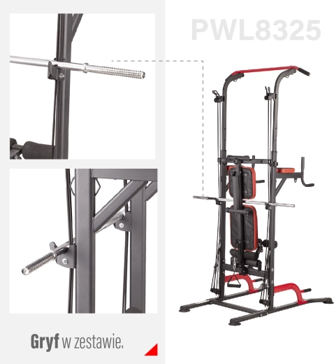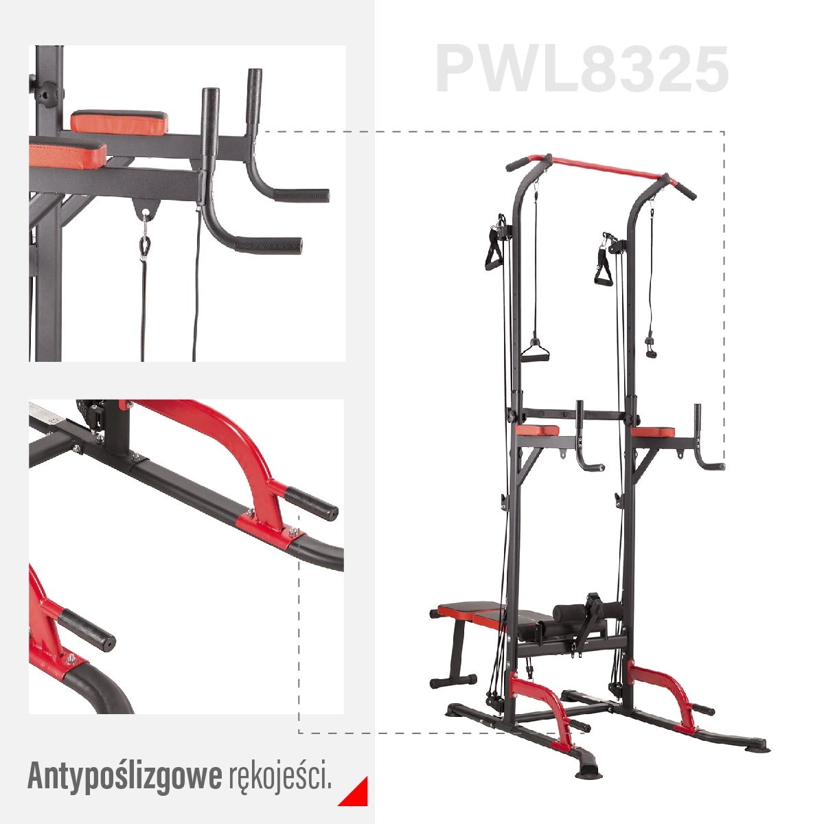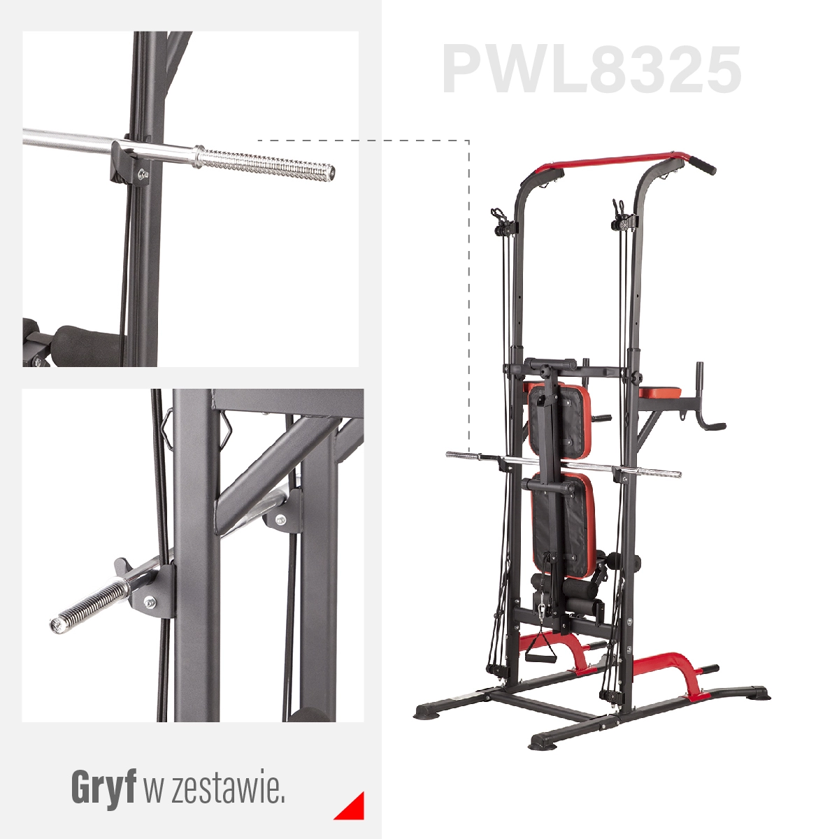 Ze stacją HMS PWL8325 skutecznie przećwiczysz plecy, klatkę piersiową, bicepsy, tricepsy oraz mięśnie brzucha. Konstrukcja łączy drążek z regulacją wysokości, poręcze z podłokietnikami do unoszenia nóg, dolne podpory do głębokich pompek oraz regulowaną ławkę do ćwiczeń skośnych i poziomych z hantlami. W zestawie znajduje się zintegrowany uchwyt na sztangę do wyciskania na ławce i gryf 120 cm.