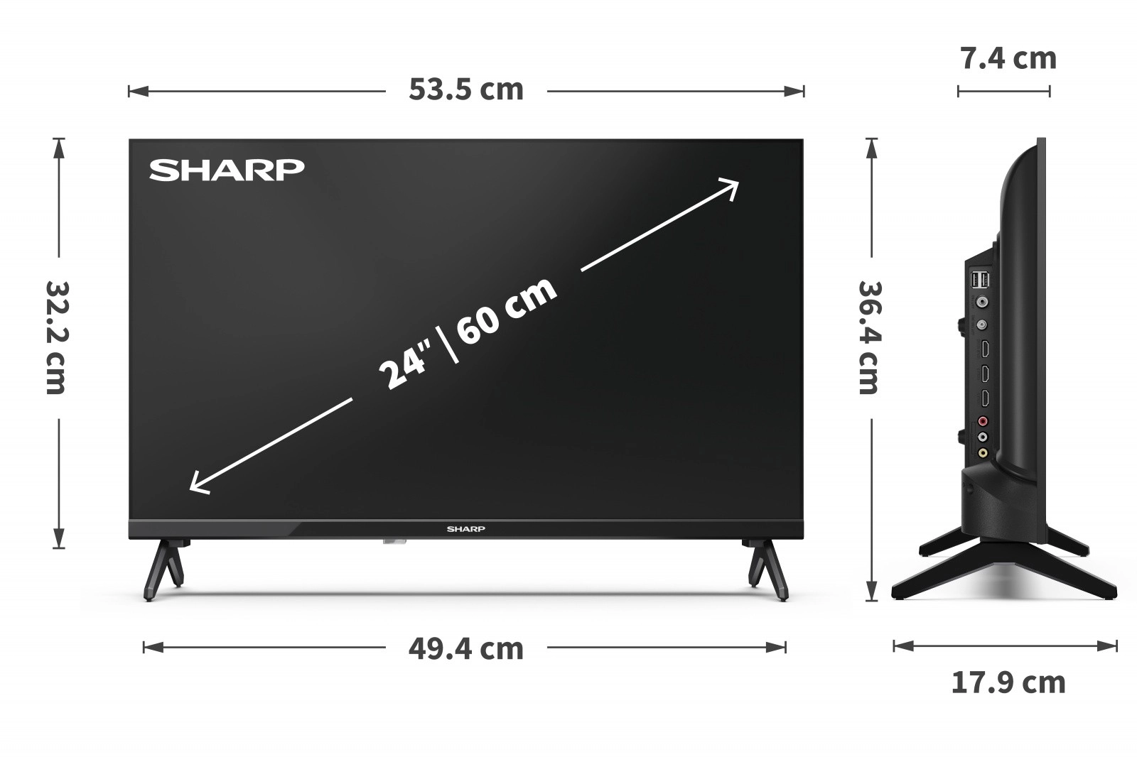 Ciesz się ulubionymi programami na 24‑calowym telewizorze LED SHARP z wysoką jasnością, kontrastem i naturalnymi kolorami. Dzięki kompaktowym wymiarom idealnie pasuje do mniejszych pomieszczeń, zachowując nowoczesny, smukły wygląd i stabilną podstawę.