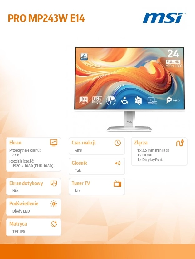 Stylowy monitor 23,8" z płaskim panelem LED oferuje płynność 144 Hz dla komfortowego przeglądania, grania i oglądania wideo. Full HD (1920 × 1080) gwarantuje ostre detale i czytelny tekst, a cienkie ramki zapewniają niezakłócony obraz i idealne zastosowanie w zestawach wielomonitorowych.