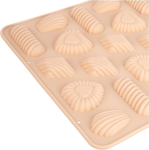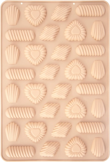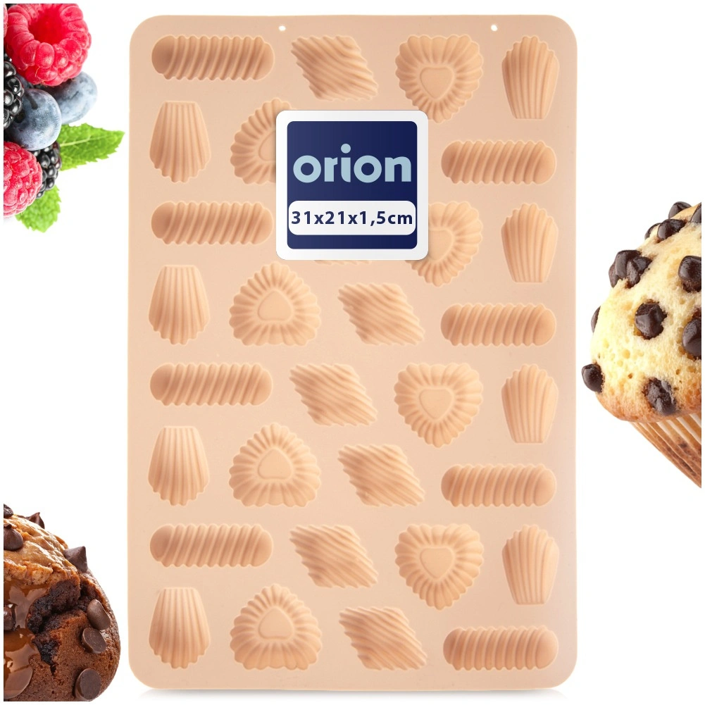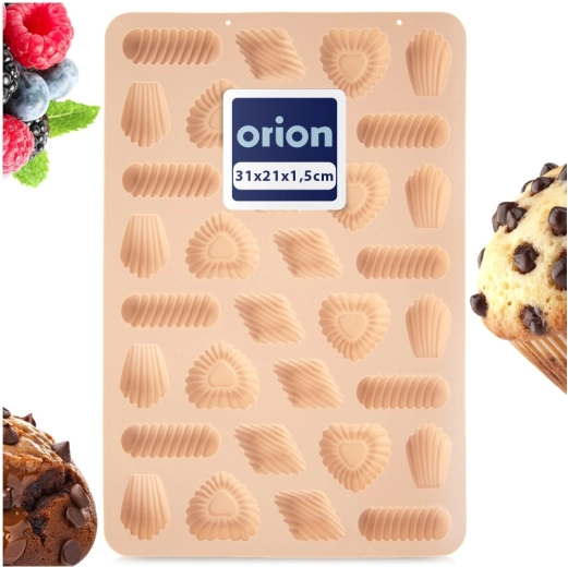 Praktyczna silikonowa forma do pieczenia aż 32 sztuk kruchych ciasteczek, czekoladek lub pralin w 4 dekoracyjnych kształtach. Wykonana z wysokiej jakości, elastycznego silikonu w beżowym kolorze, z nieprzywierającą powierzchnią dla łatwego wyjmowania bez natłuszczania. Odporność termiczna od -40 °C do +220 °C, odpowiednia do piekarnika, kuchenki mikrofalowej oraz zamrażarki, a także można myć w zmywarce. Oryginalny produkt marki ORION.