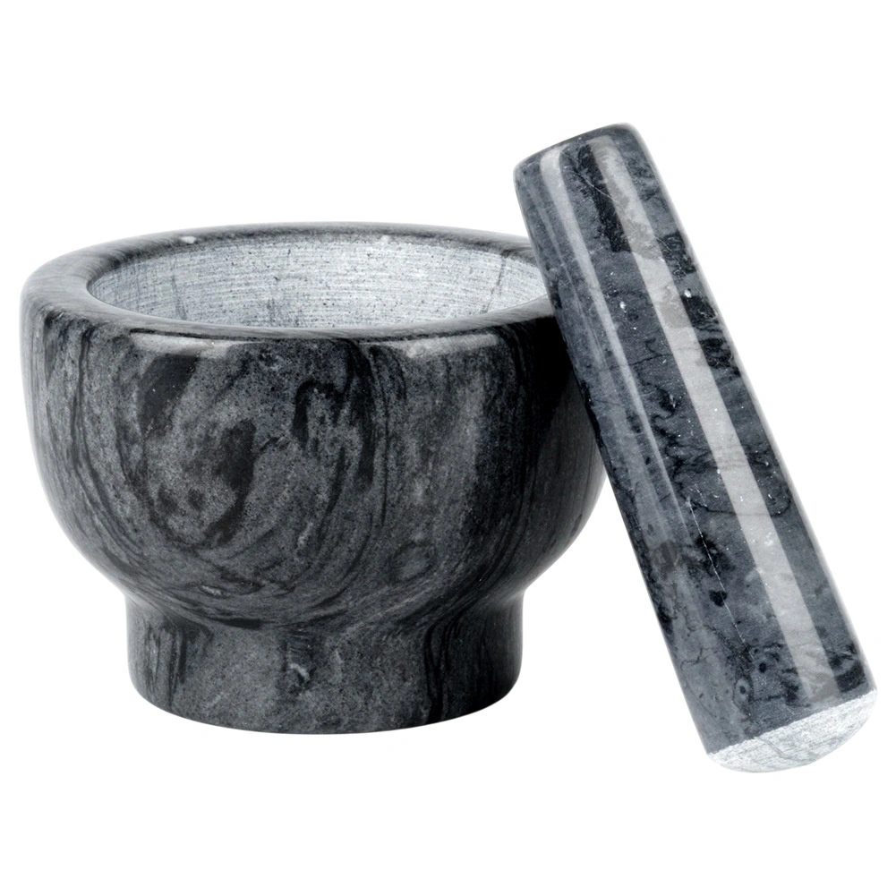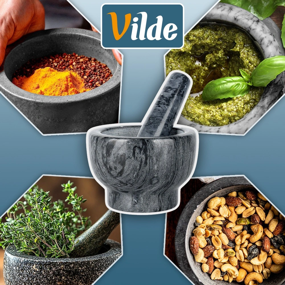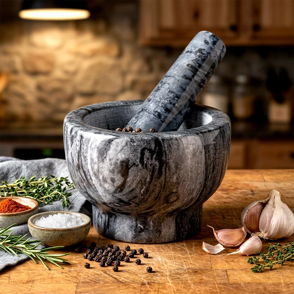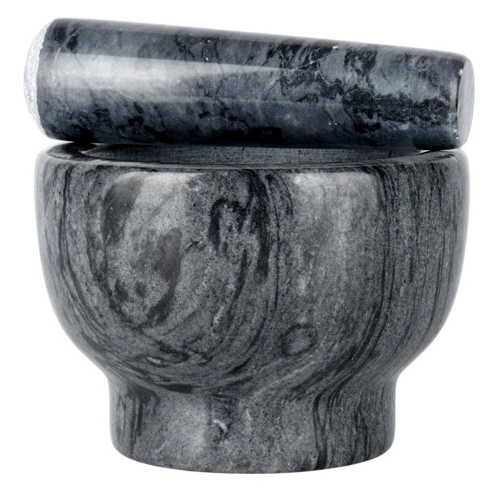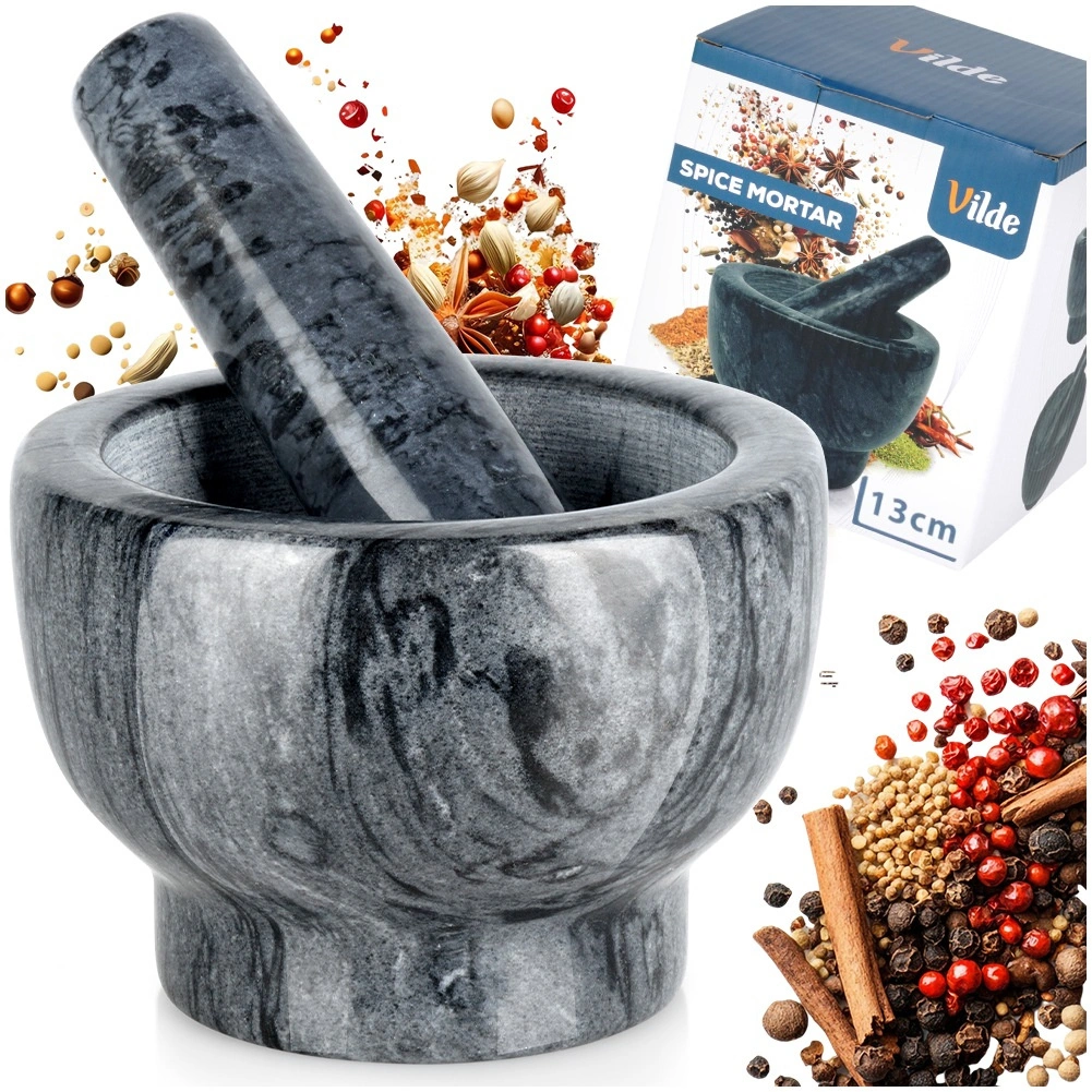 Dzięki masywnej, ciężkiej konstrukcji moździerz jest stabilny i nie ślizga się podczas pracy. Łatwy w czyszczeniu – wystarczy opłukać wodą i wysuszyć. Kamień jest trwały i nie pochłania zapachów, więc pozostaje higieniczny i długotrwale estetyczny. Każdy egzemplarz jest unikatowy, może różnić się rysunkiem i odcieniem.
