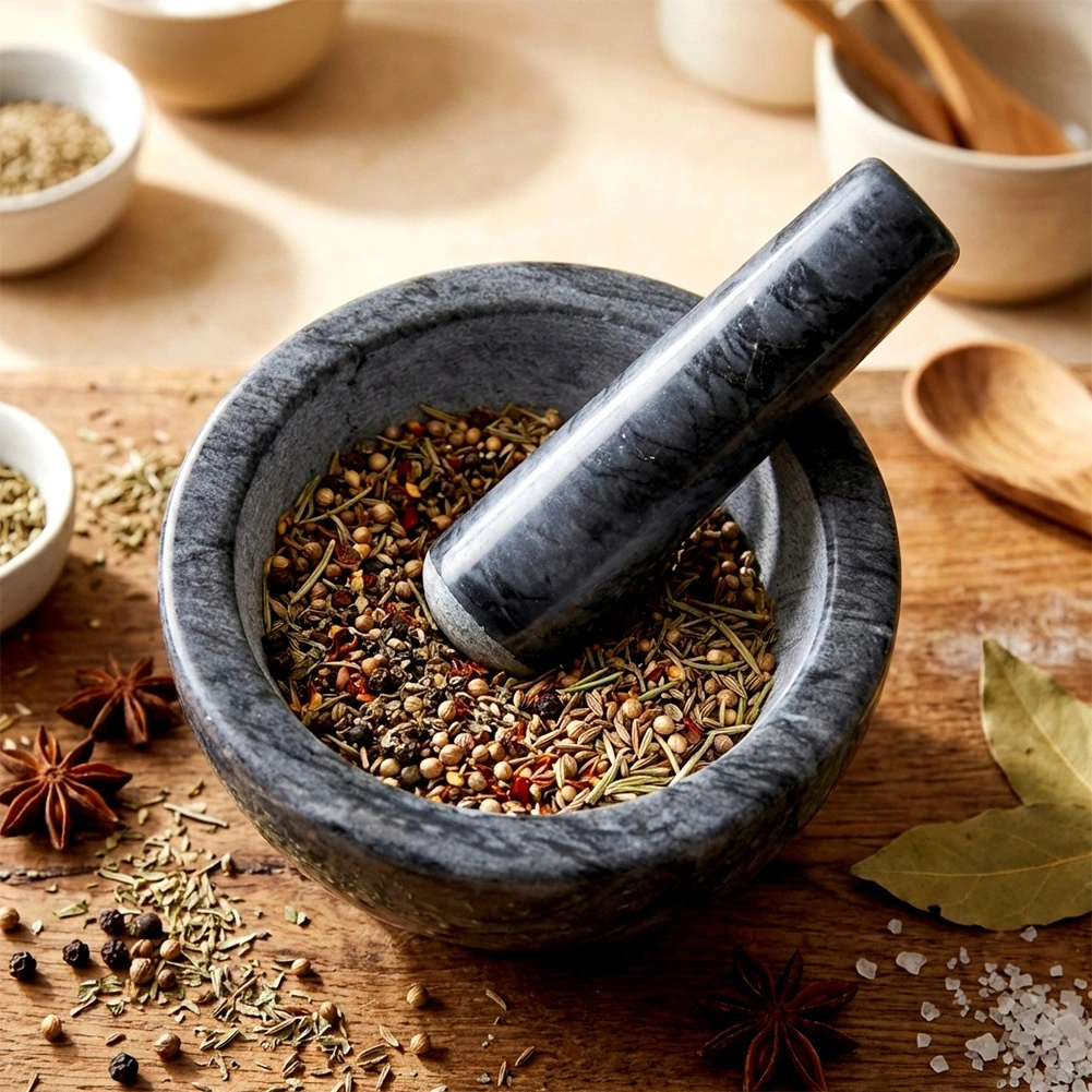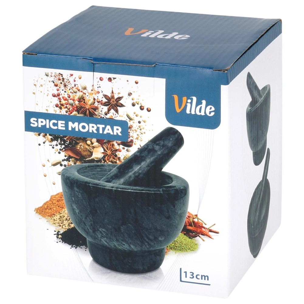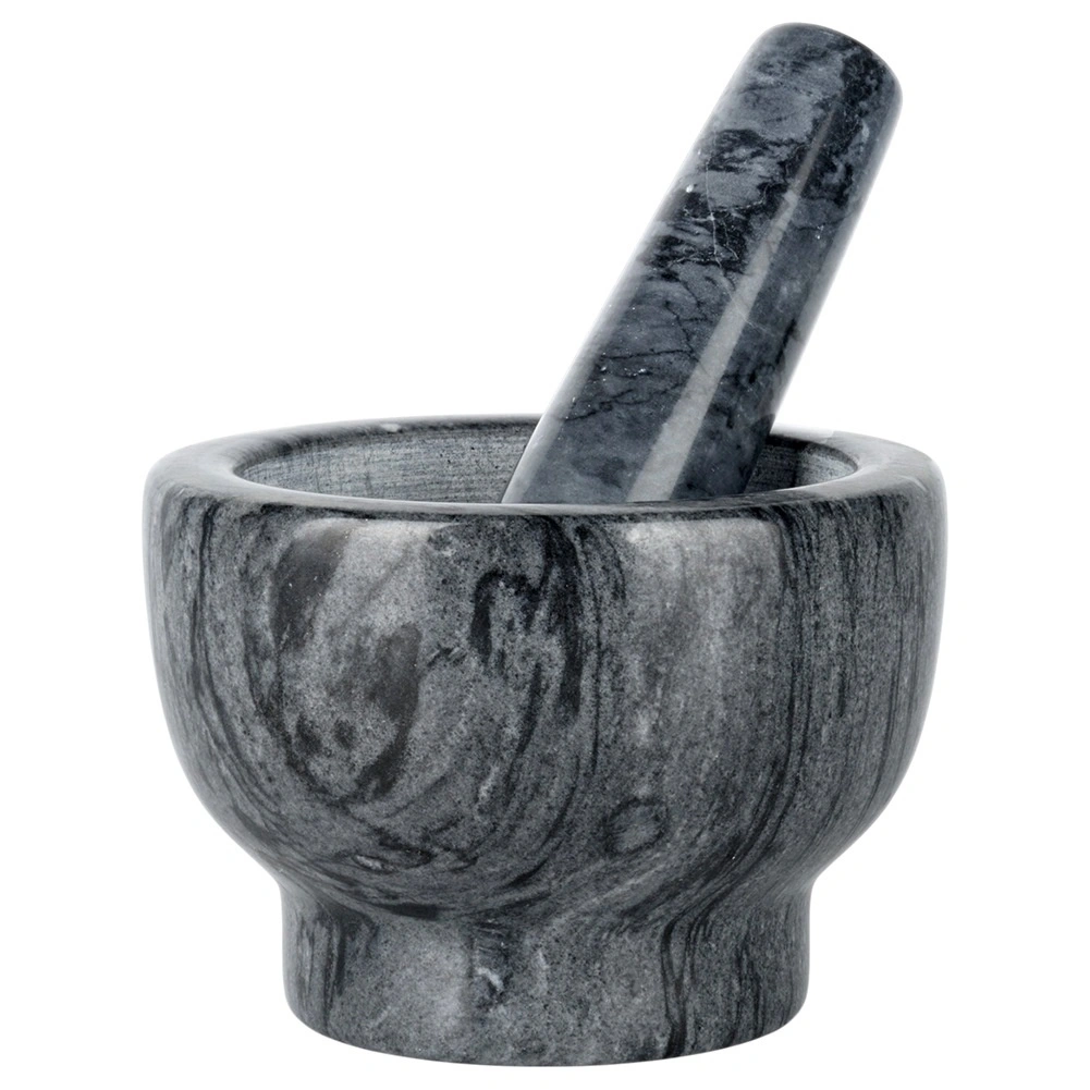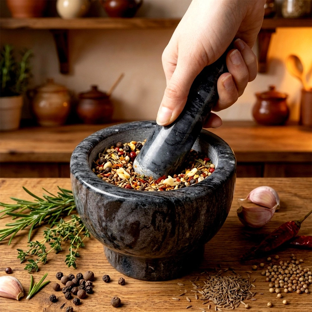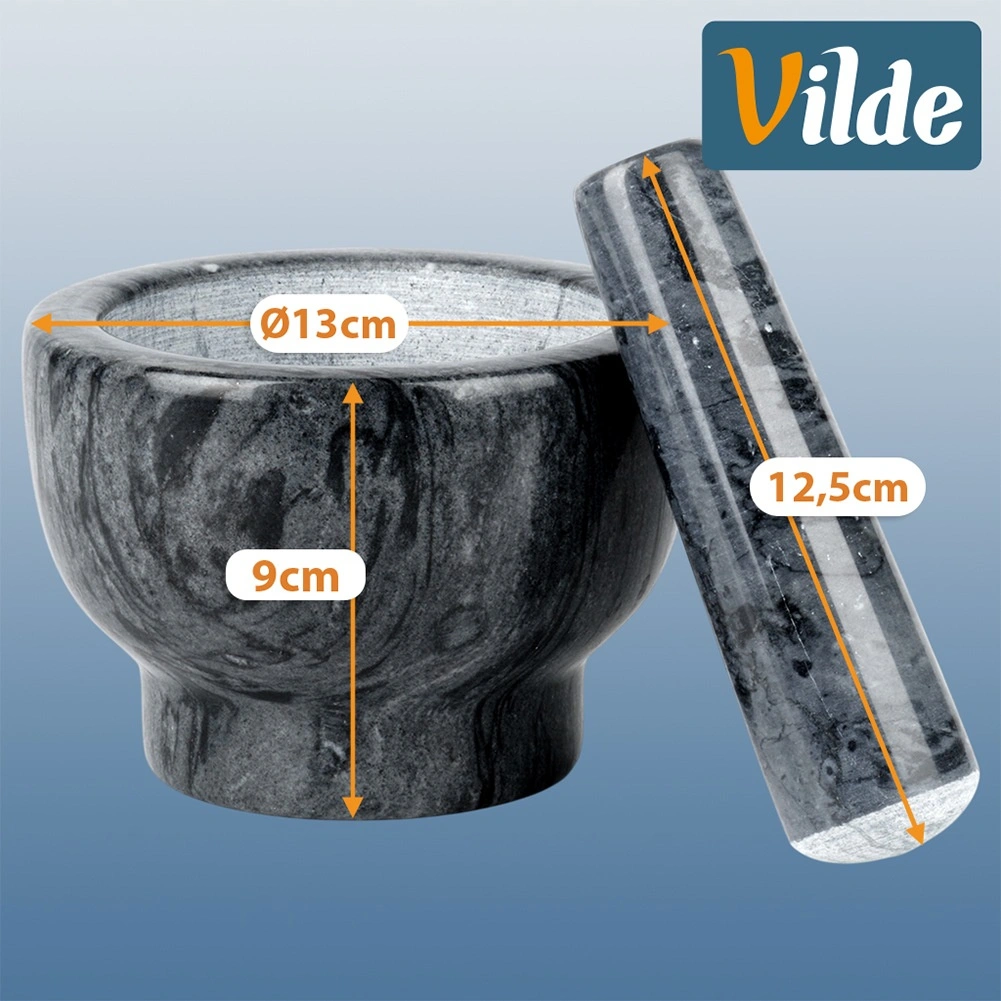 Dzięki masywnej, ciężkiej konstrukcji moździerz jest stabilny i nie ślizga się podczas pracy. Łatwy w czyszczeniu – wystarczy opłukać wodą i wysuszyć. Kamień jest trwały i nie pochłania zapachów, więc pozostaje higieniczny i długotrwale estetyczny. Każdy egzemplarz jest unikatowy, może różnić się rysunkiem i odcieniem.