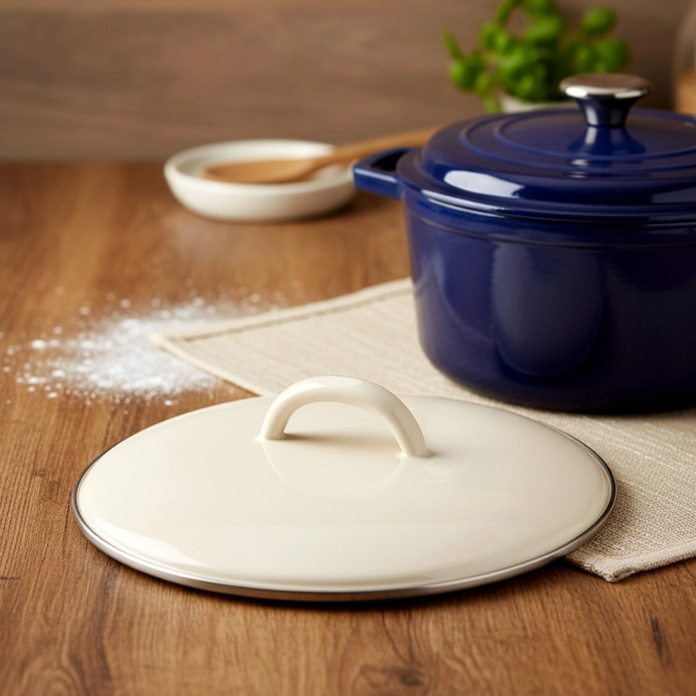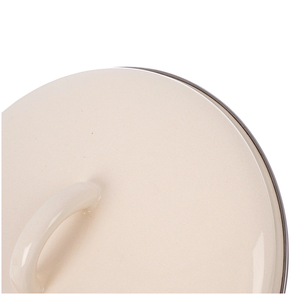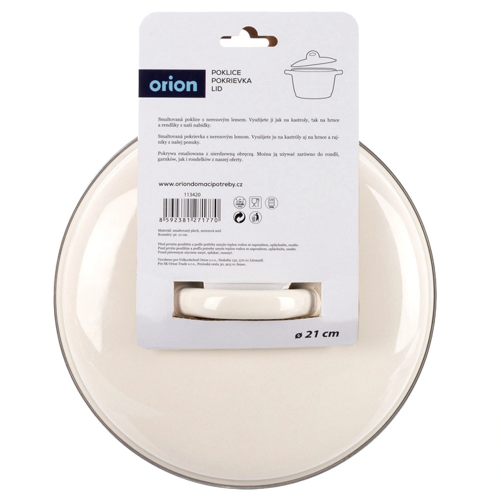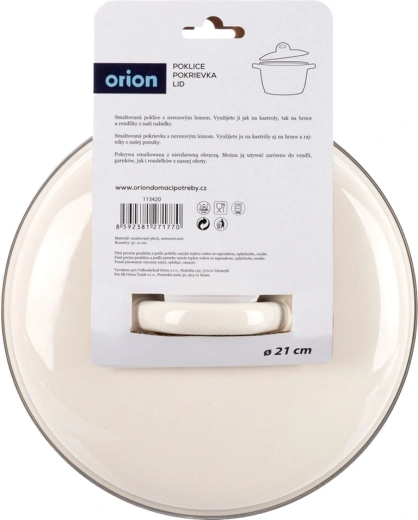 Uniwersalna emaliowana pokrywka o średnicy 21 cm do garnków, patelni i rondli w eleganckim kremowym kolorze ze stabilnym uchwytem i stalową krawędzią. Świetnie utrzymuje ciepło, skraca czas gotowania i oszczędza energię. Można myć w zmywarce i używać w piekarniku.