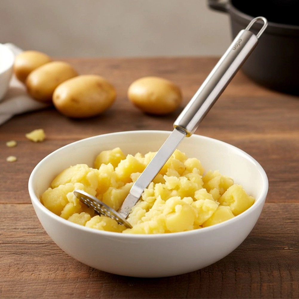 Ciesz się łatwym i szybkim przygotowaniem domowego ziemniaczanego purée, warzywnych przecierów czy owocowych musów. To tłuczko z wysokiej jakości stali nierdzewnej oferuje świetną wytrzymałość, długą żywotność i higieniczną pielęgnację. Ergonomiczna rączka wygodnie leży w dłoni i zapewnia pewny chwyt podczas mieszania i tłoczenia.