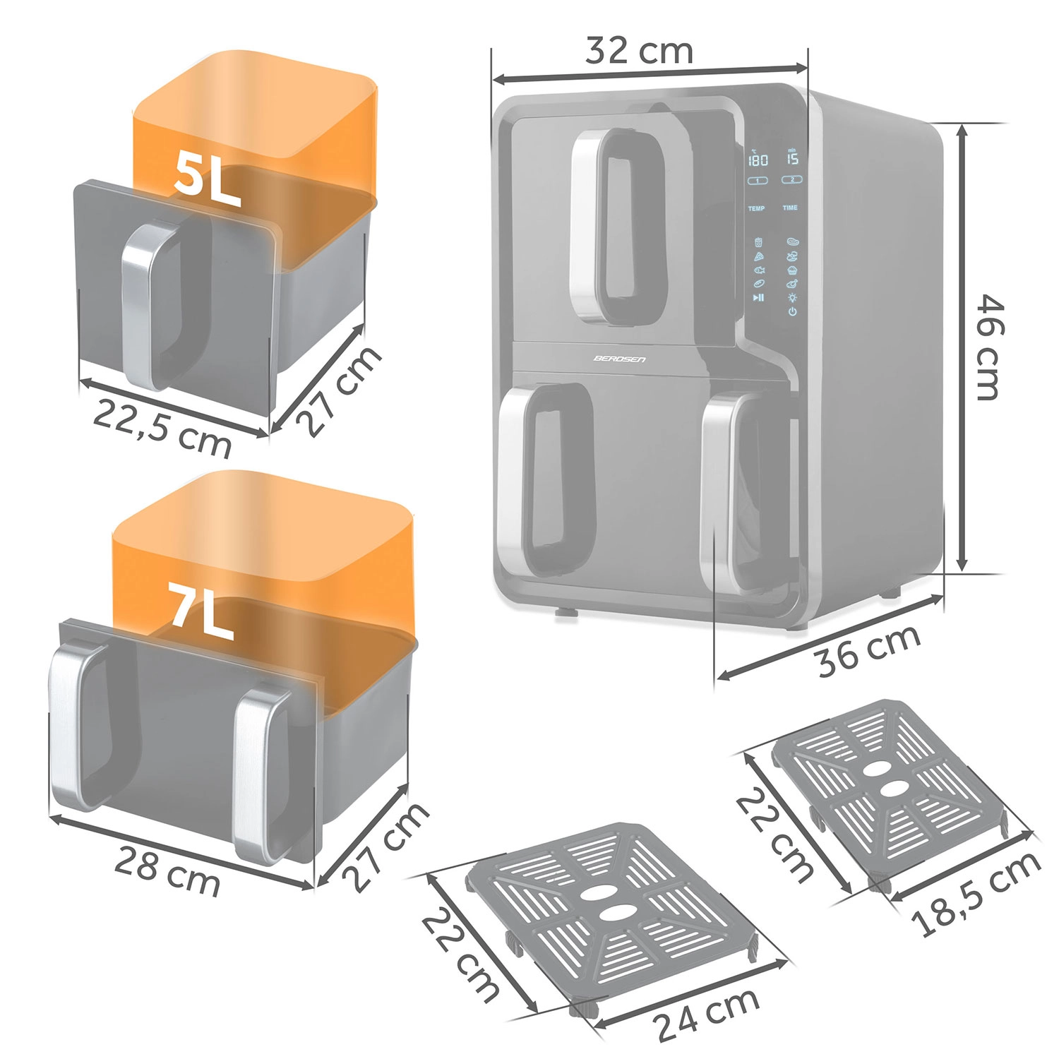 BERDSEN BD-664 zastępuje wiele urządzeń: potrafi frytkować gorącym powietrzem, piec, grillować, suszyć i podgrzewać. Nierdzewna tacka/kratka ze stali 304 z powłoką nieprzywierającą PTFE oraz kosze nadają się do mycia w zmywarce. Wysoka moc 2800 W zapewnia szybkie nagrzewanie i oszczędność czasu podczas codziennego gotowania.