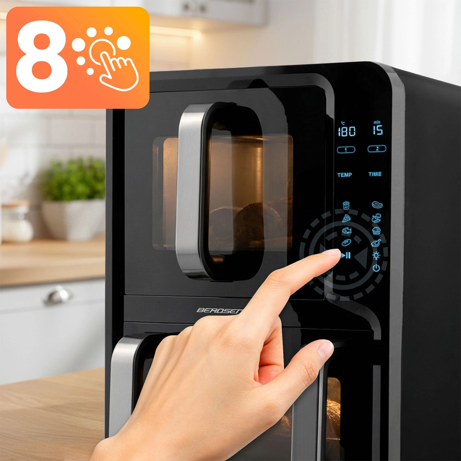 Przejrzysty panel z ikonami, 8 programów oraz możliwość ręcznego ustawienia 80–200 °C. Okienko z oświetleniem LED umożliwia kontrolę bez otwierania.
