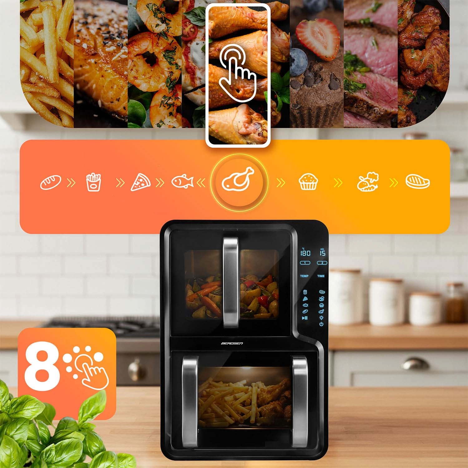 Dzięki 8 zaprogramowanym trybom (frytki, ryby, kurczak, warzywa, stek, ciasto, pizza, pieczywo) oraz przejrzystemu sterowaniu dotykowemu gotowanie to kwestia kilku kliknięć. Podświetlenie LED i przezroczyste okienka umożliwiają podgląd potrawy bez przerywania pieczenia. Nie brakuje automatycznego wyłączania, zabezpieczenia przed przegrzaniem ani przypomnienia o mieszaniu (TURN) dla równomiernych efektów.