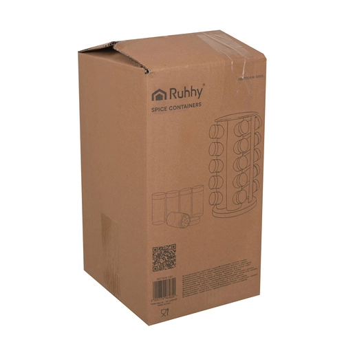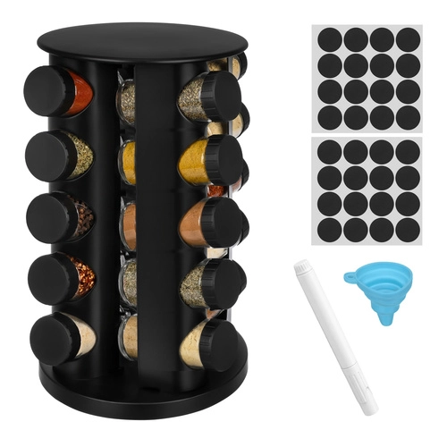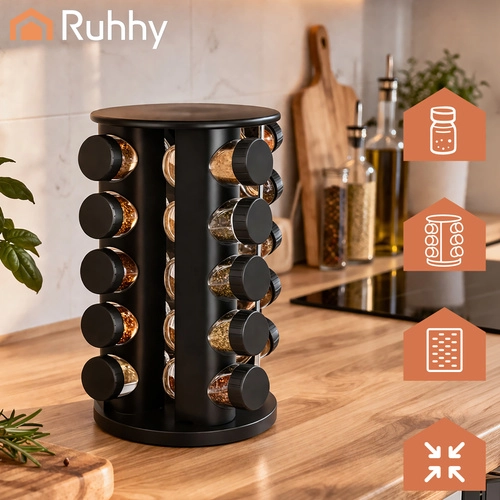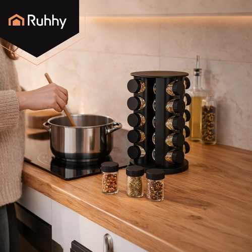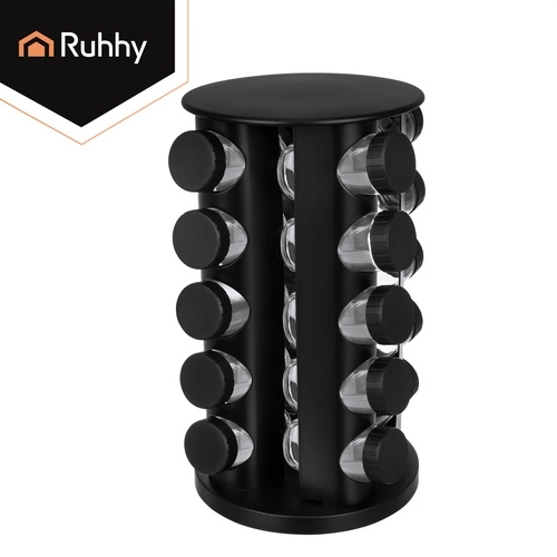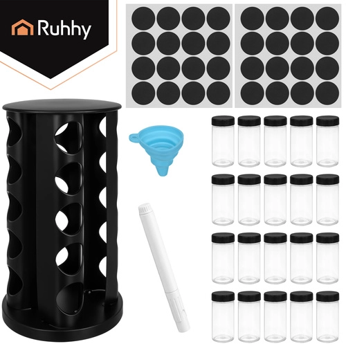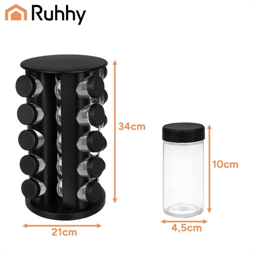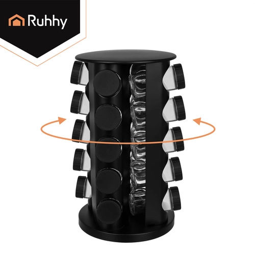 Urządź kuchnię sprytnie i elegancko. Kompletny zestaw przypraw RUHHY oferuje 20 szklanych słoiczków o pojemności 90 ml w stabilnym obrotowym karuzelu, który oszczędza miejsce i zapewnia szybki dostęp do każdej przyprawy. Nowoczesny czarny design pasuje do każdej kuchni i zmienia przyprawy w stylową dekorację.