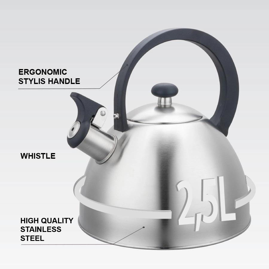 Praktyczny i elegancki czajnik MAESTRO z wysokiej jakości stali nierdzewnej z gwizdkiem i pojemnością 2,5 l do wygodnego gotowania wody dla całej rodziny. Dzięki wielowarstwowemu dnu kapsułowemu nagrzewa się szybko i równomiernie, a także nadaje się do wszystkich typów kuchenek, w tym indukcji. Zdejmowana pokrywka ułatwia napełnianie i czyszczenie.
