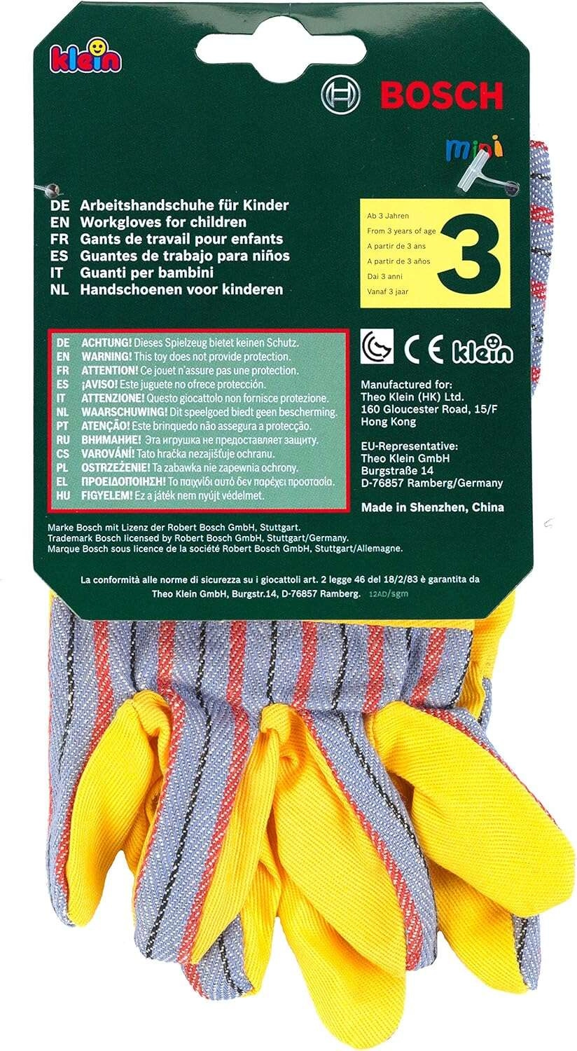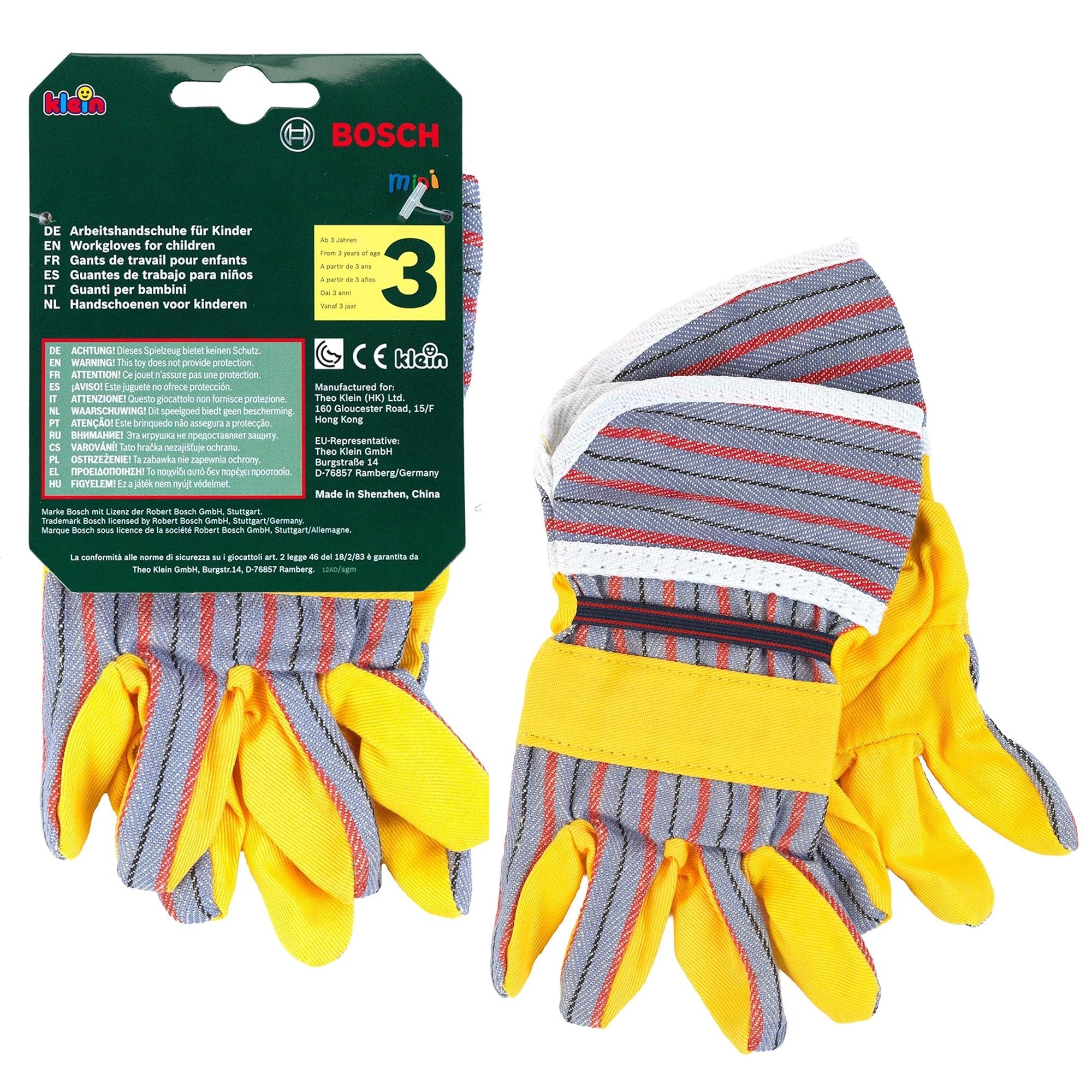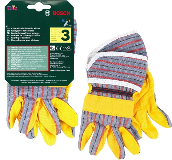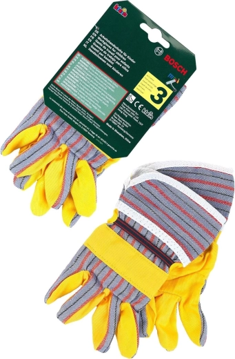 Dziecięce rękawice robocze BOSCH marki Klein to świetny dodatek dla małych majsterkowiczów. Wiernie naśladują prawdziwe rękawice, mają żółte dłonie z szarymi pasiastymi elementami, elastyczne mankiety dla lepszego trzymania i są idealne do zabawy w rzemieślników i ogrodników.