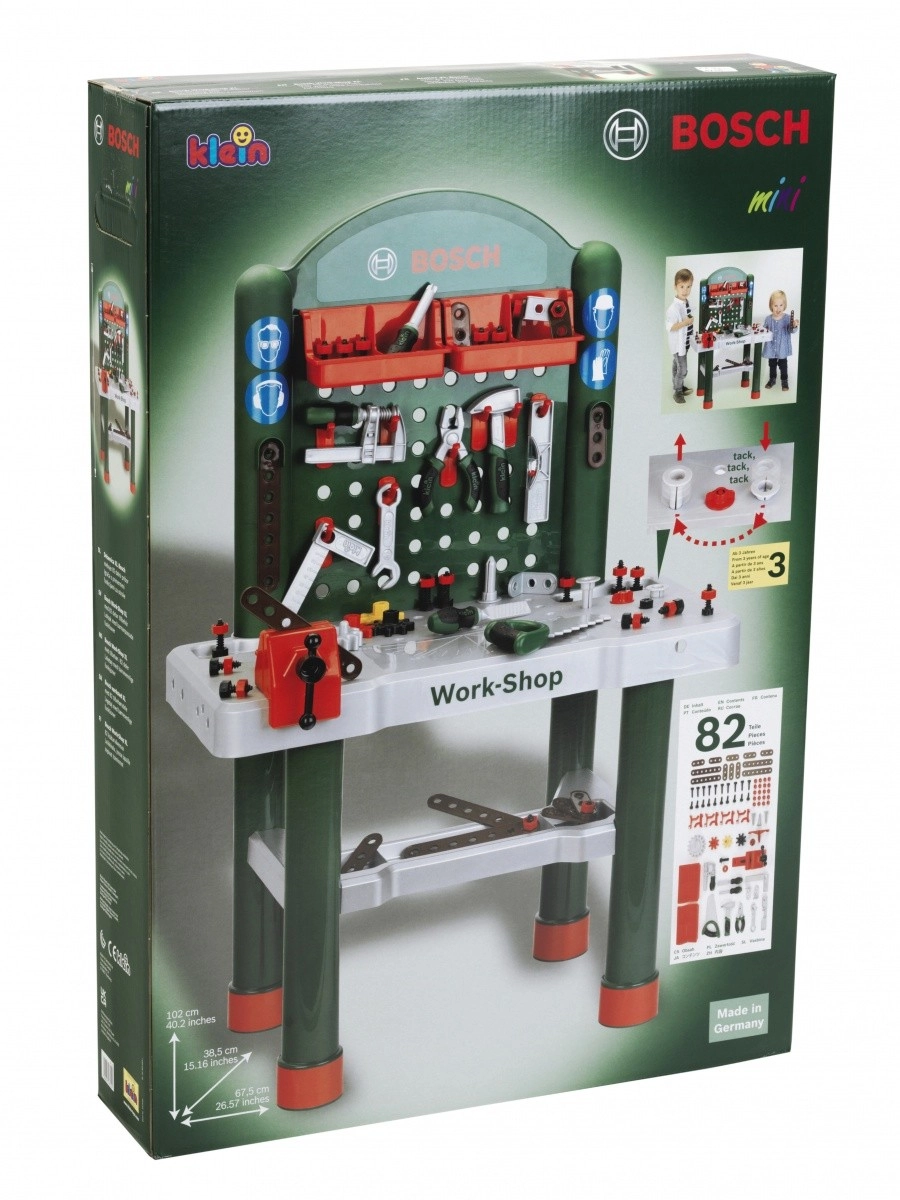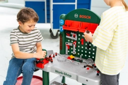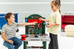 Ten w pełni wyposażony stół roboczy dla dzieci na licencji BOSCH zamieni pokój w mały warsztat. Przejrzyste przechowywanie zapewniają perforowana tylna ścianka z haczykami, półka pod blatem oraz 3 praktyczne pojemniki na drobiazgi. Nie brakuje także funkcjonalnego dziecięcego ścisku do pewnego mocowania elementów oraz stabilnej powierzchni roboczej.